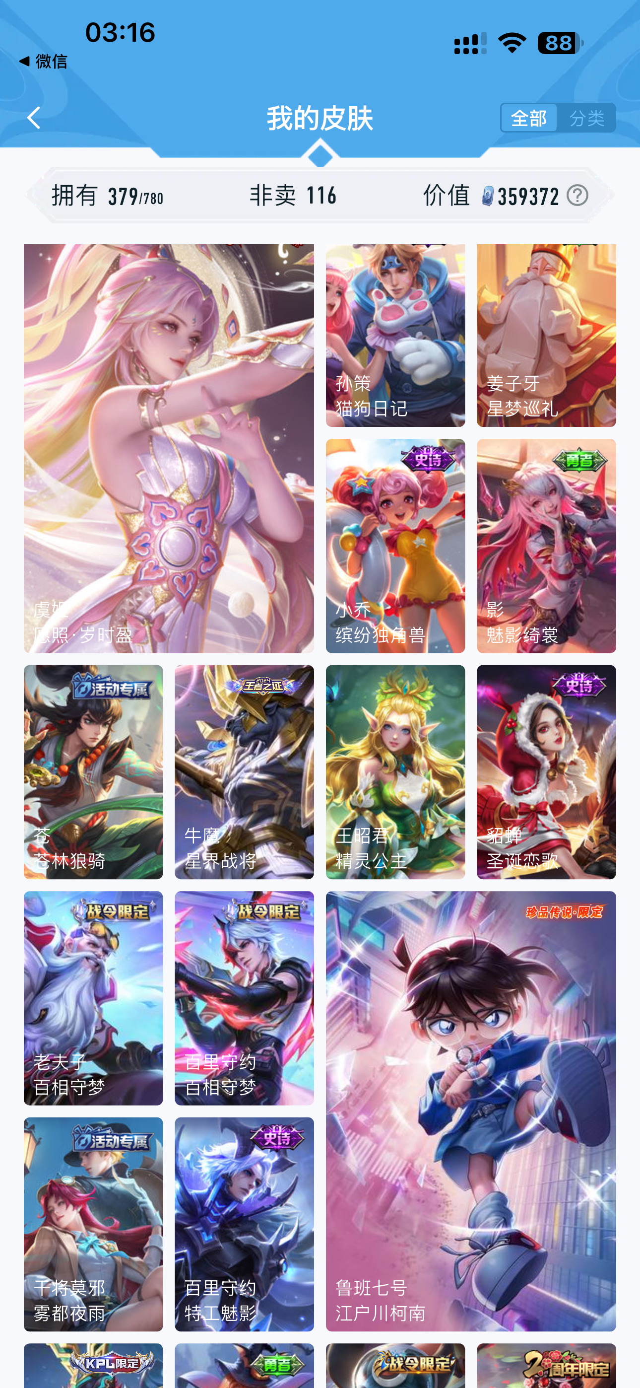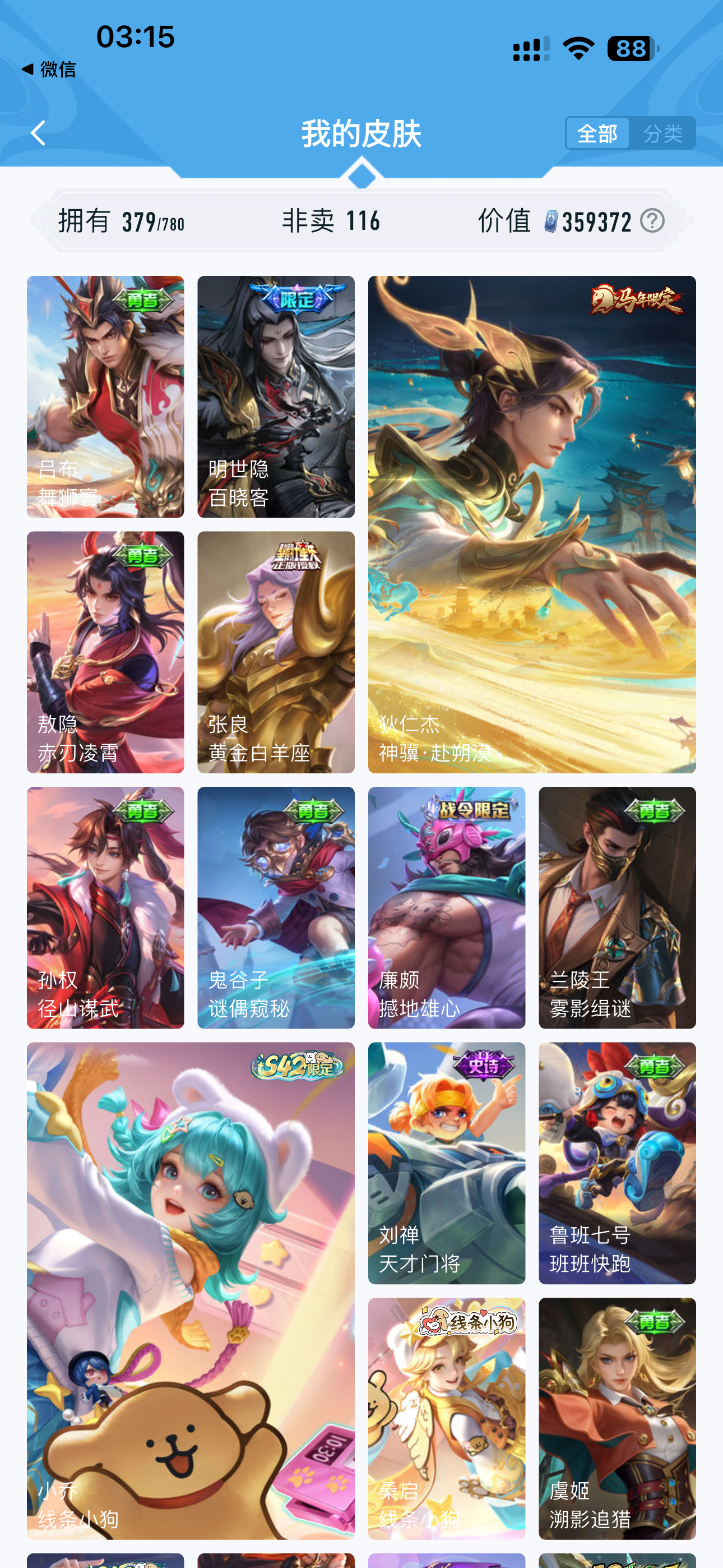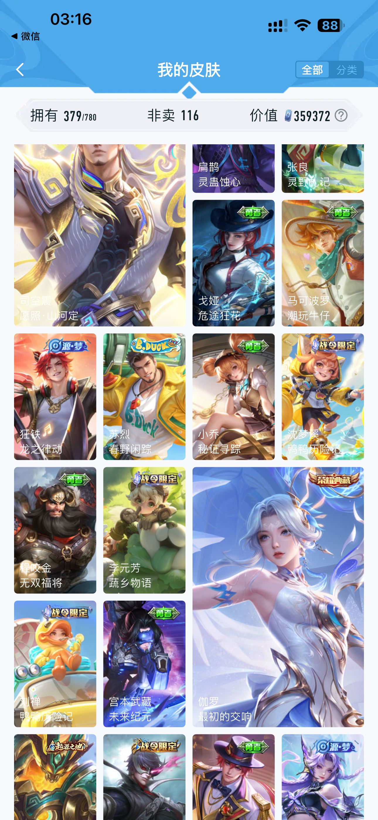 V10 皮肤379 至圣王者 荣耀典藏5 无双皮肤1 珍品传说1 星传说2 传说31 其他皮肤342