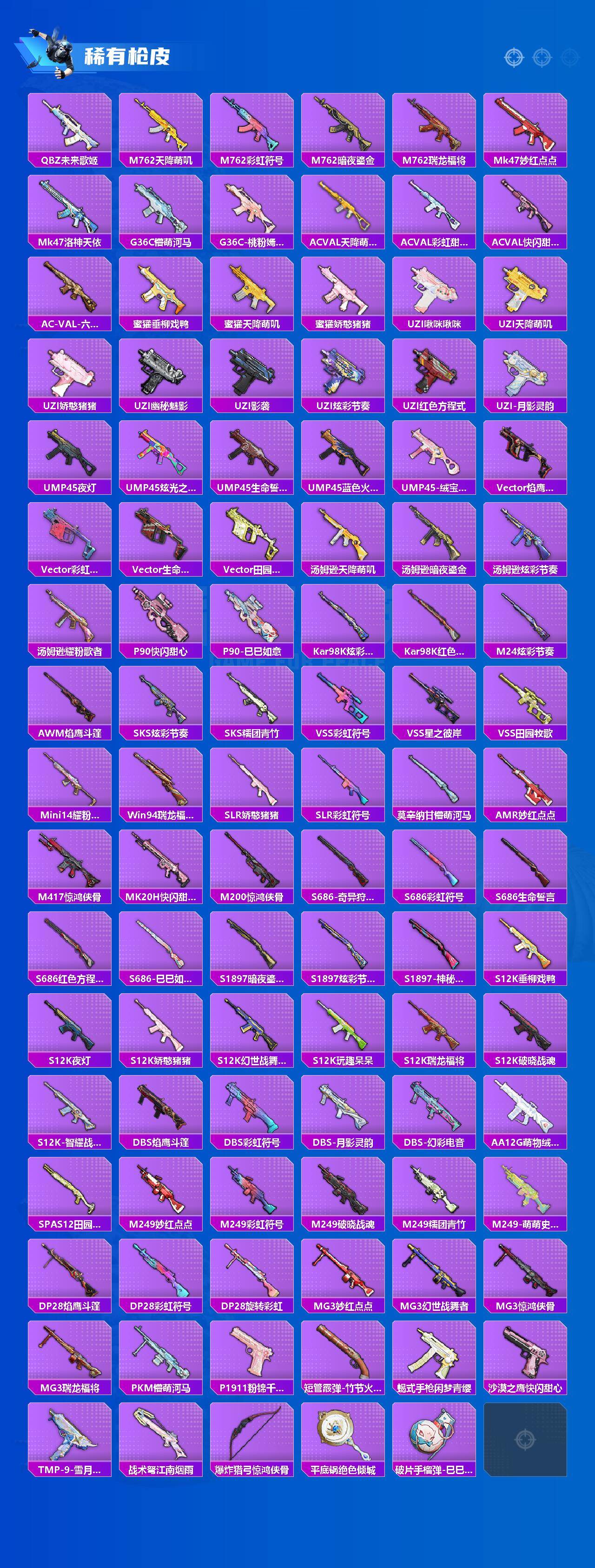 【粉色枪皮等级】:M416-电玩时刻(五级),GROZA-镜光银凌(五级),AUG-暖羊咩咩(五级),P90-能量