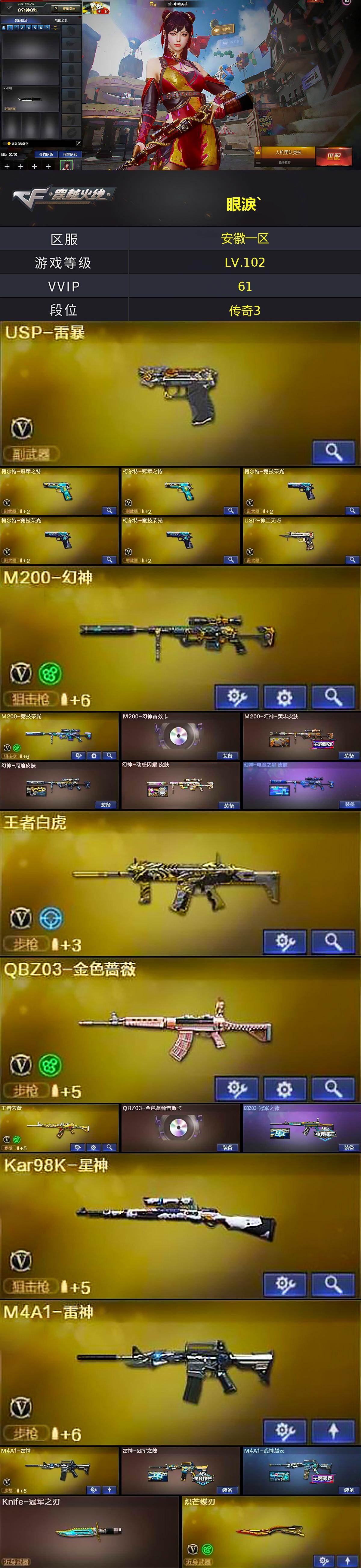 安徽一区-64V-3王者武器数-0炫金武器数【热门武器】:QBZ03-金色蔷