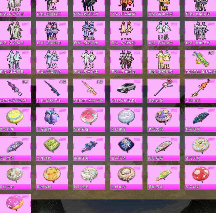 苹果 手Q-23粉装-5特效枪-1载具-2粉色飞行器-56467热力值-4王牌印记-132套装-136枪皮