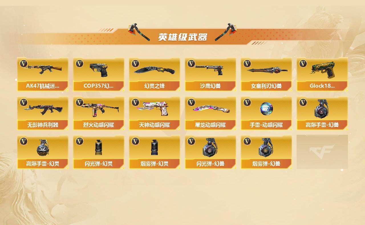 【热门武器】:M4A1-青龙,死亡之眼,M4A1-黑骑士*4,汤姆逊-烈龙*4,加特林-炼狱*6,COP 357-幻灵,沙鹰-修罗*6,高爆手雷-幻兽