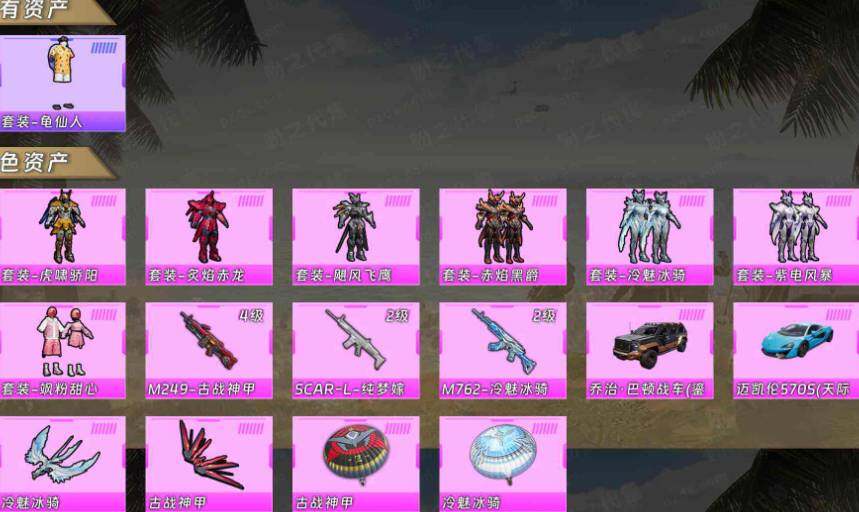 苹果 手Q-7粉装-3特效枪-2载具-2粉色飞行器-10752热力值-1王牌印记-23套装-23枪皮