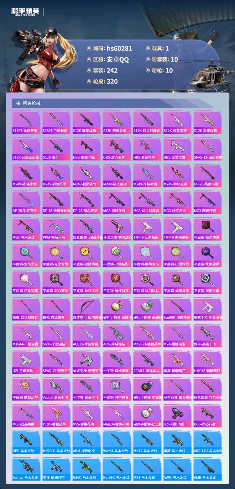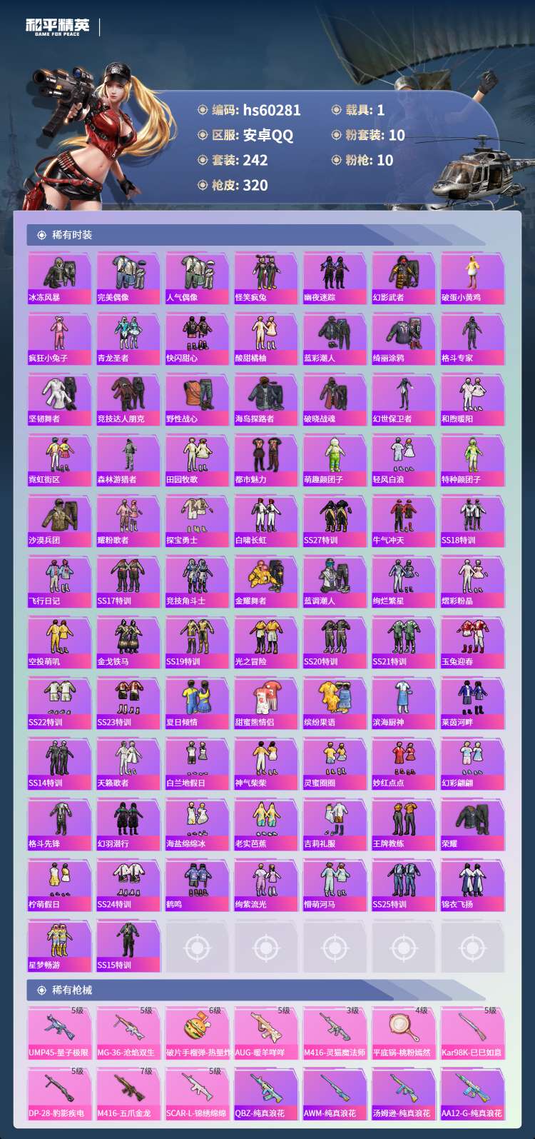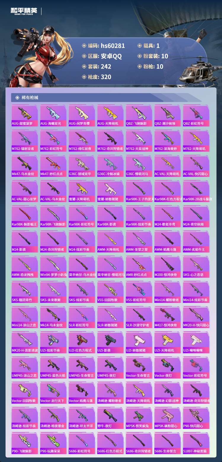 hs60281 安卓手Q-19王牌印记-10粉装-10特效枪-1载具-102062热力值-242套装