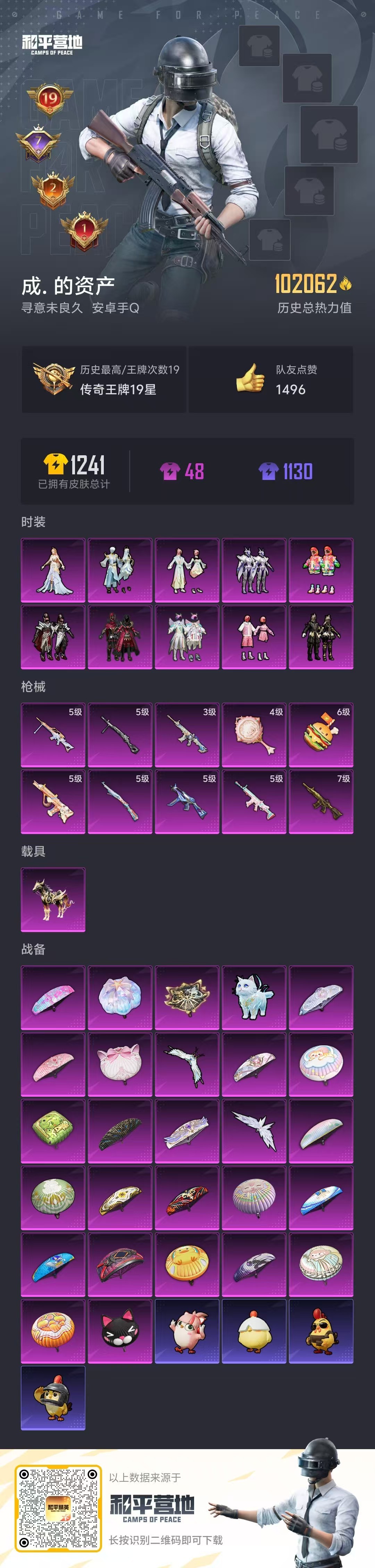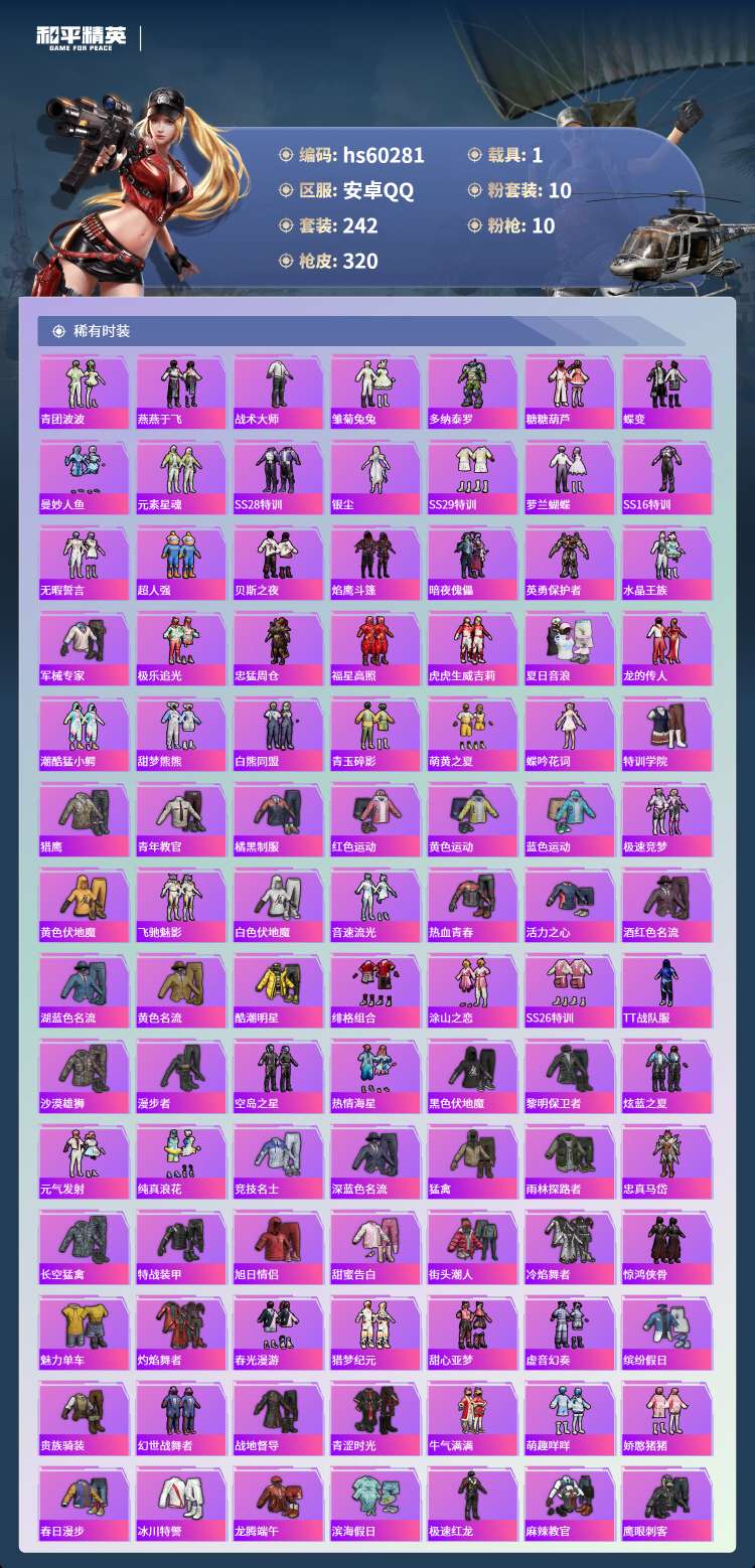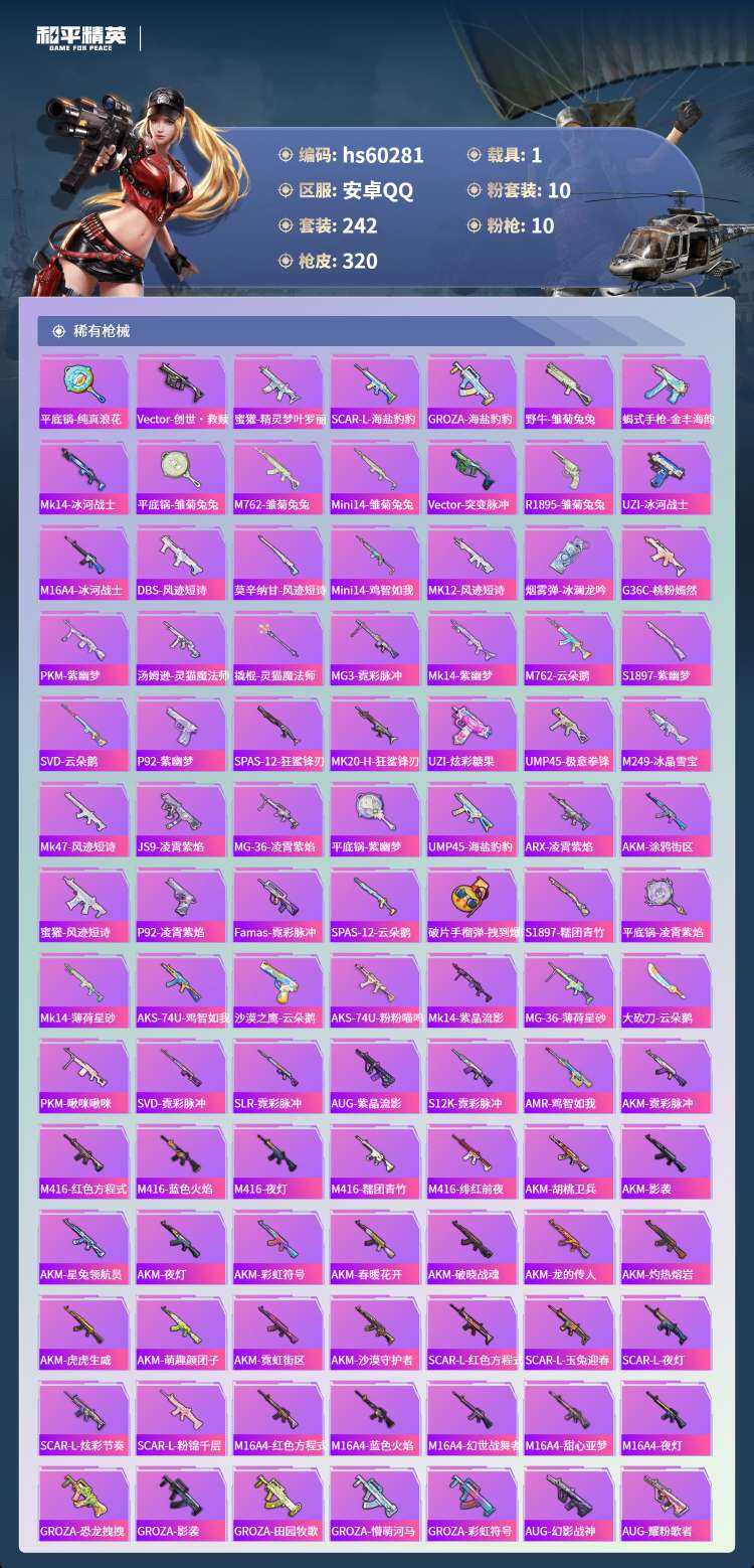 hs60281 安卓手Q-19王牌印记-10粉装-10特效枪-1载具-102062热力值-242套装