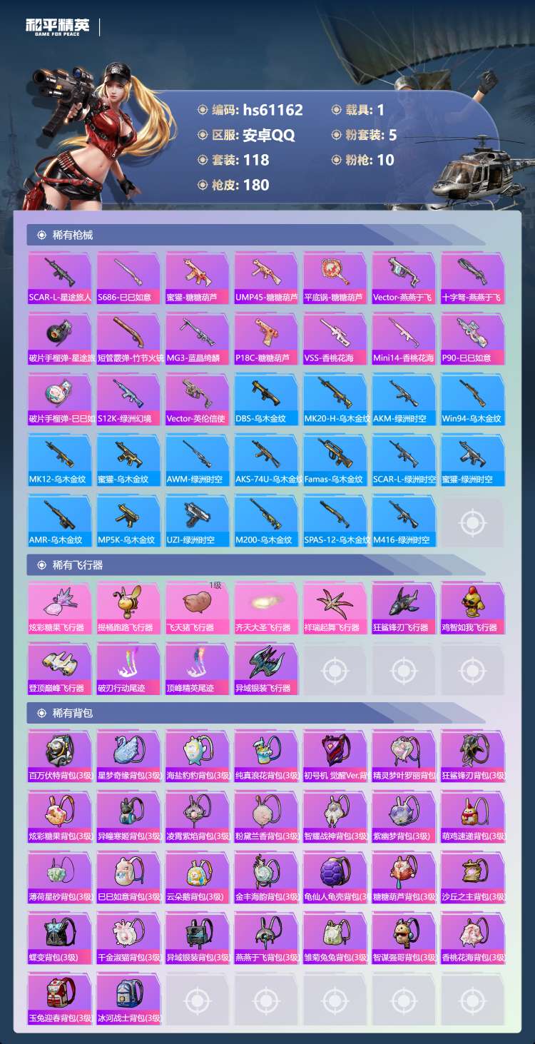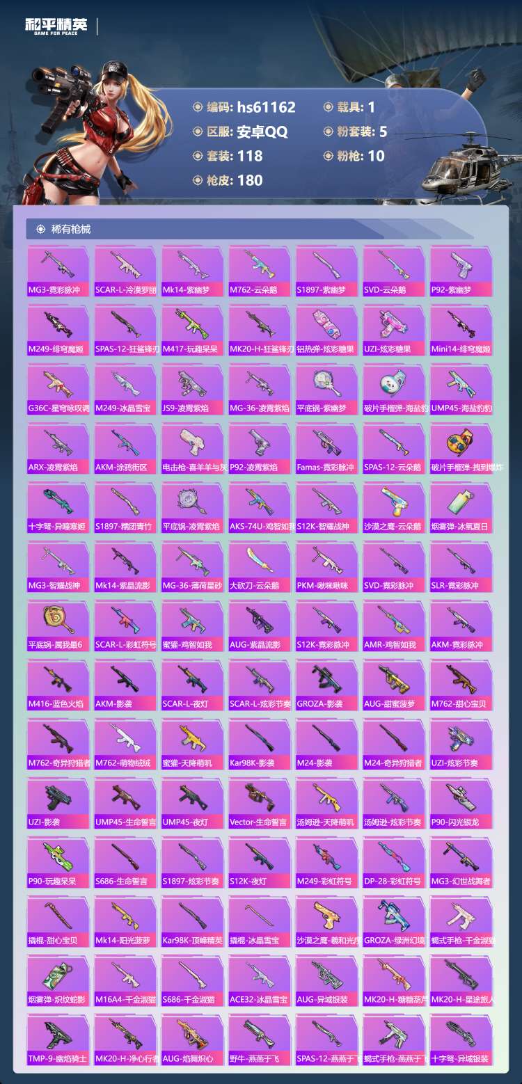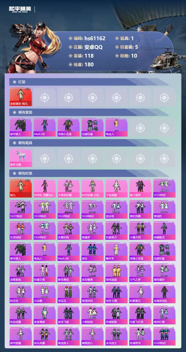 hs61162 安卓手Q-9王牌印记-1红装-5粉装-10特效枪-1载具-56111热力值-118套