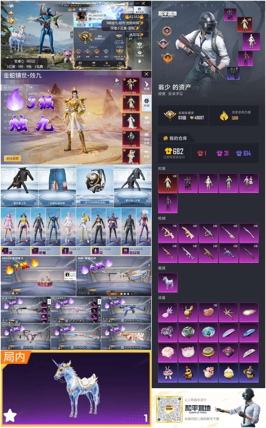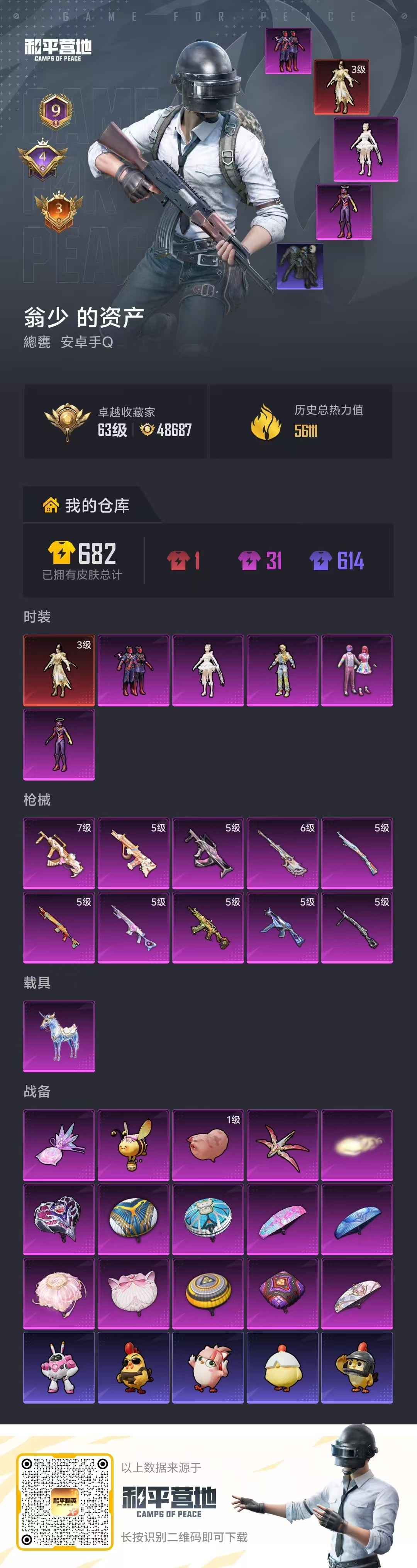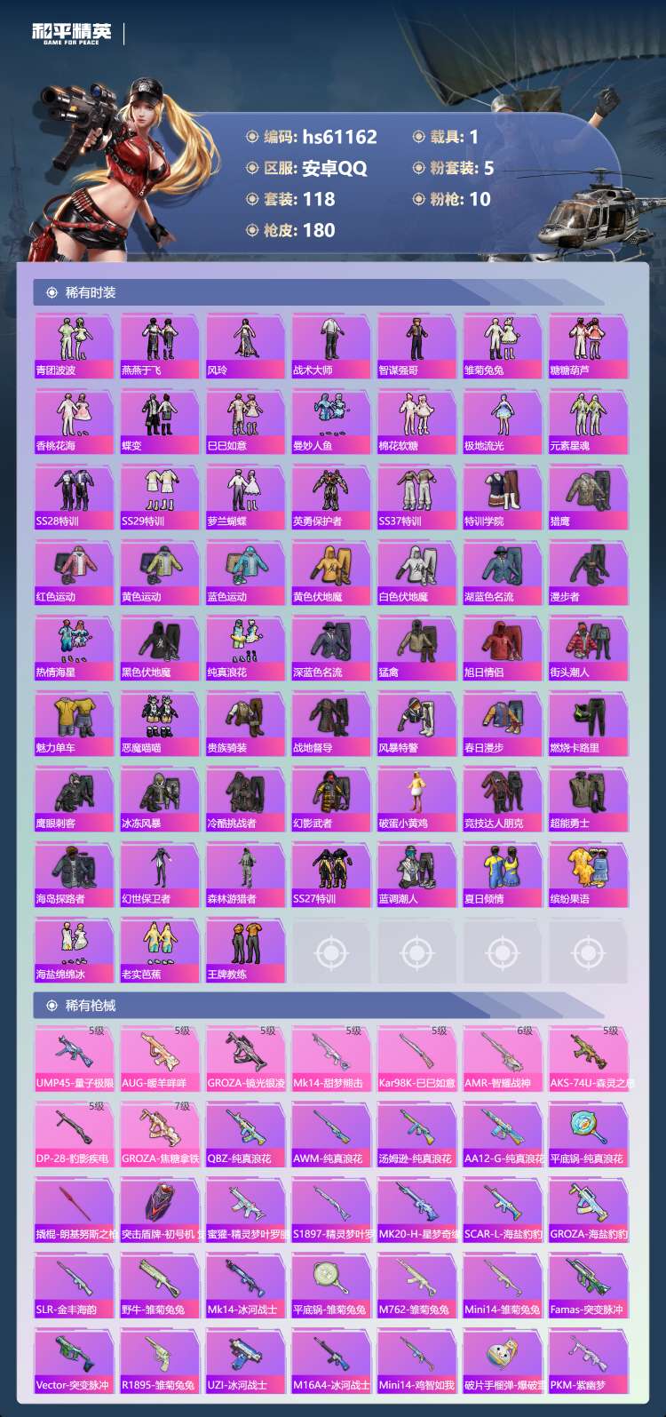 hs61162 安卓手Q-9王牌印记-1红装-5粉装-10特效枪-1载具-56111热力值-118套