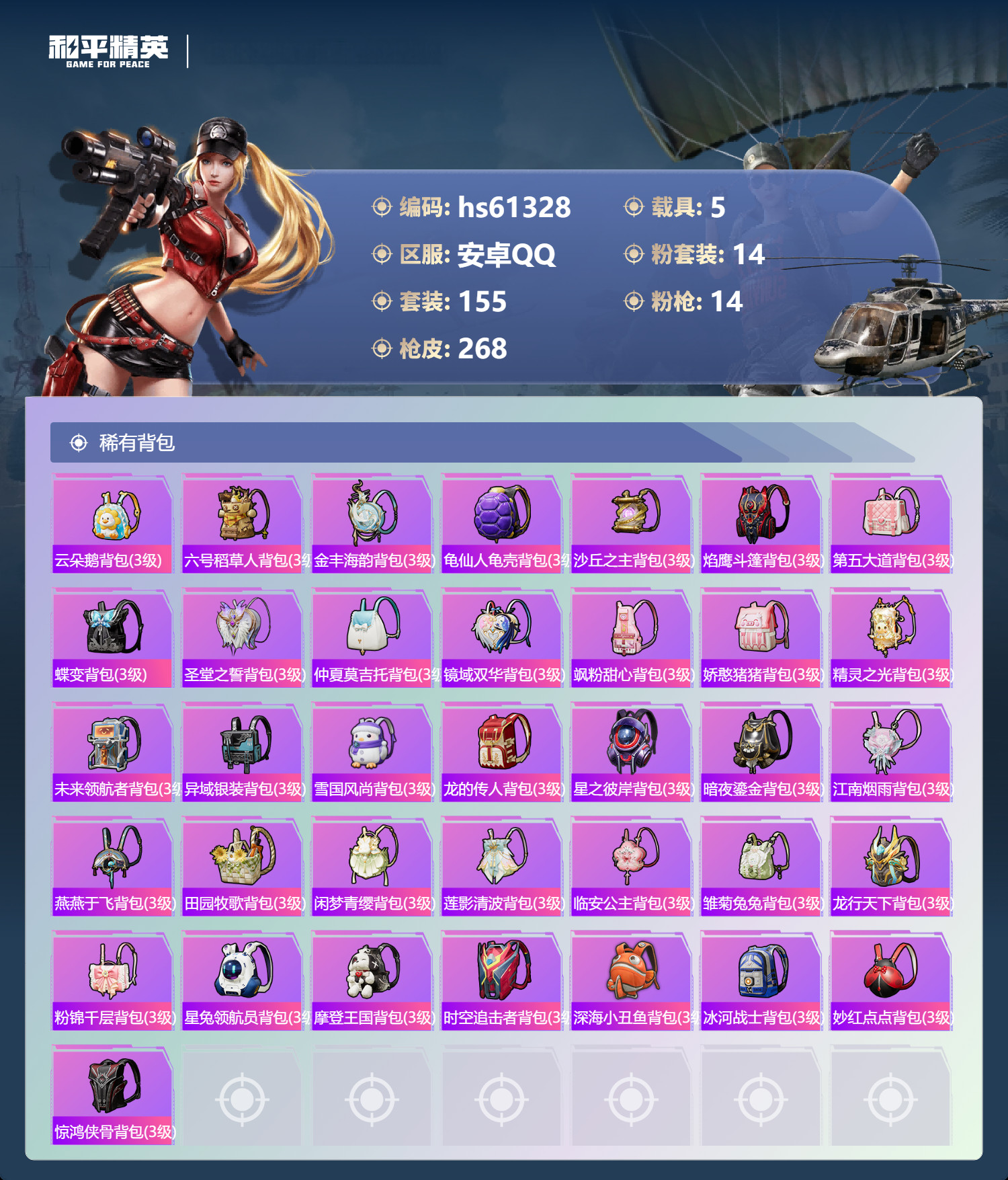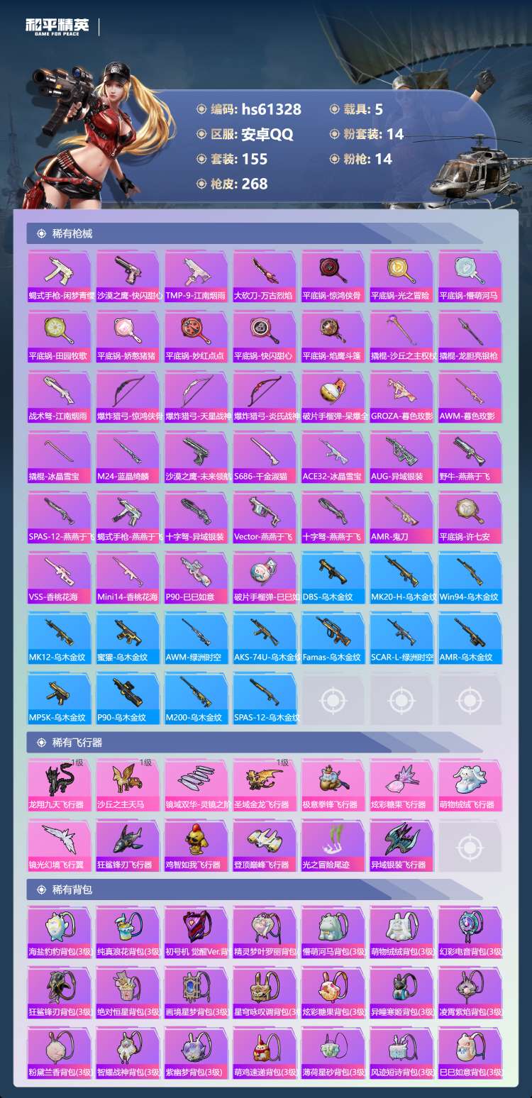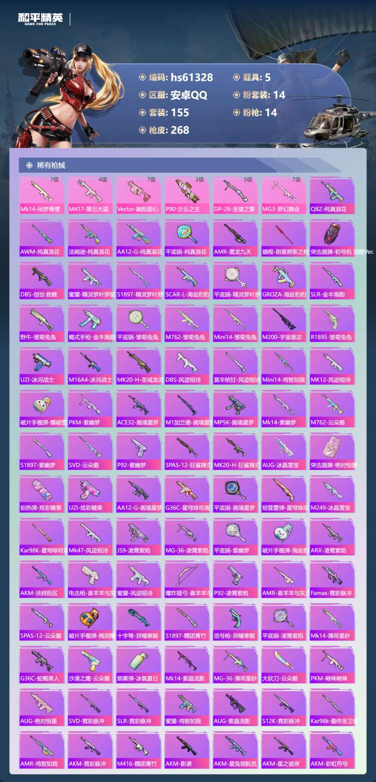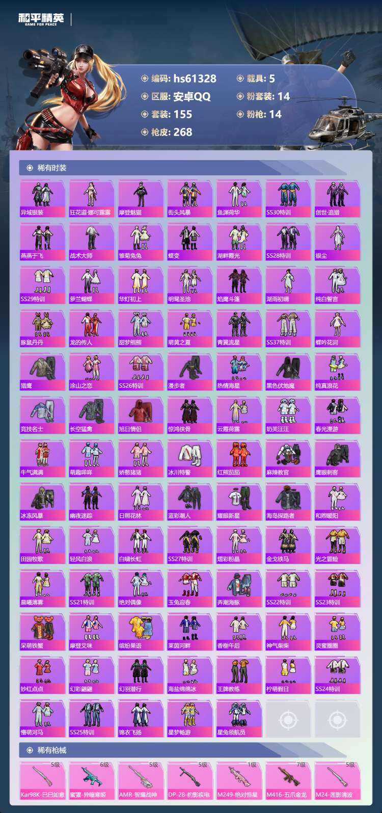 hs61328 安卓手Q-9王牌印记-14粉装-14特效枪-5载具-91660热力值-155套装-2