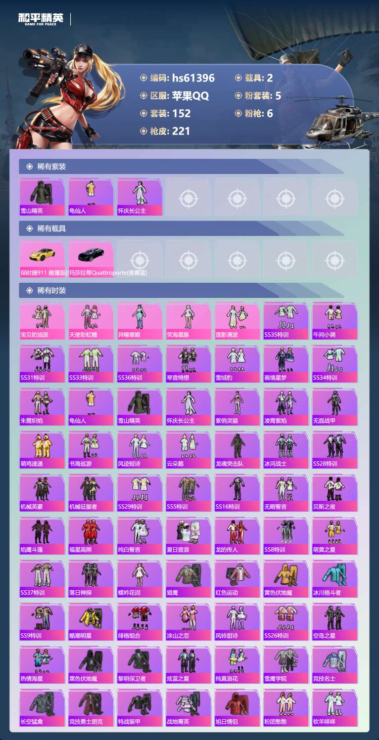 hs61396 苹果手Q-18王牌印记-5粉装-6特效枪-2载具-71571热力值-152套装-22