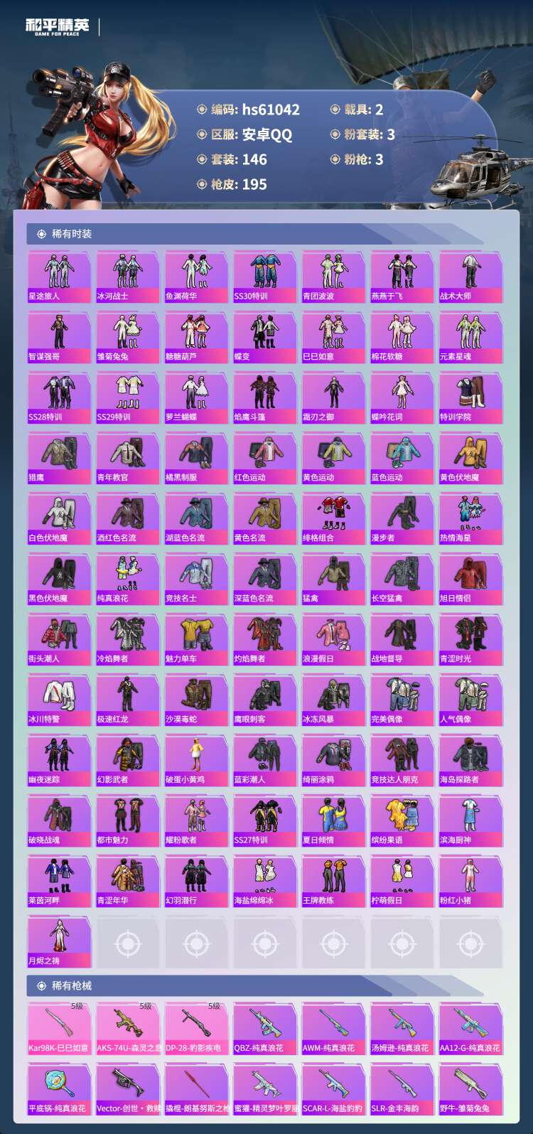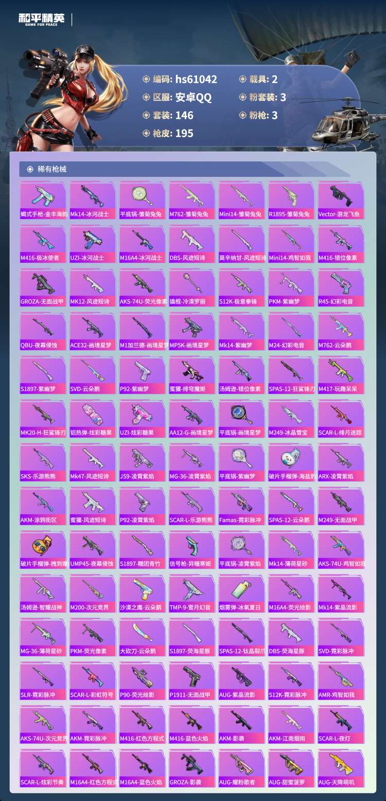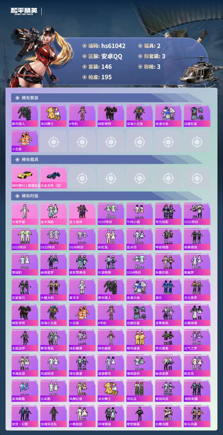 hs61042 安卓手Q-9王牌印记-3粉装-3特效枪-2载具-52185热力值-146套装-195