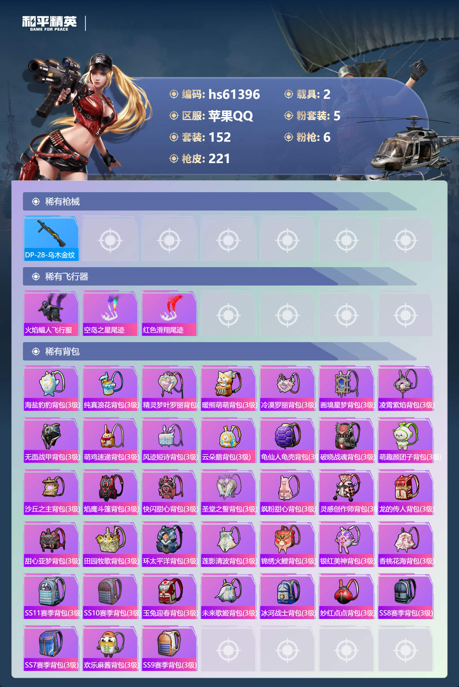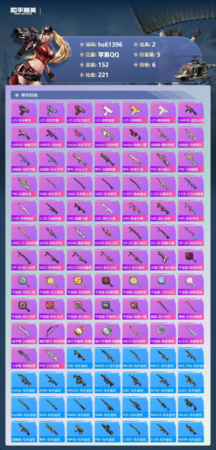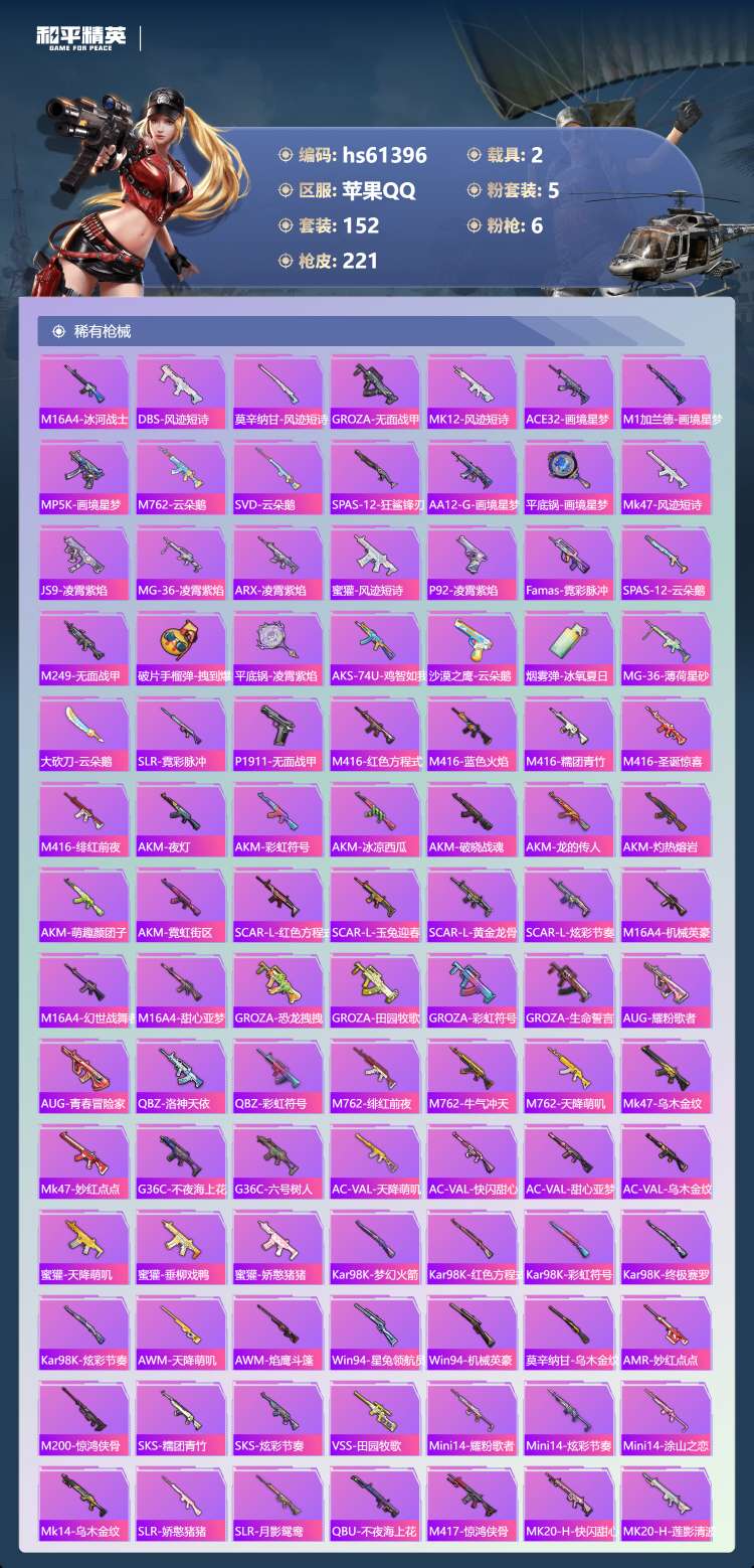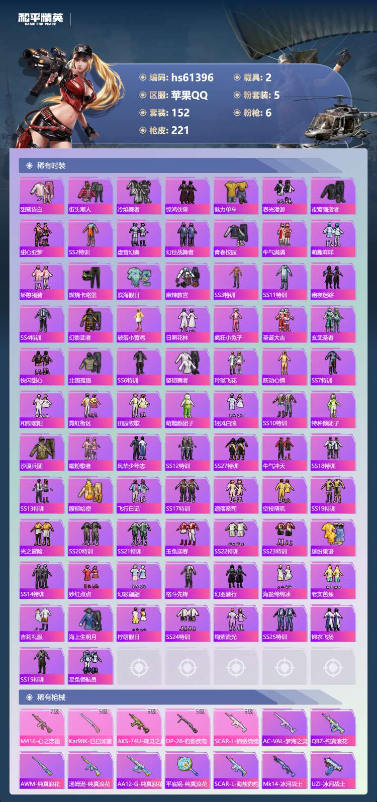 hs61396 苹果手Q-18王牌印记-5粉装-6特效枪-2载具-71571热力值-152套装-22