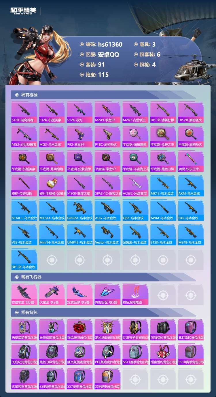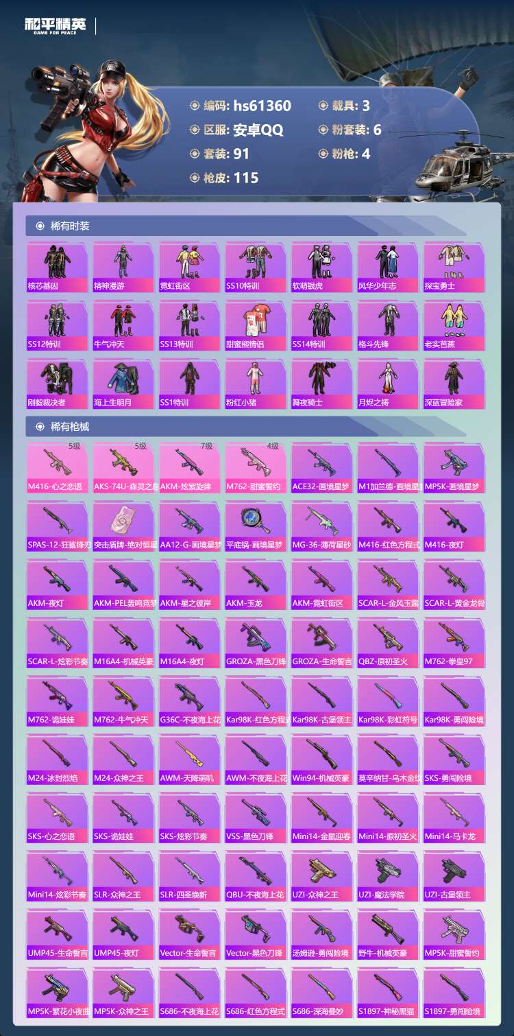 hs61360 安卓手Q-7王牌印记-6粉装-4特效枪-3载具-43217热力值-91套装-115枪