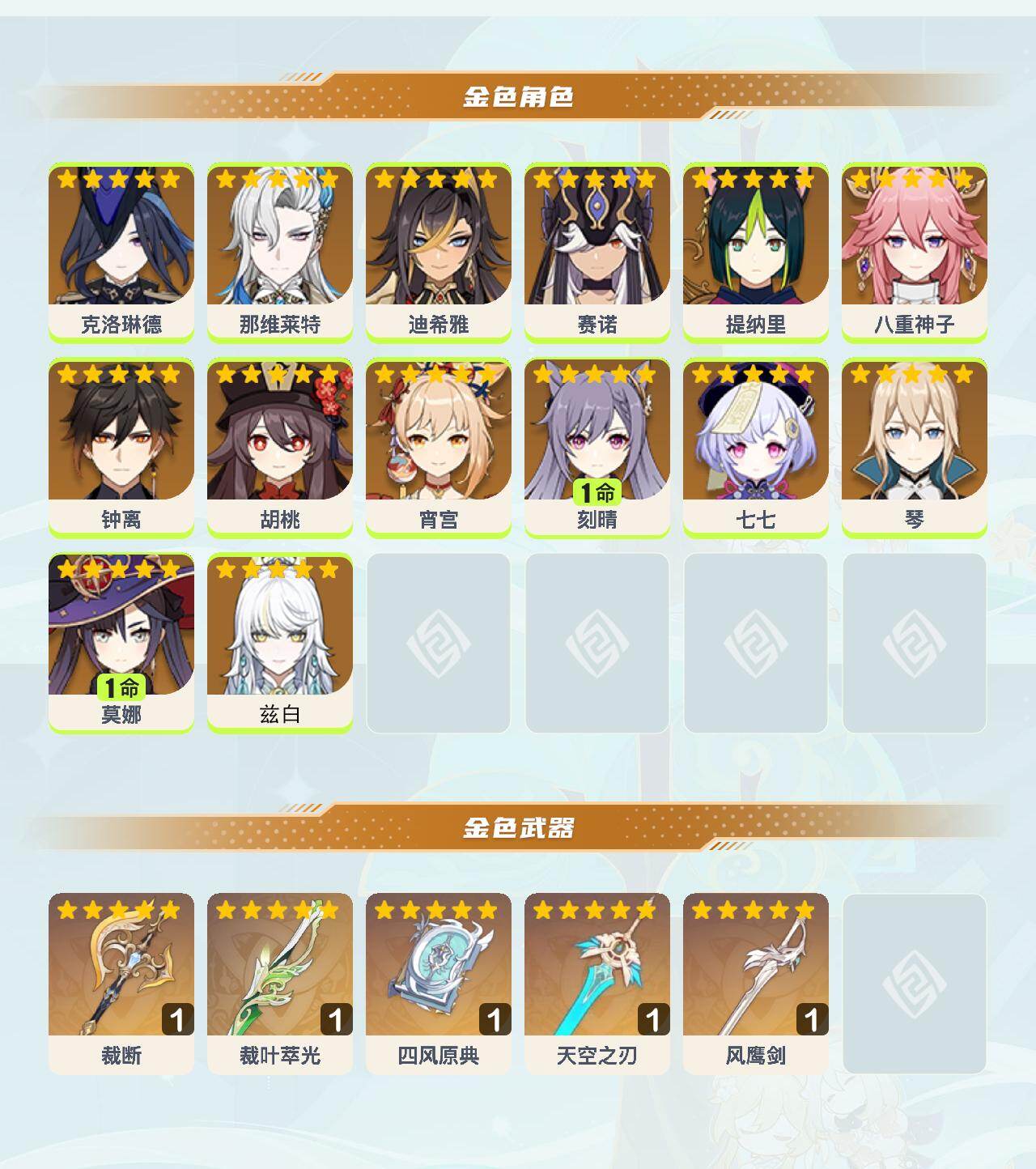 【YSF1618】56级/21黄/女主/14个五星角色/5个五星武器/八重神子/胡桃/宵宫/克洛琳德/钟离/那维莱特/迪希雅/赛诺/1命莫娜/1命刻晴/0命兹白/琴/七七/提纳里/四风原典/裁断/裁叶萃光/天空之刃/风鹰剑