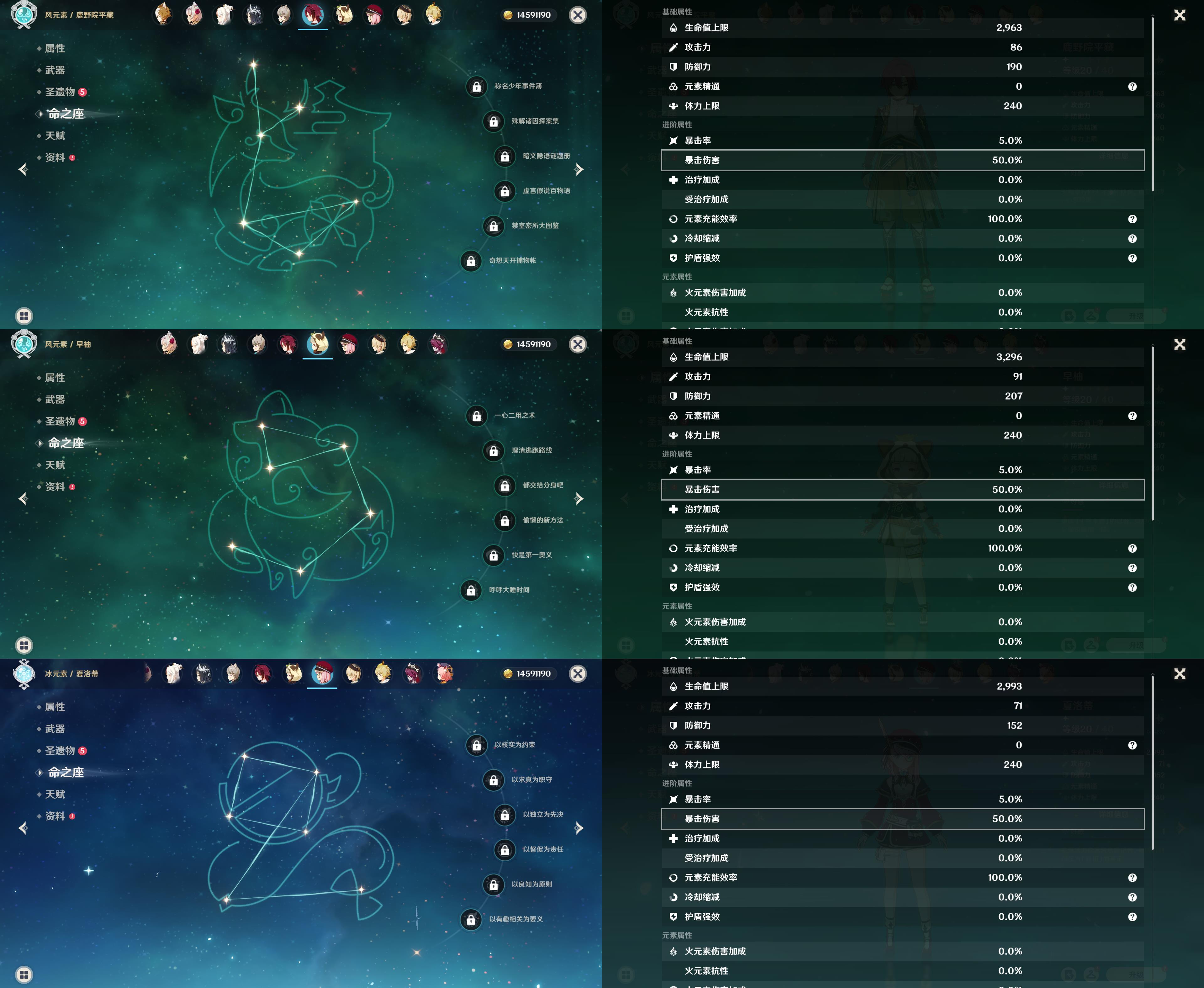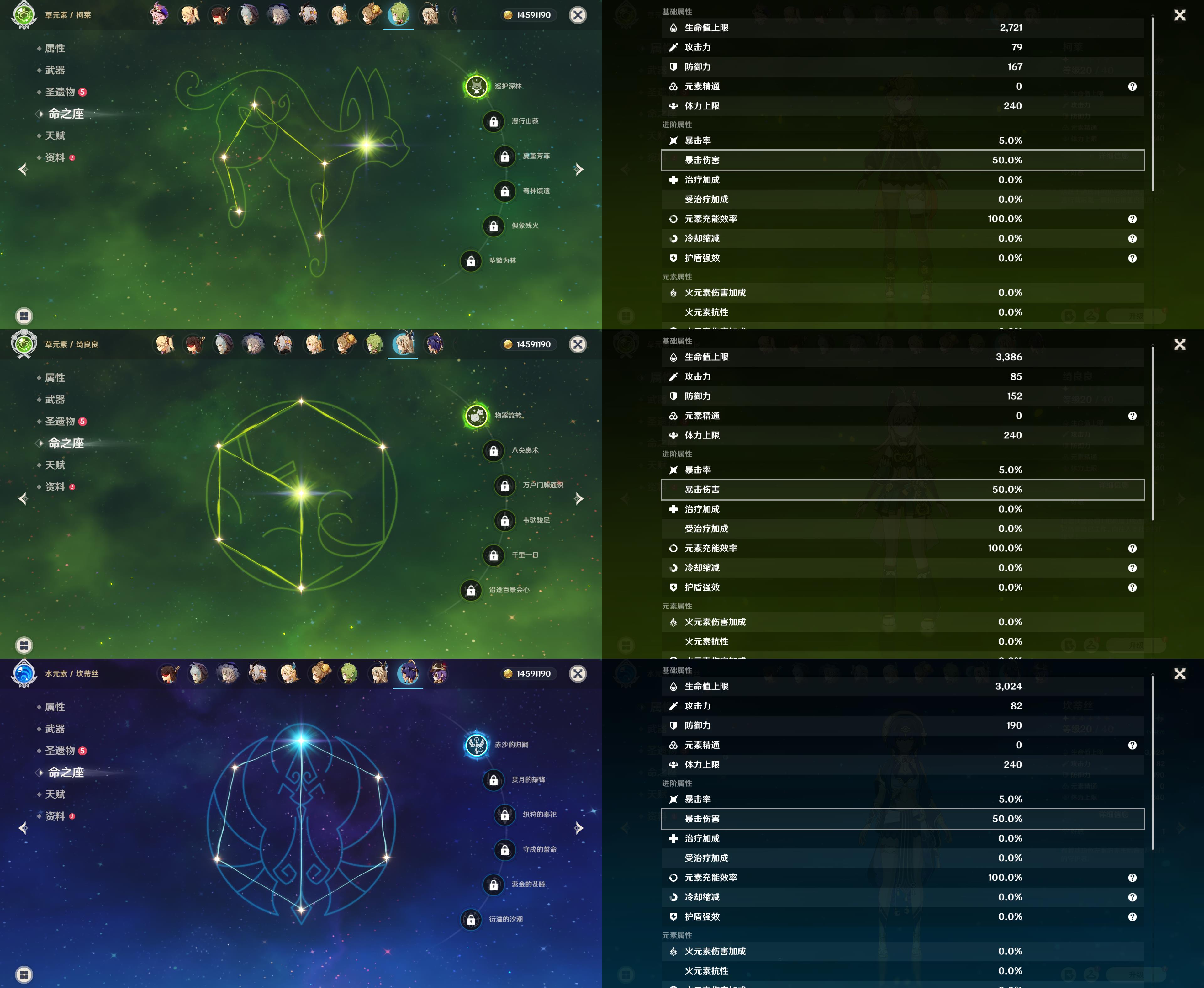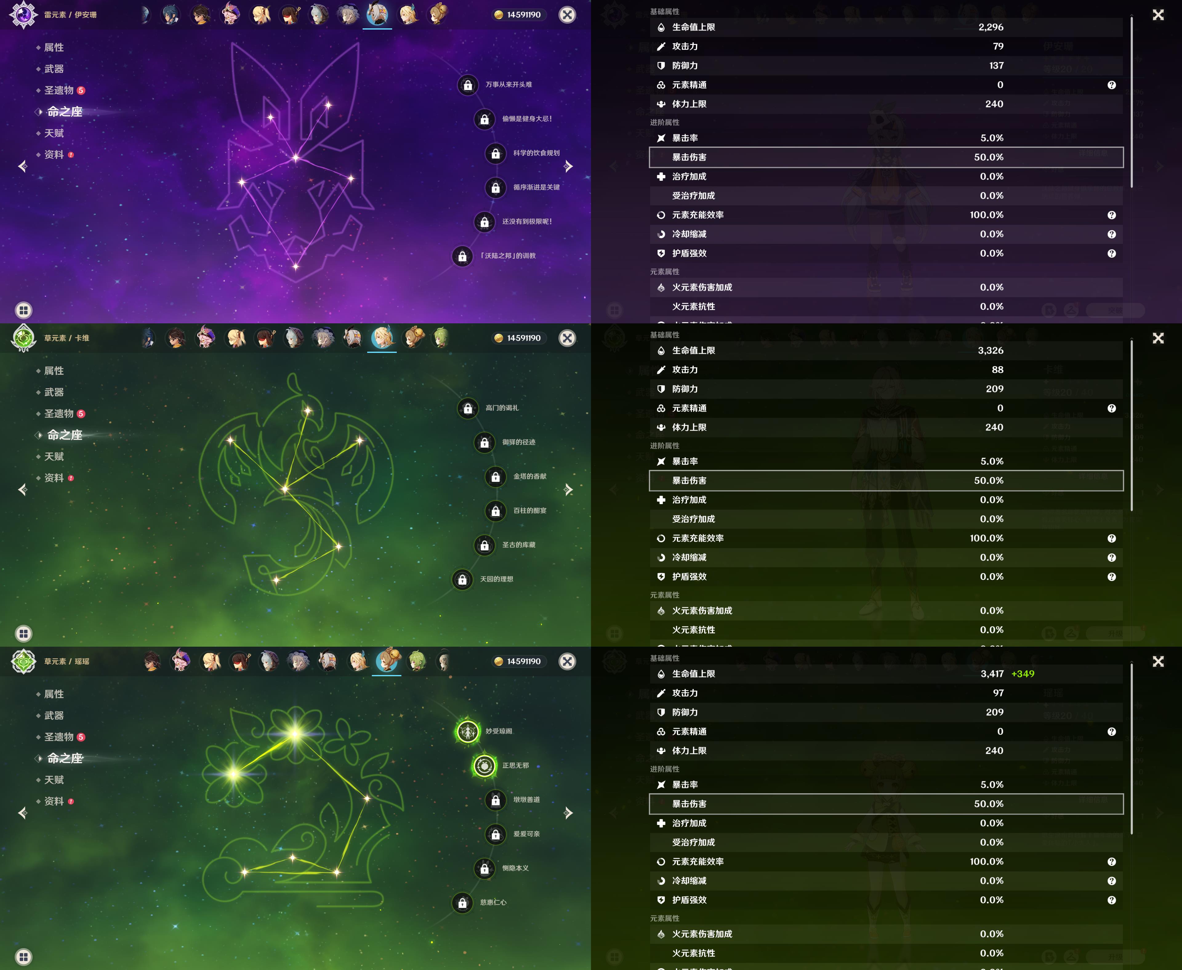 55级/20黄/女主/13个五星角色/3个五星武器/克洛琳德/纳西妲