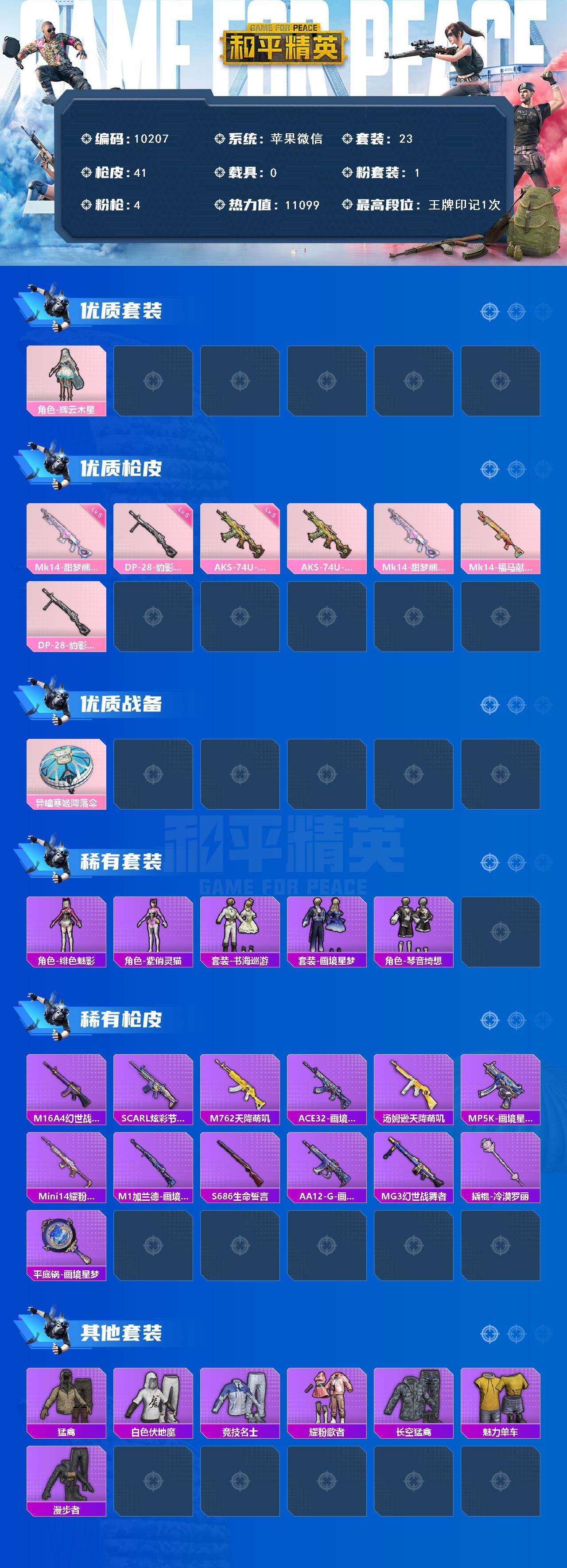 苹果 微信-1粉装-4特效枪-0载具-0粉色飞行器-11099热力值-1王牌印记-23套装-41枪皮