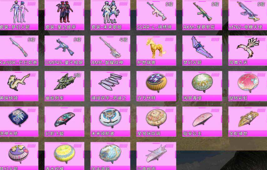 安卓 手Q-1神装-4粉装-11特效枪-1载具-5粉色飞行器-58018热力值-10王牌印记-107套装-184枪皮