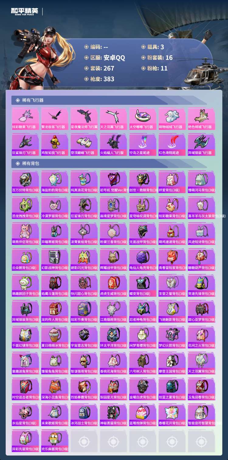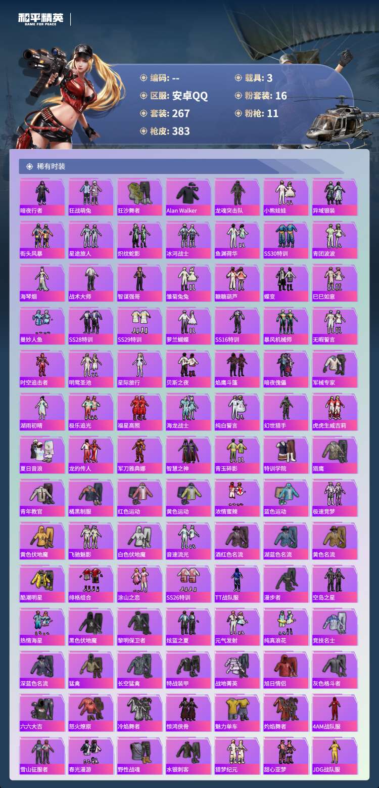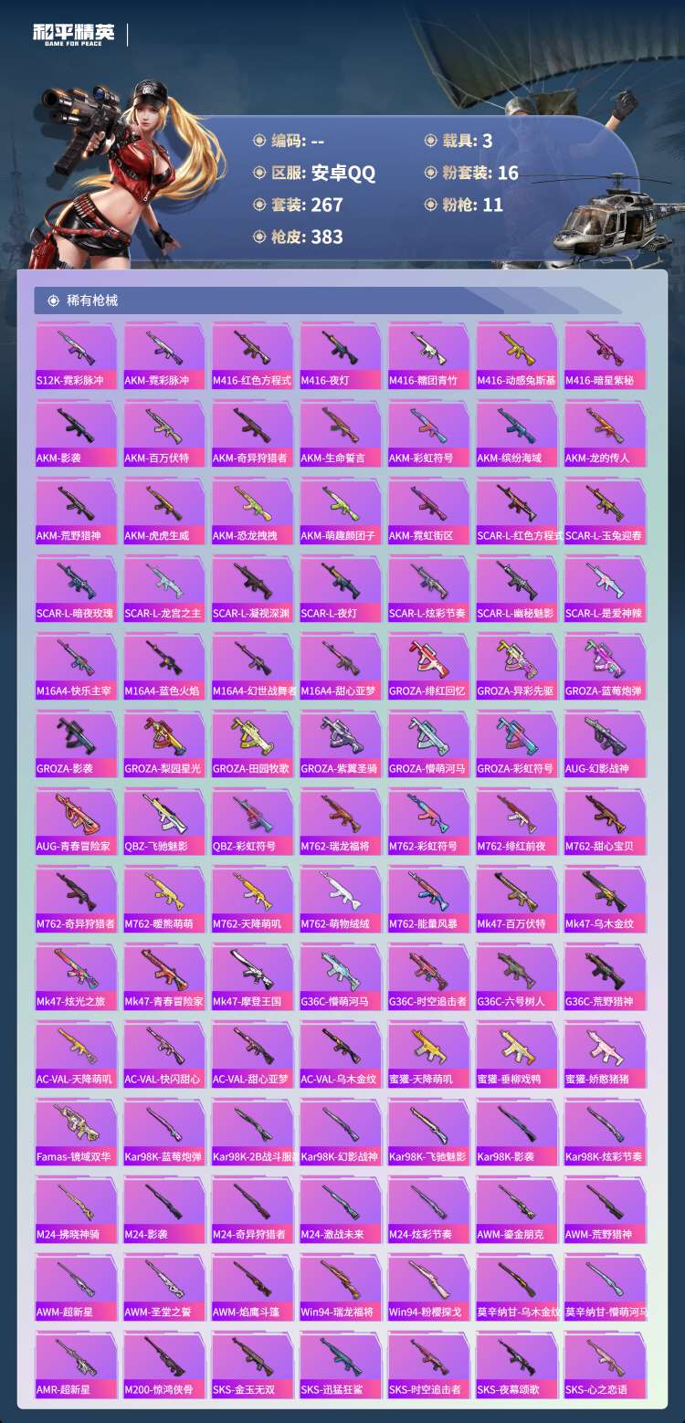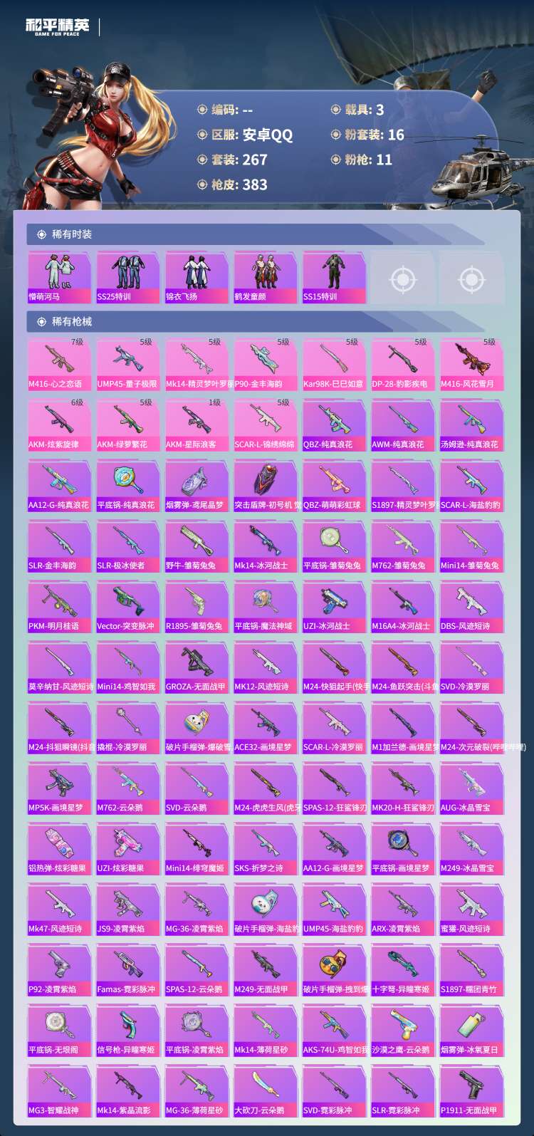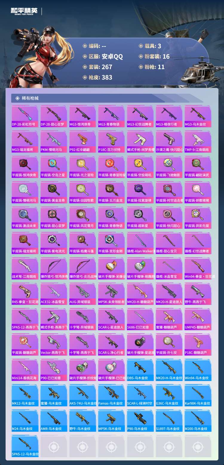 hs60637安卓手Q-16王牌印记-16粉装-11特效枪-3载具-118115热力值-267套装-