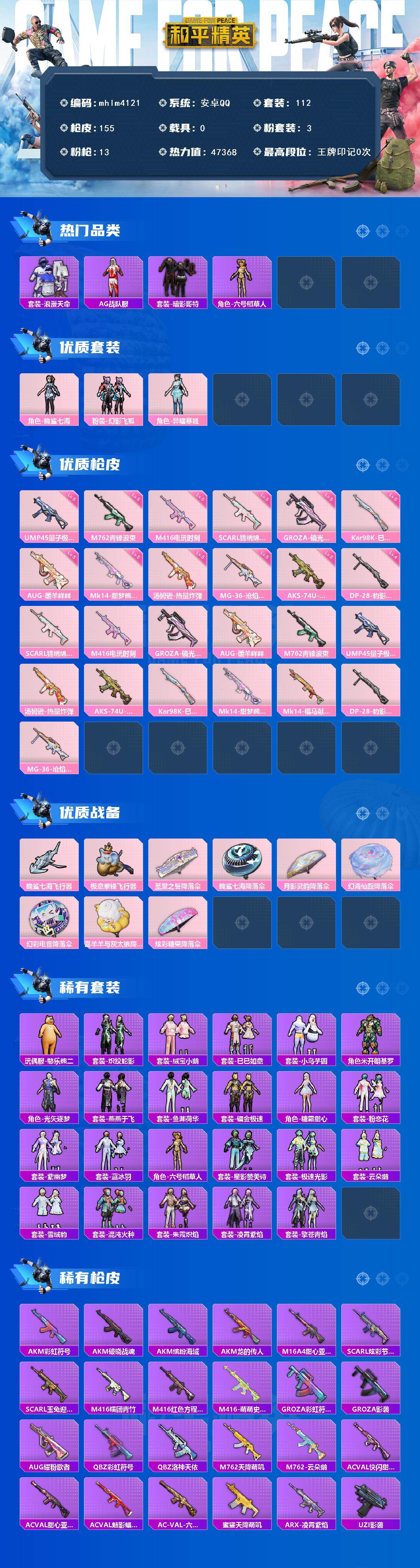 【mhlm4121】安卓 手Q-3粉装-13特效枪-0载具-2粉色飞行器-47368热力值-1王牌印记-112套装-155枪皮
