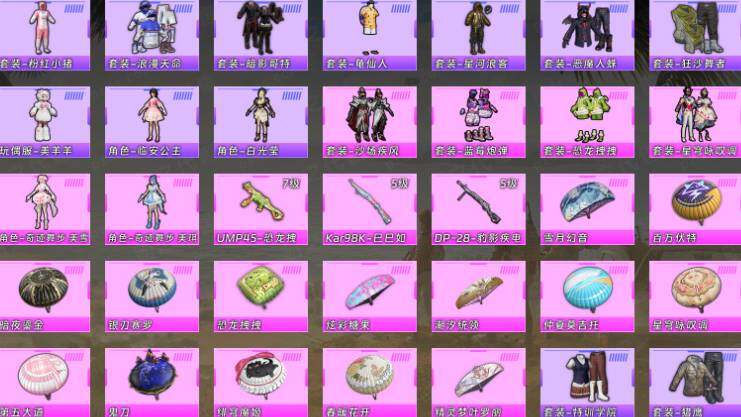 【粉色枪皮等级】:M416-电玩时刻(五级),GROZA-镜光银凌(五级),AUG-暖羊咩咩(五级),M762-青锋波束(五级),UMP45-量子极限(五