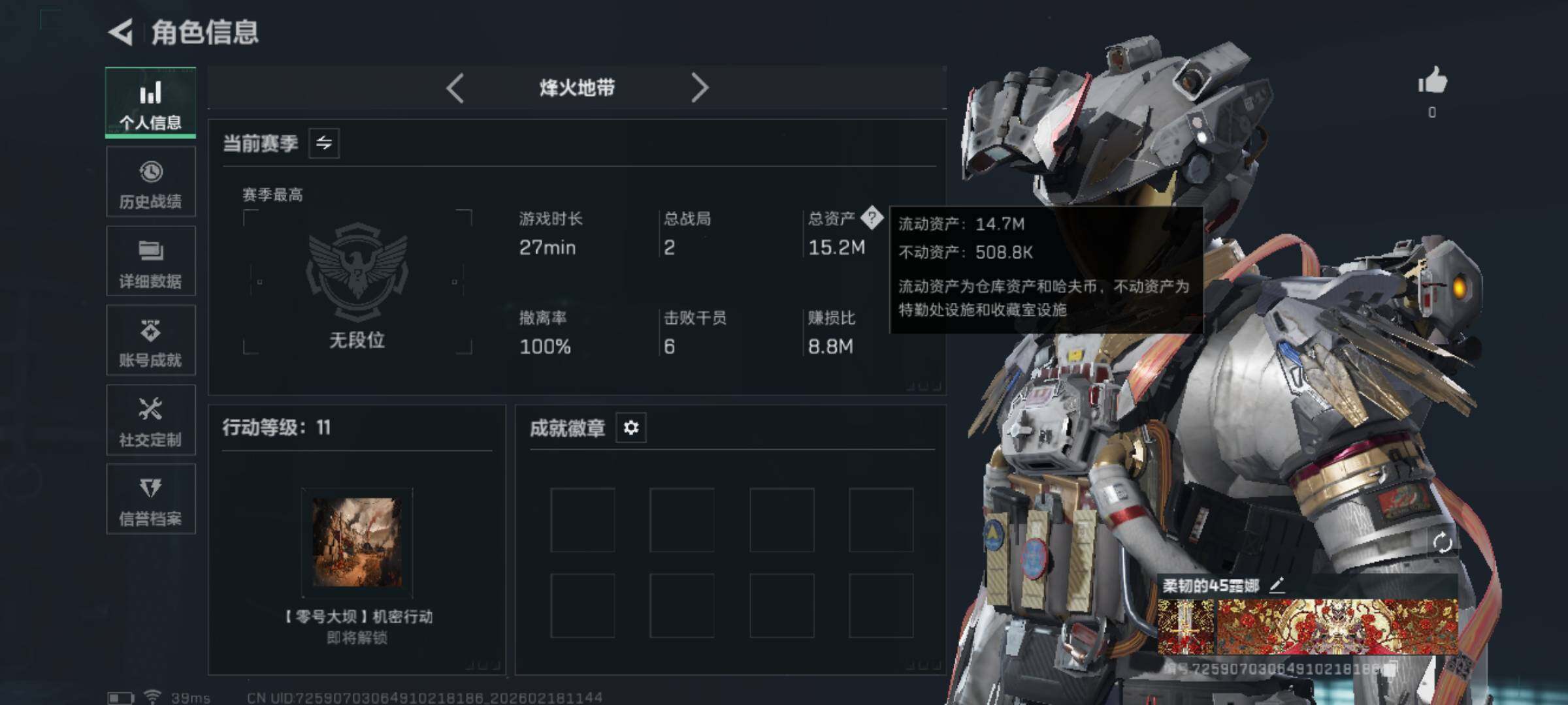 15m总资产-8494k哈伏币-11烽火等级-青铜-1战场等级-无军衔ws00