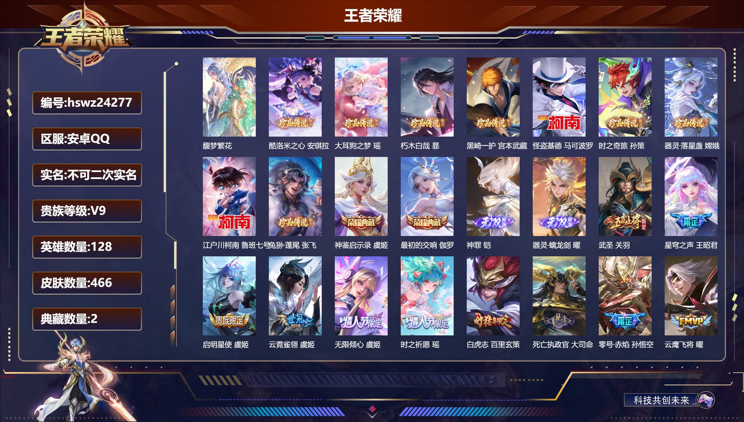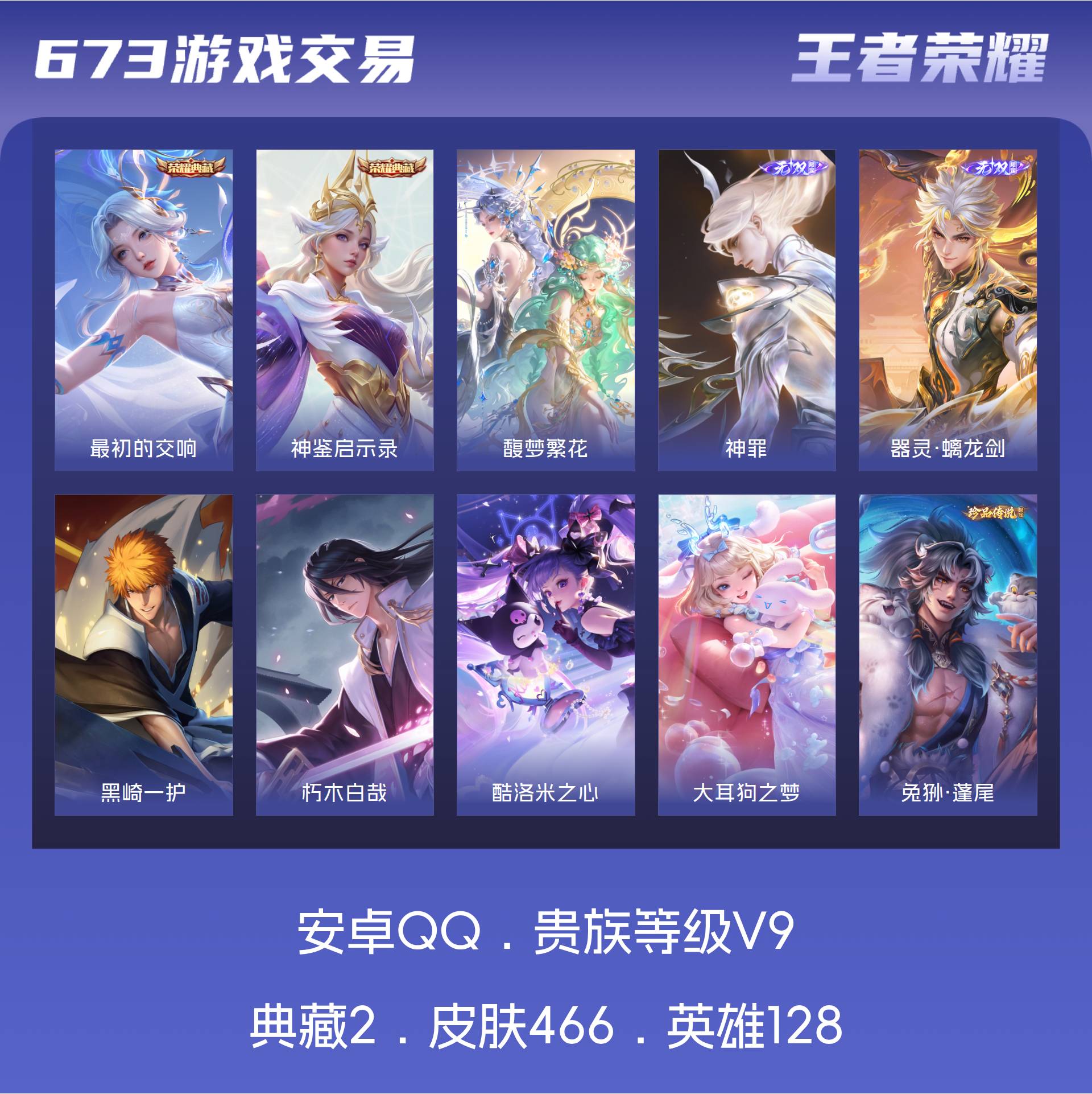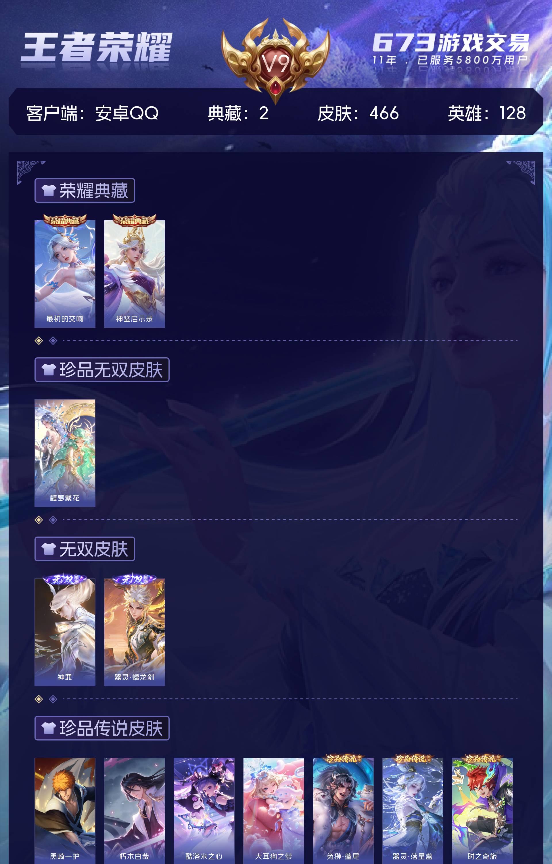 安卓QQ/荣耀王者/466皮肤/128英雄/2典藏/1珍品无双/2无双/9珍品传说/38传说/138