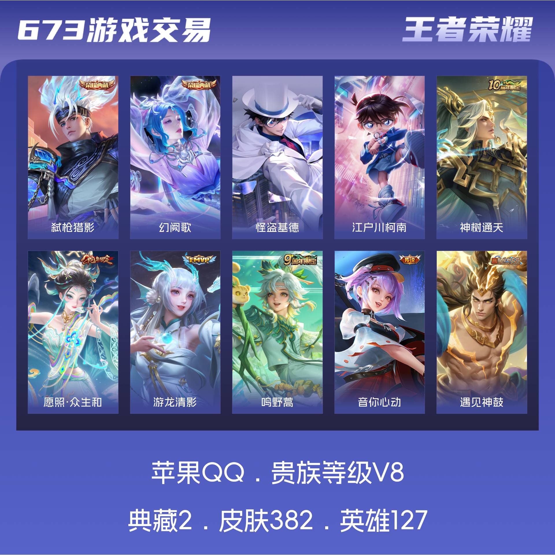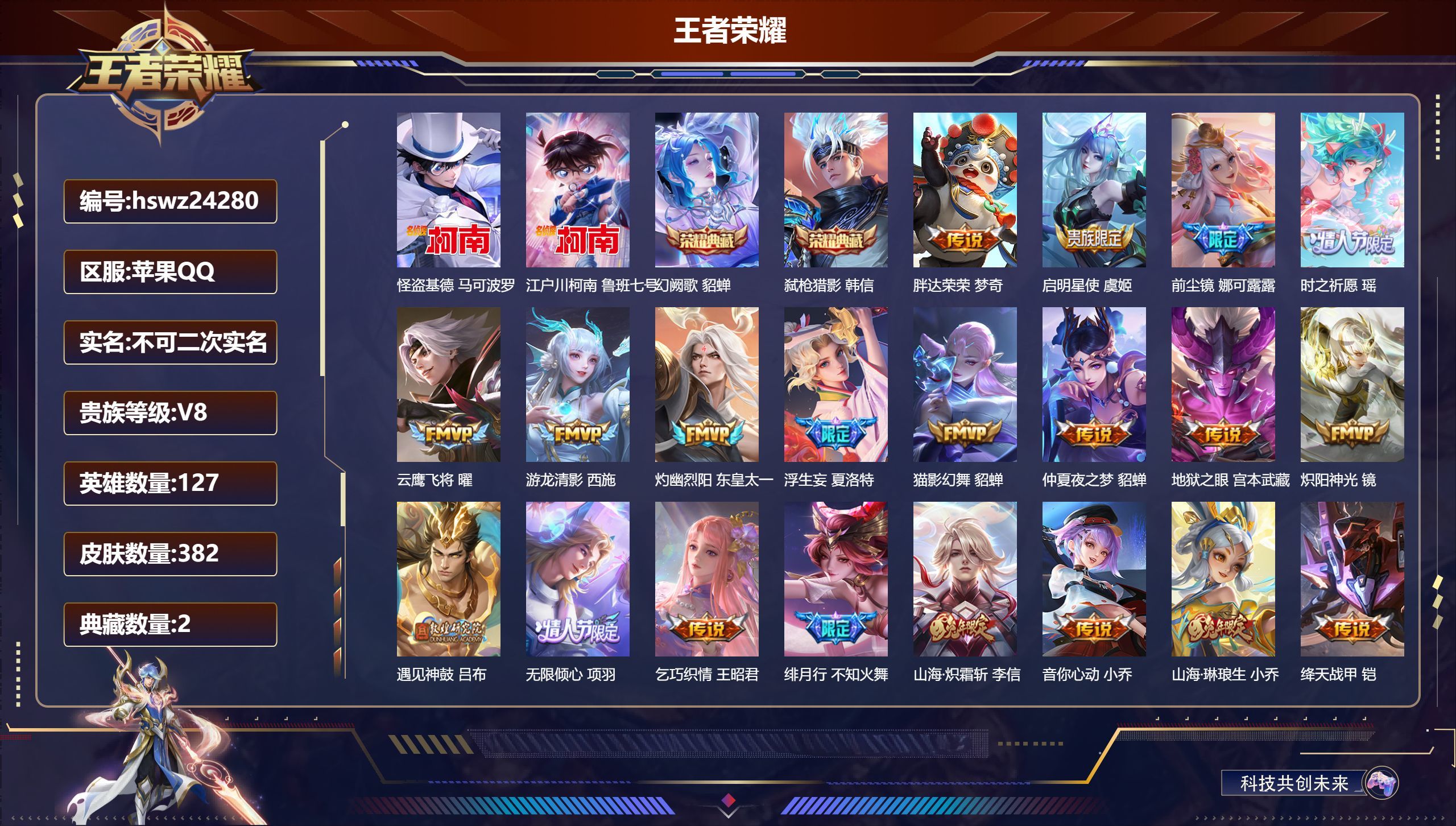 苹果QQ/至尊星耀/382皮肤/127英雄/2典藏/0珍品无双/0无双/2珍品传说/25传说/115