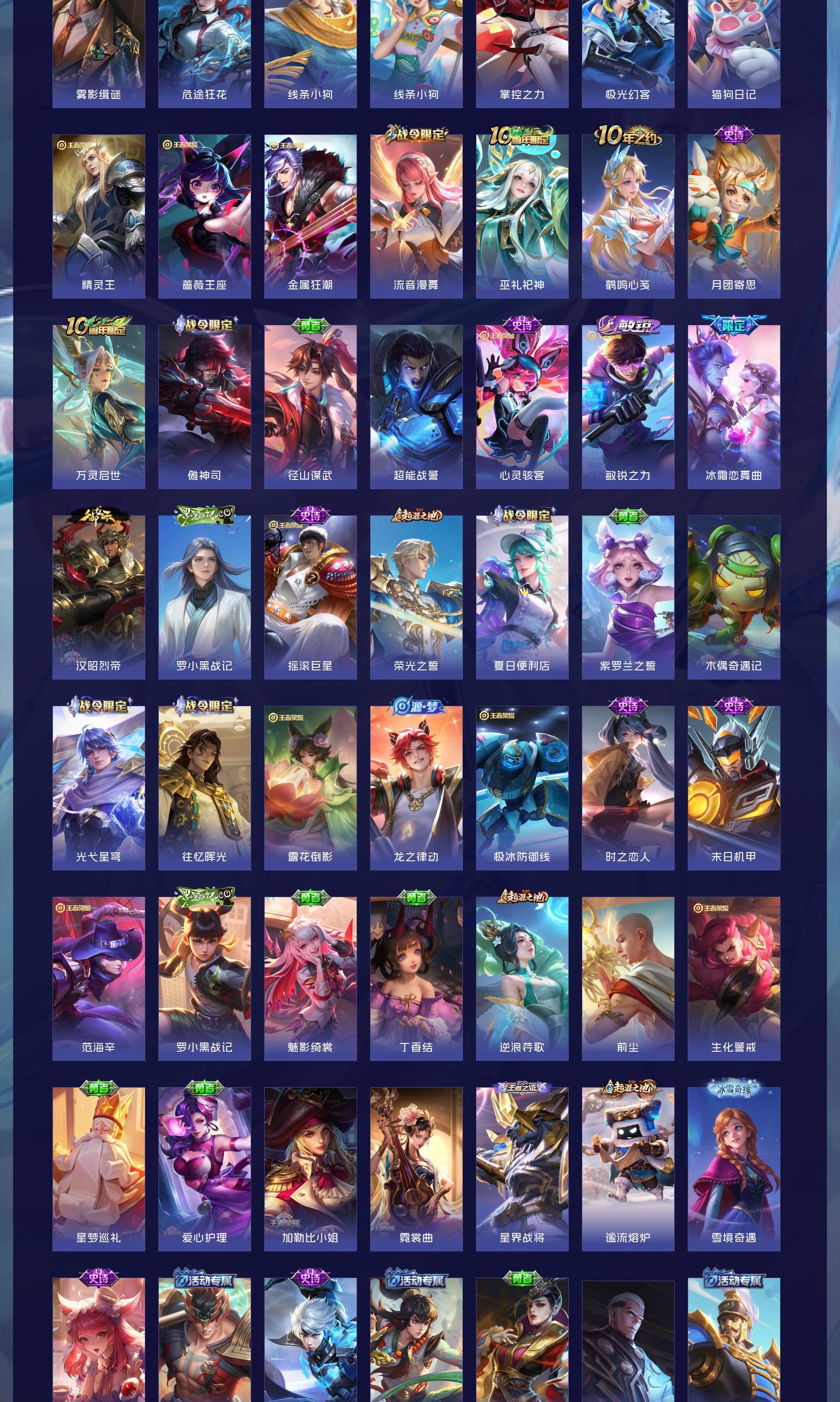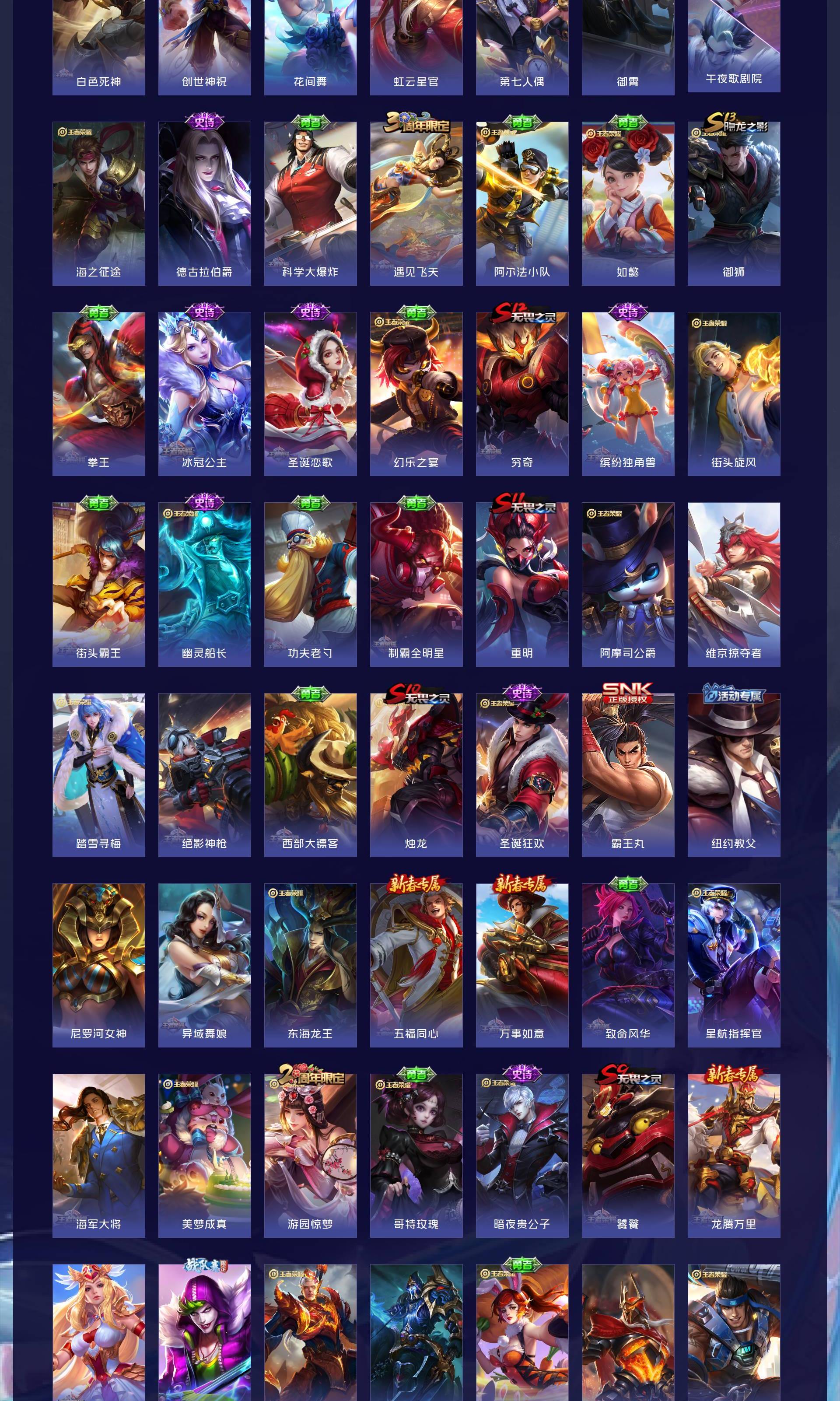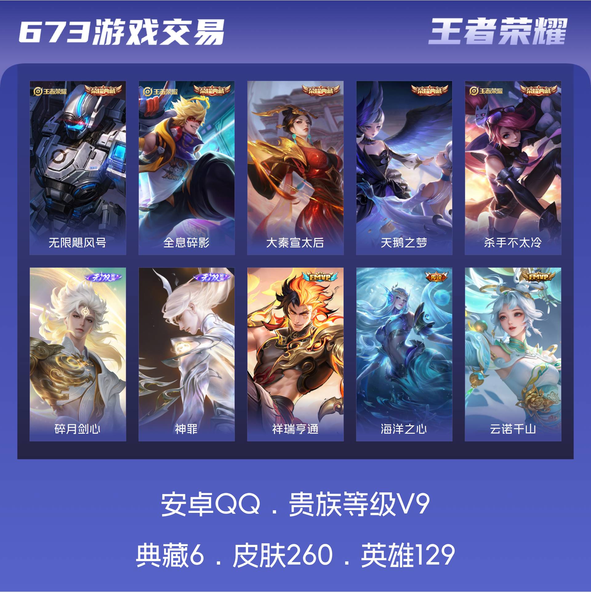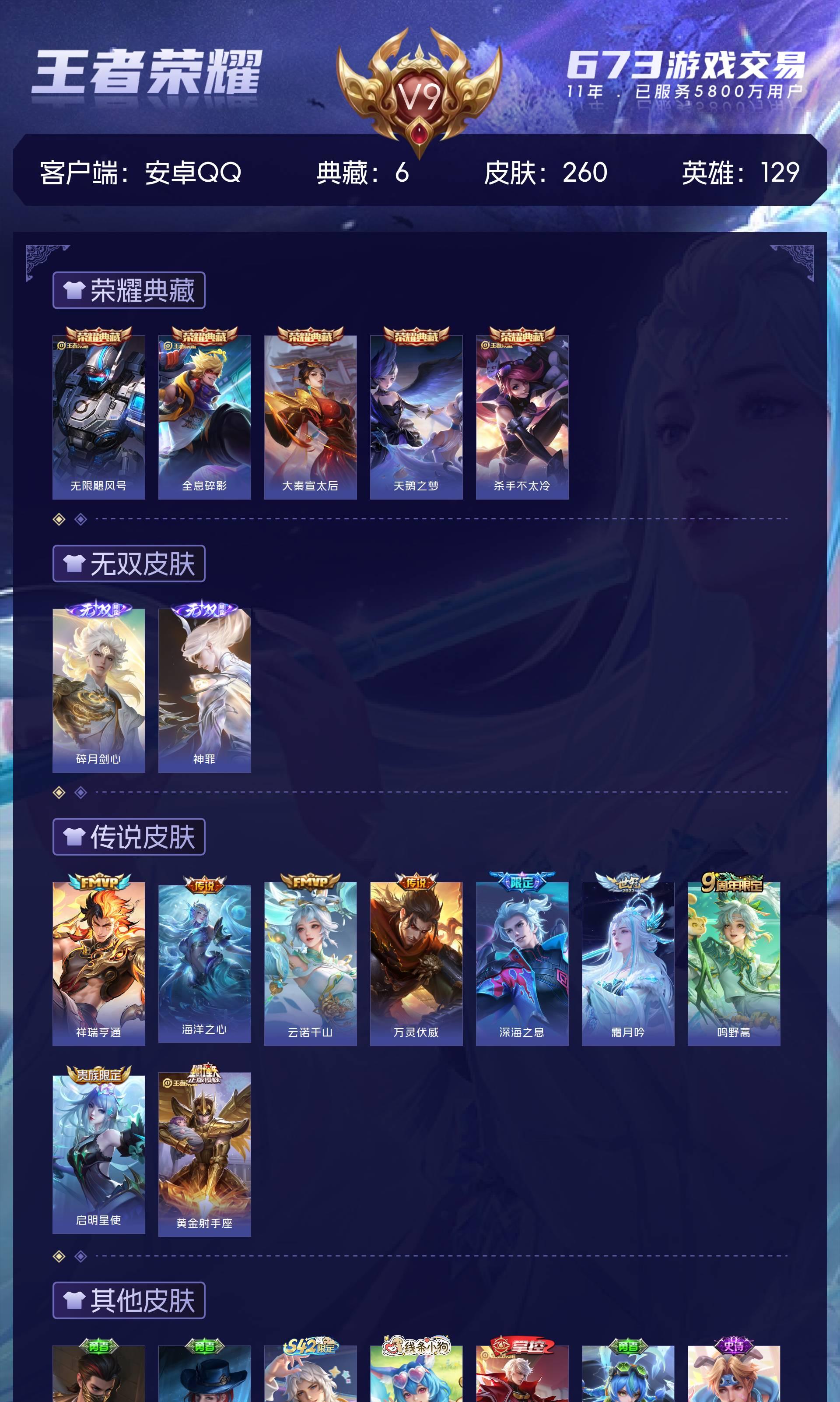 V9 皮肤260 英雄129 至尊星耀 荣耀典藏6 无双皮肤2 传说9 其他皮肤249