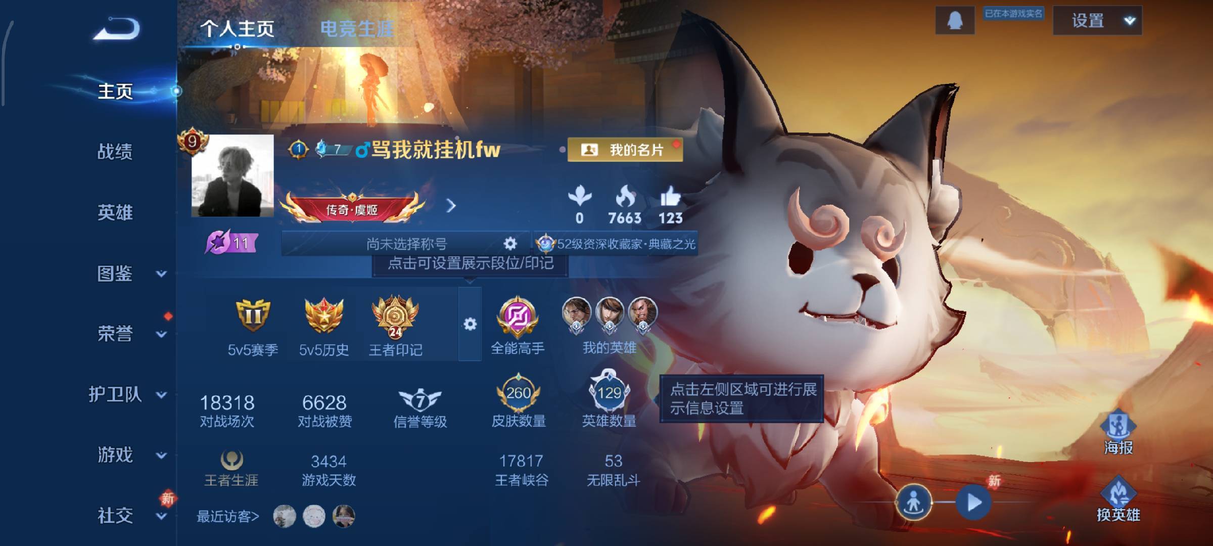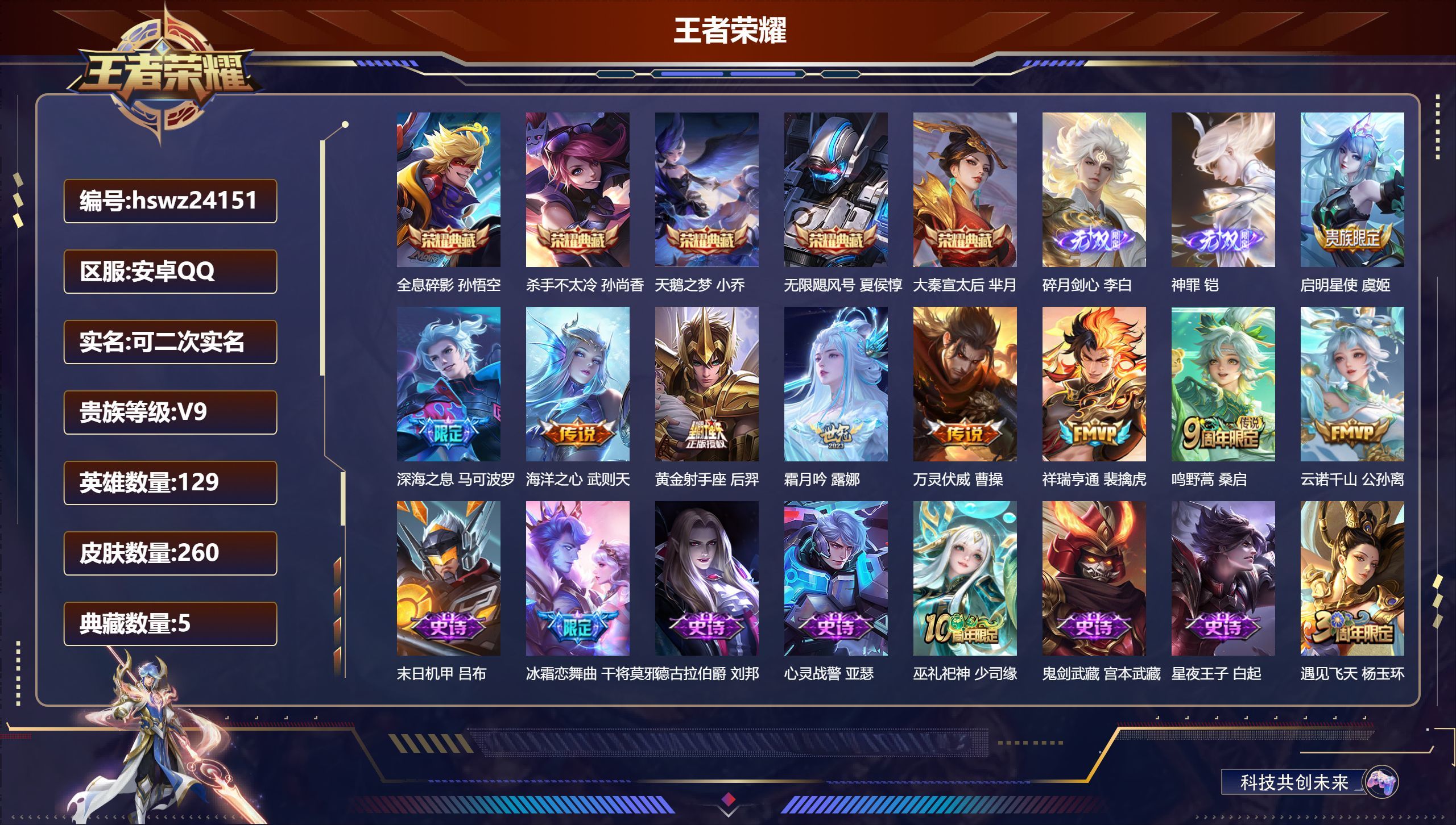 安卓QQ/至尊星耀/260皮肤/129英雄/5典藏/0珍品无双/2无双/0珍品传说/9传说/55史诗