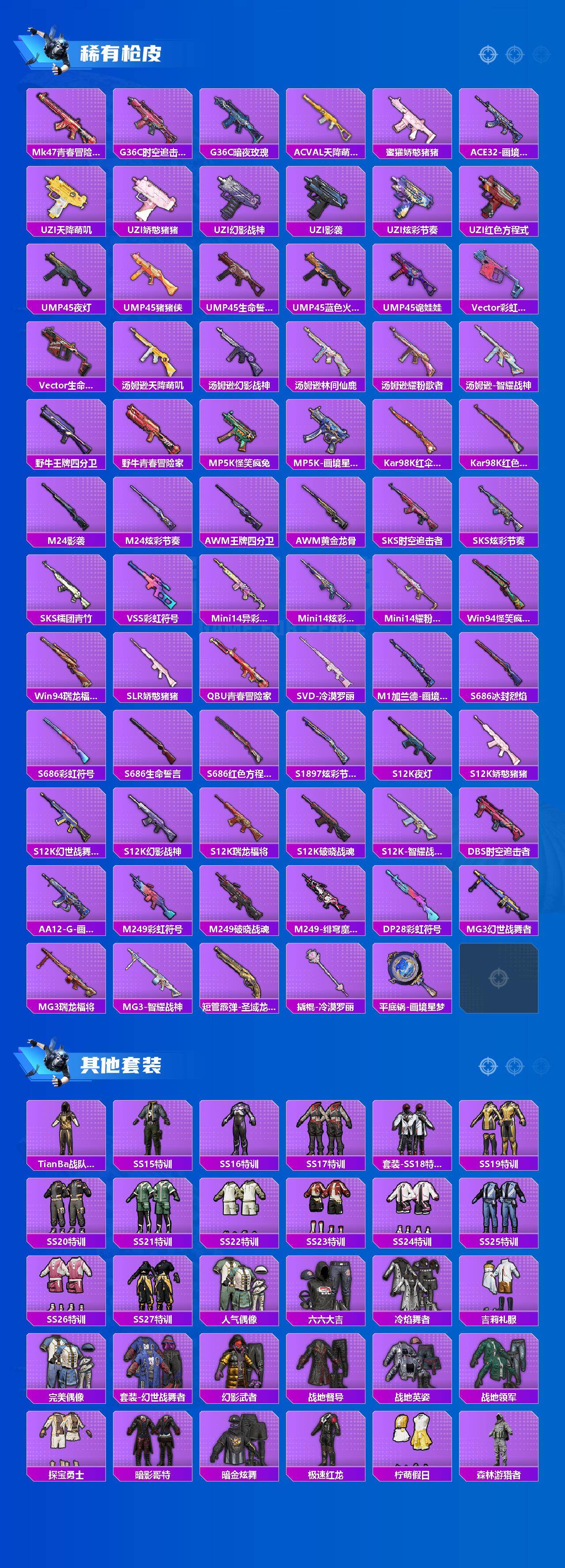 【粉色枪皮等级】:AKM-星际浪客(六级),AKS-74U-森灵之息(五级),Kar98K-巳巳如意(五级),AWM-