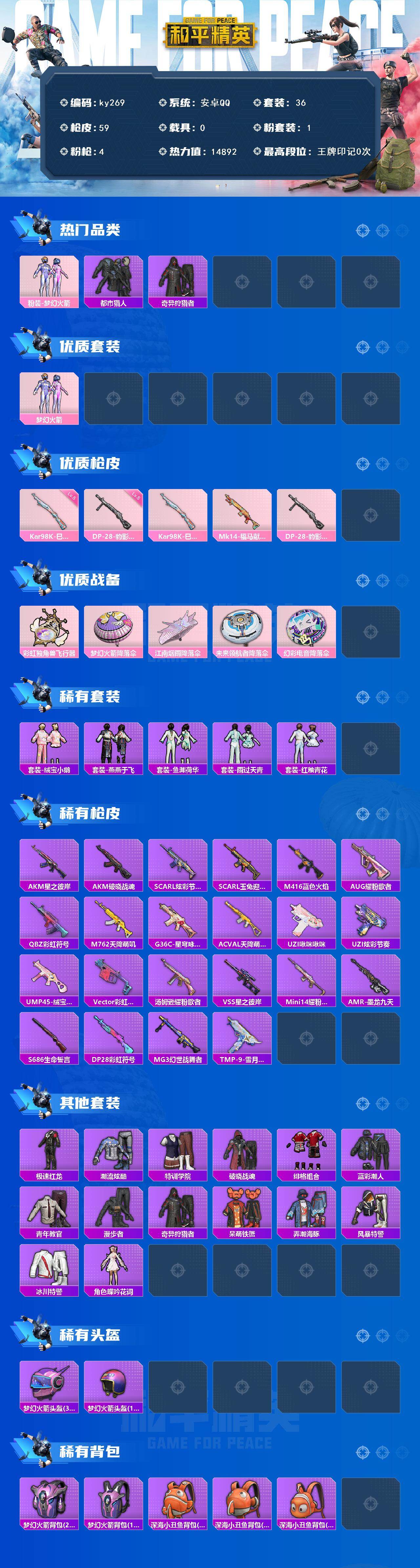 安卓 手Q-1粉装-4特效枪-0载具-1粉色飞行器-14892热力值-1王牌印记-36套装-59枪皮