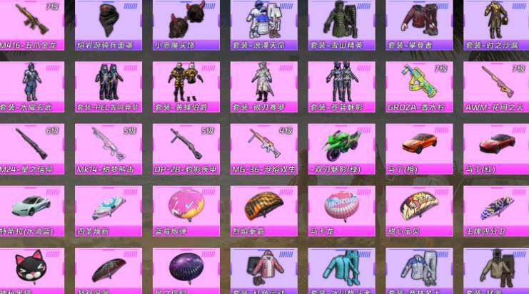 【粉色枪皮等级】:M416-五爪金龙(七级),GROZA-香水柠檬(七级),M24-星之信仰(六级),AWM-花间之火(
