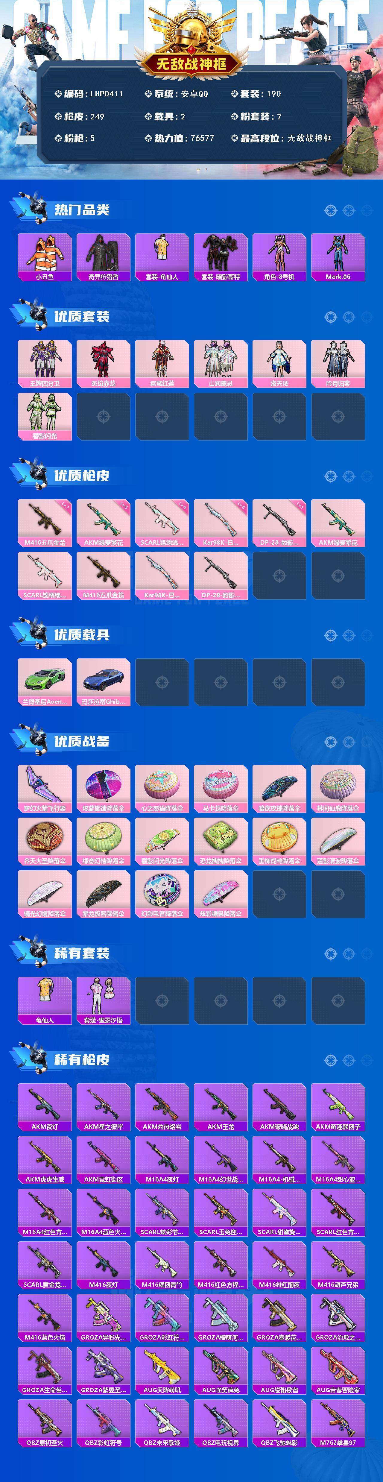 【特价出售/店主推荐】安卓 手Q-无敌战神框-7粉装-5特效枪-2载具-1粉色飞行器-76577热力值-11王牌印记-190套装-249枪皮【热门品类】:套装-小丑鱼,套装-奇异狩猎者,套装-龟仙人,套装-暗影哥特,角色-8号机,角色-Mark.06【粉色套装】:粉装-王牌四分卫,粉装-炙焰赤龙,粉装-桀骜红莲,粉装-山涧鹿灵,角色-洛天依,粉装-吟月归客,粉装-碧影闪光【粉色枪皮等级】:AKM