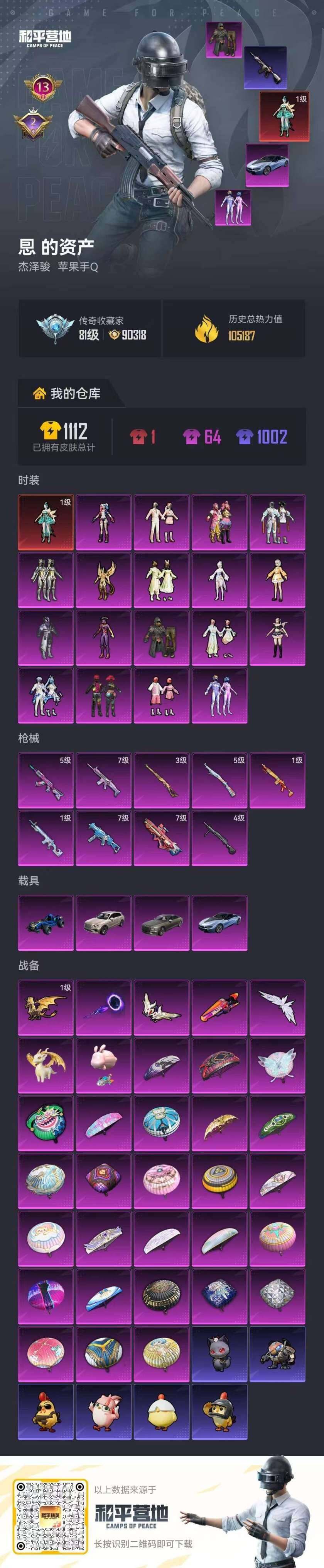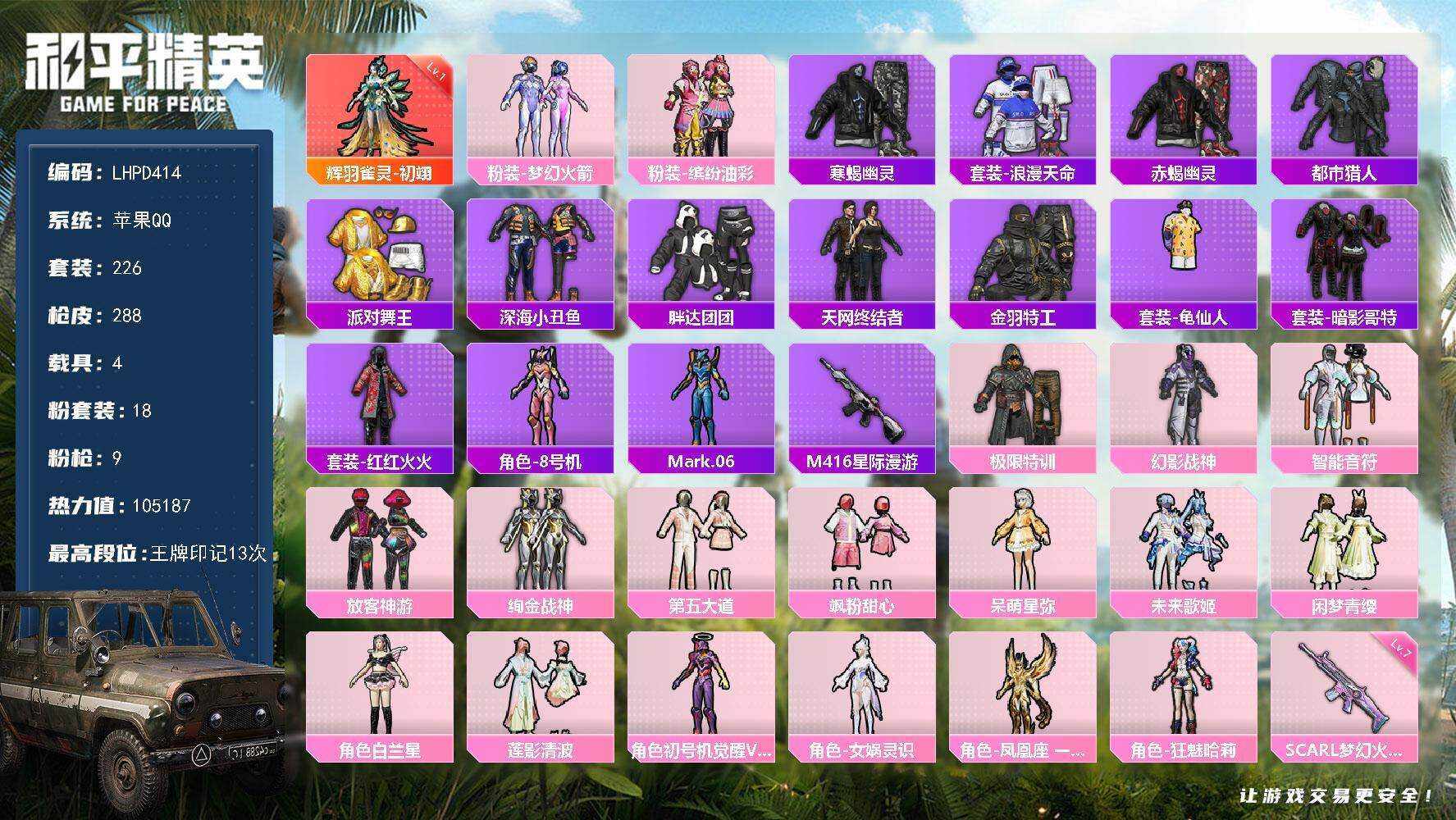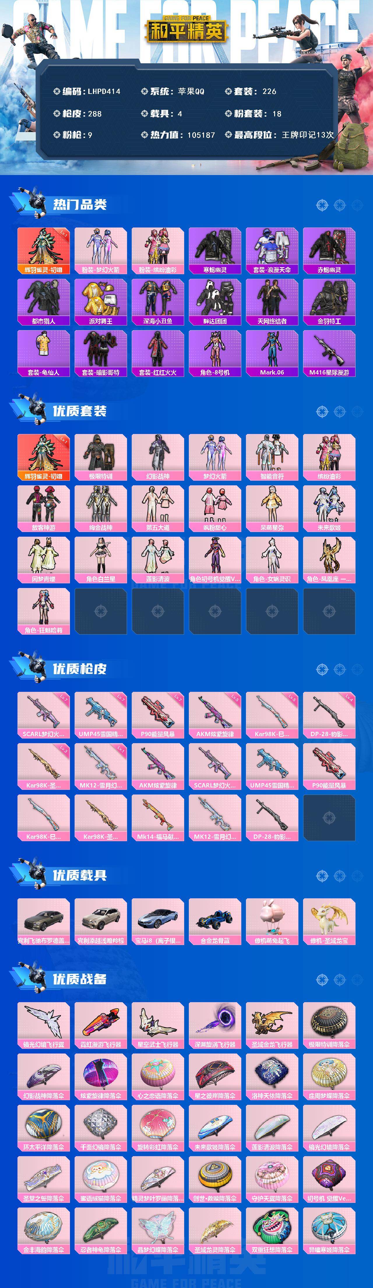 满素材身法男神号!!!【特价出售/店主推荐】苹果 手Q-1神装-18粉装-9特效枪-6载具-5粉色飞行器-105187热力值-13王牌印记-226套装-288枪皮【红色神装等级】:辉羽雀灵-初翊(一级)【红色角色神装】:辉羽雀灵-初翊【热门品类】:粉装-梦幻火箭,粉装-缤纷油彩,套装-寒蝎幽灵,套装-浪漫天命,套装-赤蝎幽灵,套装-都市猎人,套装-派对舞王,套装-深海小丑鱼,套装-胖达团团,套装