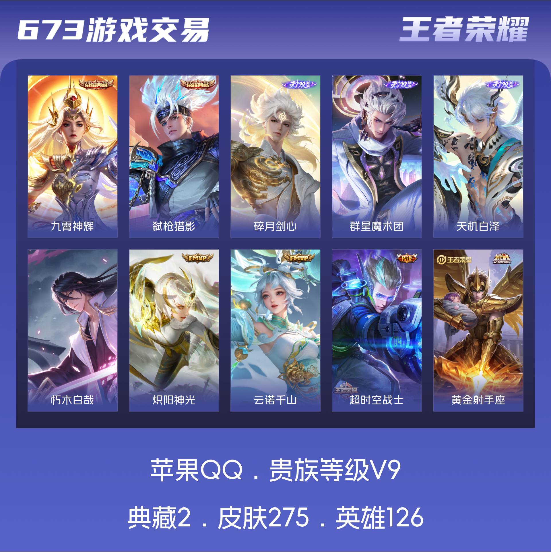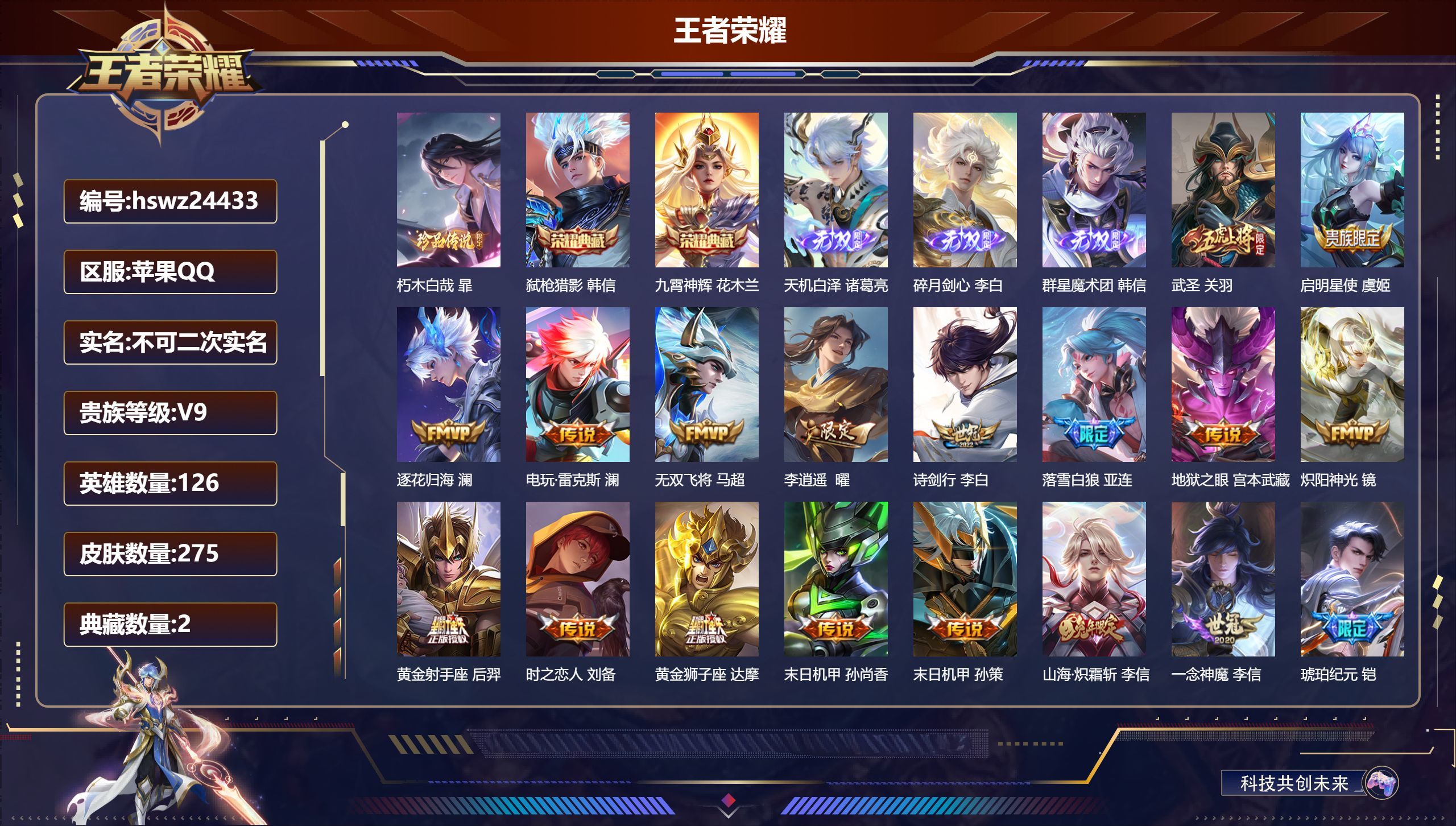 V9 皮肤275 英雄126 永恒钻石 荣耀典藏2 无双皮肤3 珍品传说1 传说24 其他皮肤251