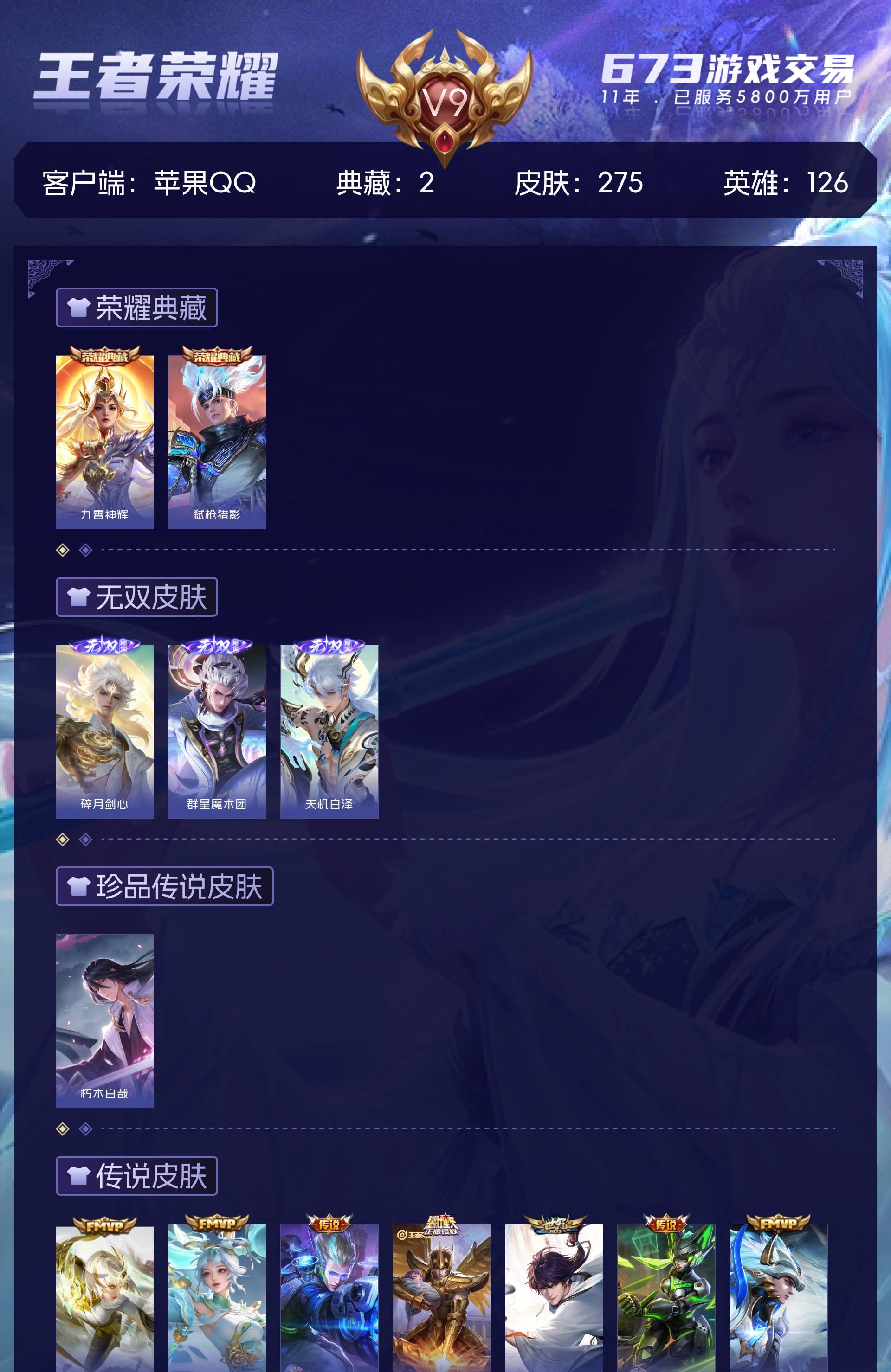 苹果QQ/永恒钻石/275皮肤/126英雄/2典藏/0珍品无双/3无双/1珍品传说/24传说/91史