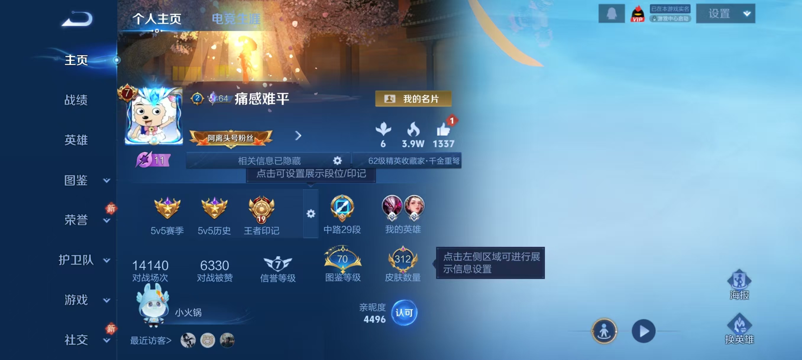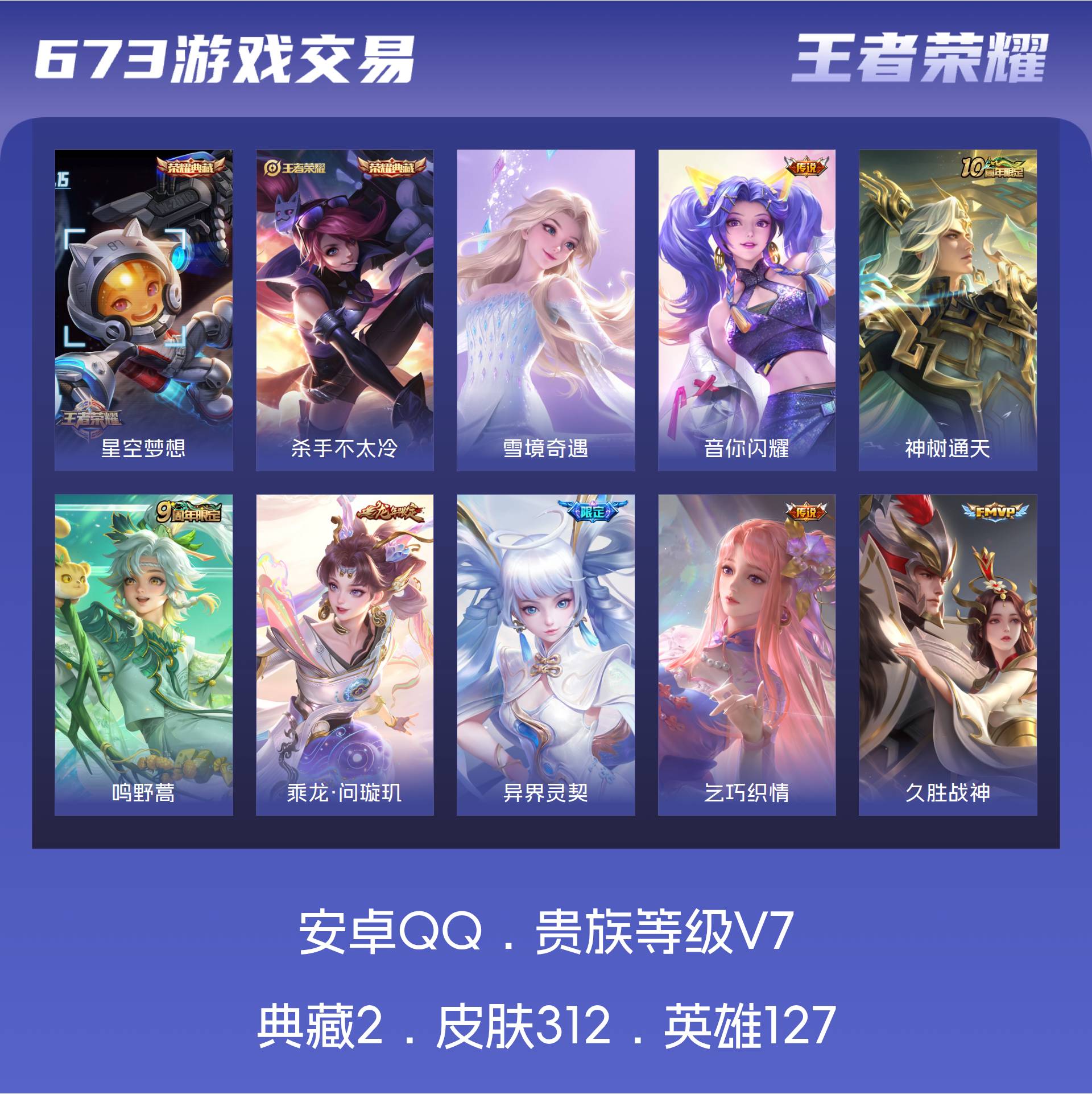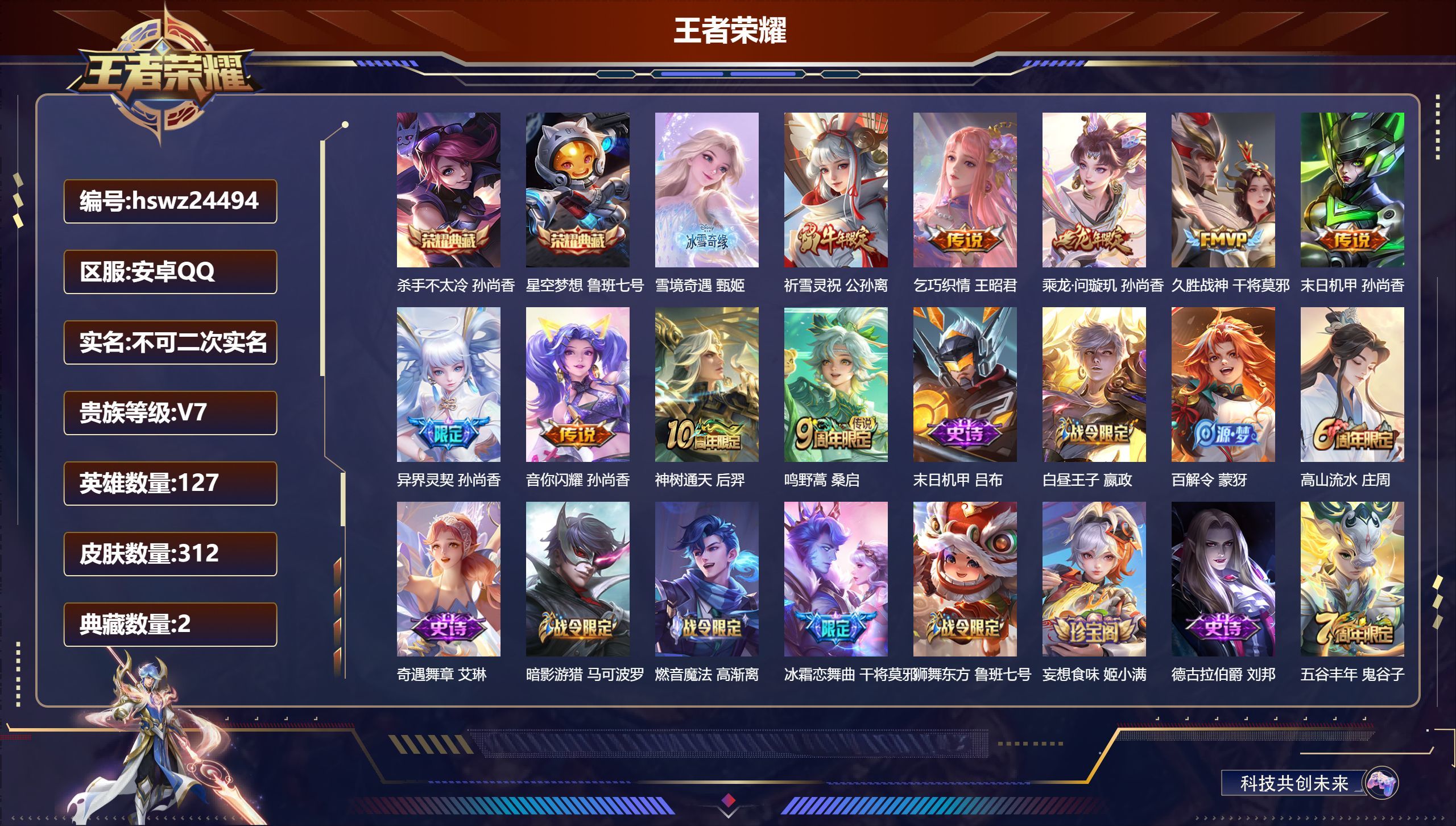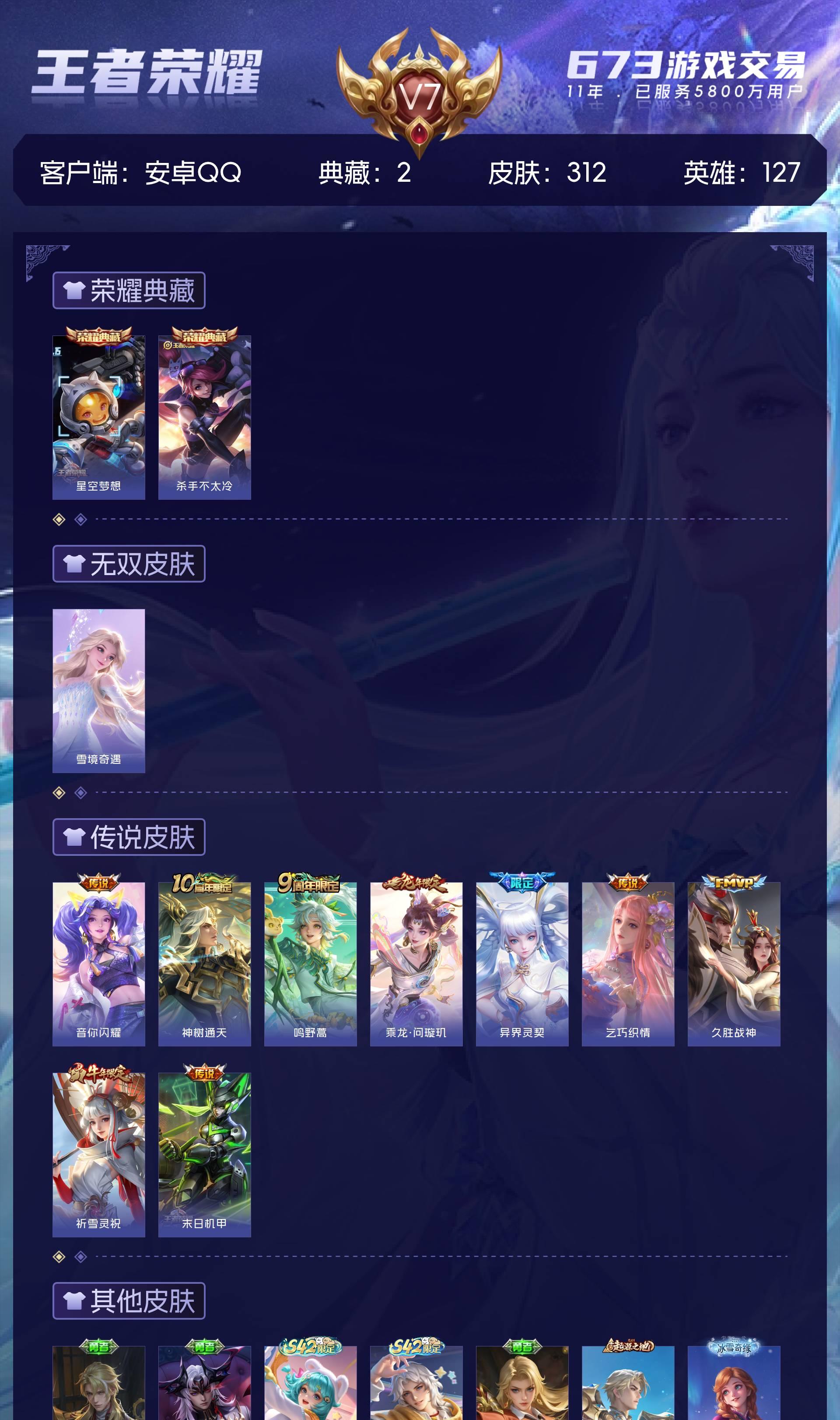 安卓QQ/非凡王者/312皮肤/127英雄/2典藏/0珍品无双/1无双/0珍品传说/9传说/87史诗