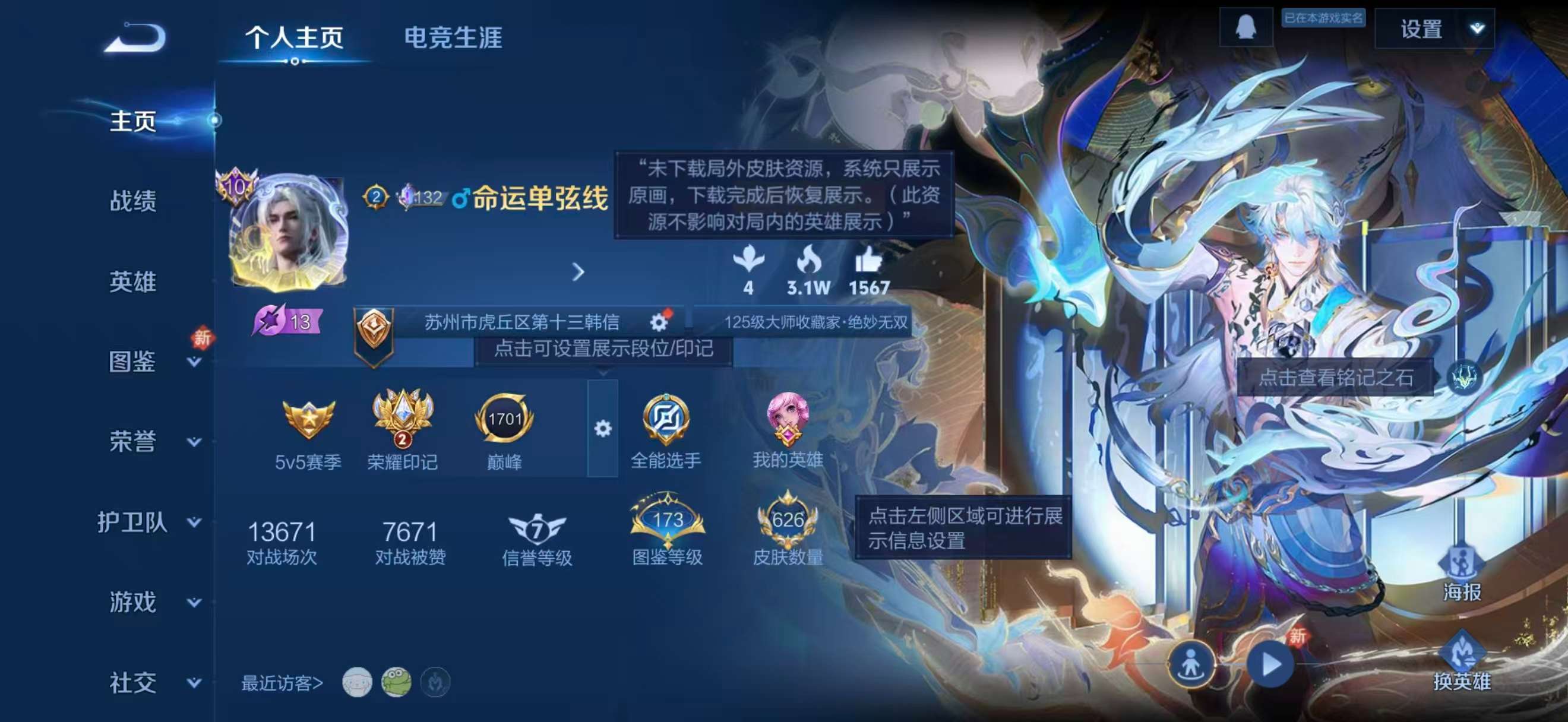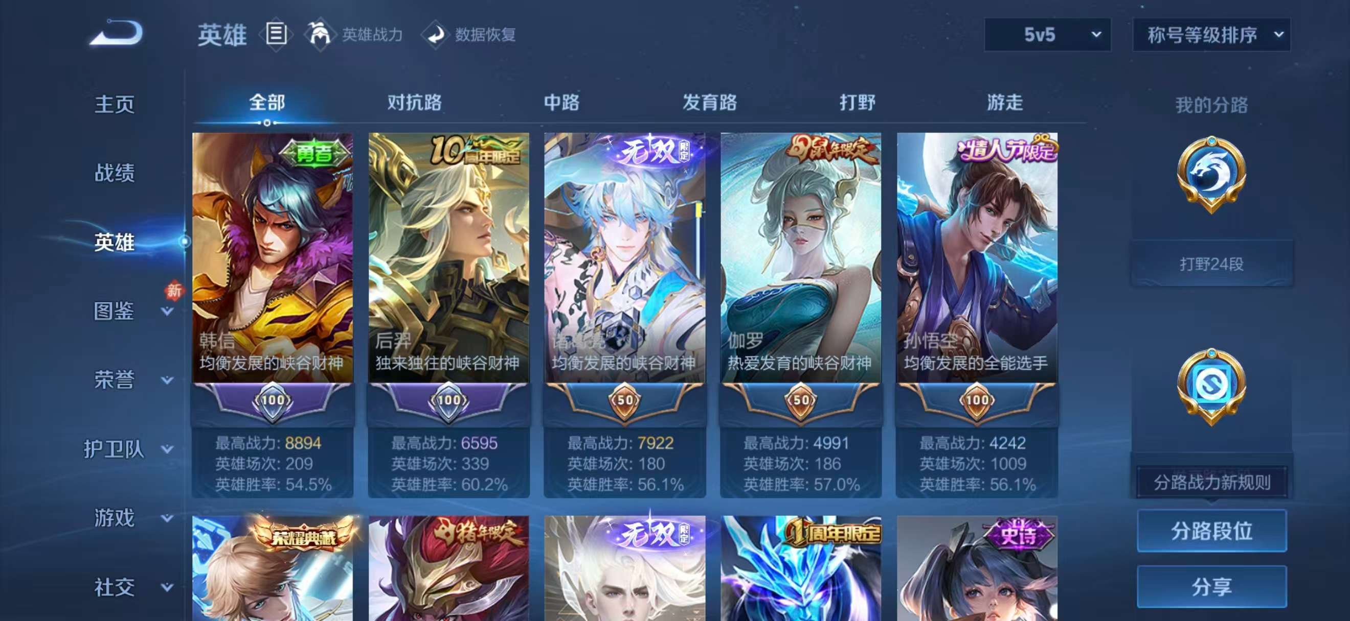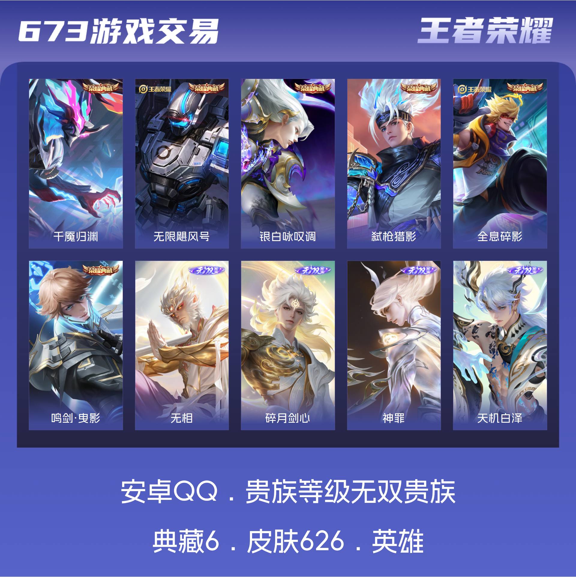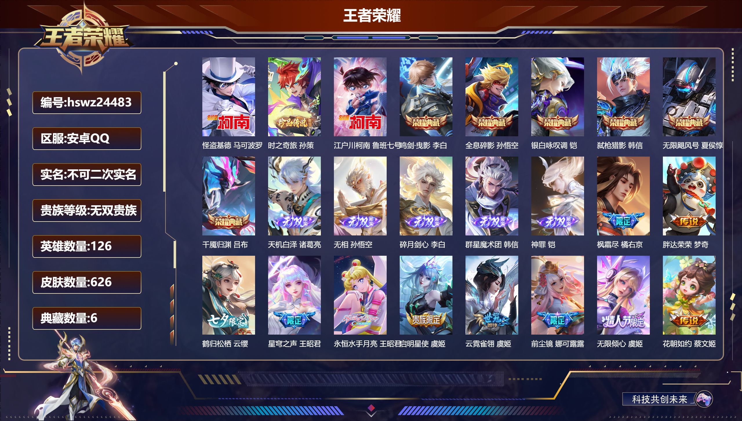 安卓QQ/非凡王者/626皮肤/126英雄/6典藏/0珍品无双/5无双/3珍品传说/100传说/22