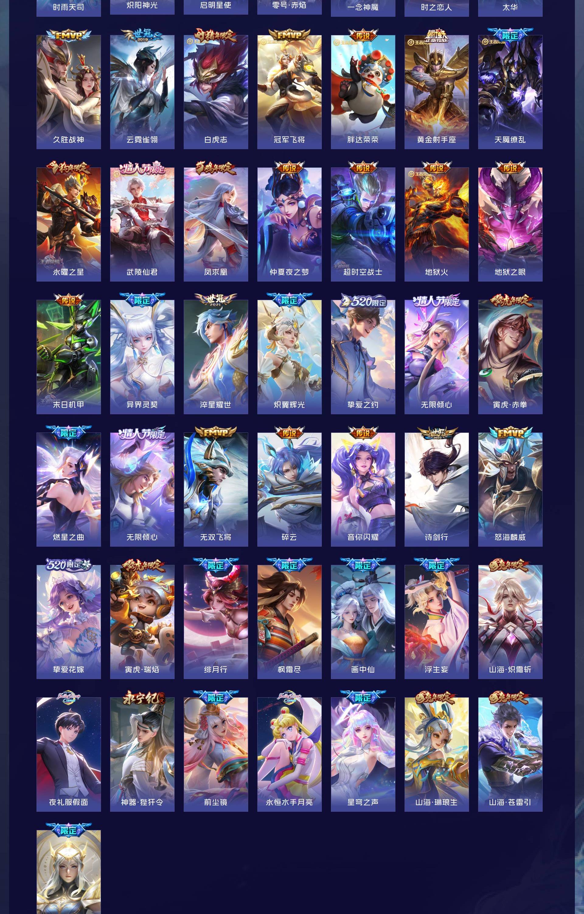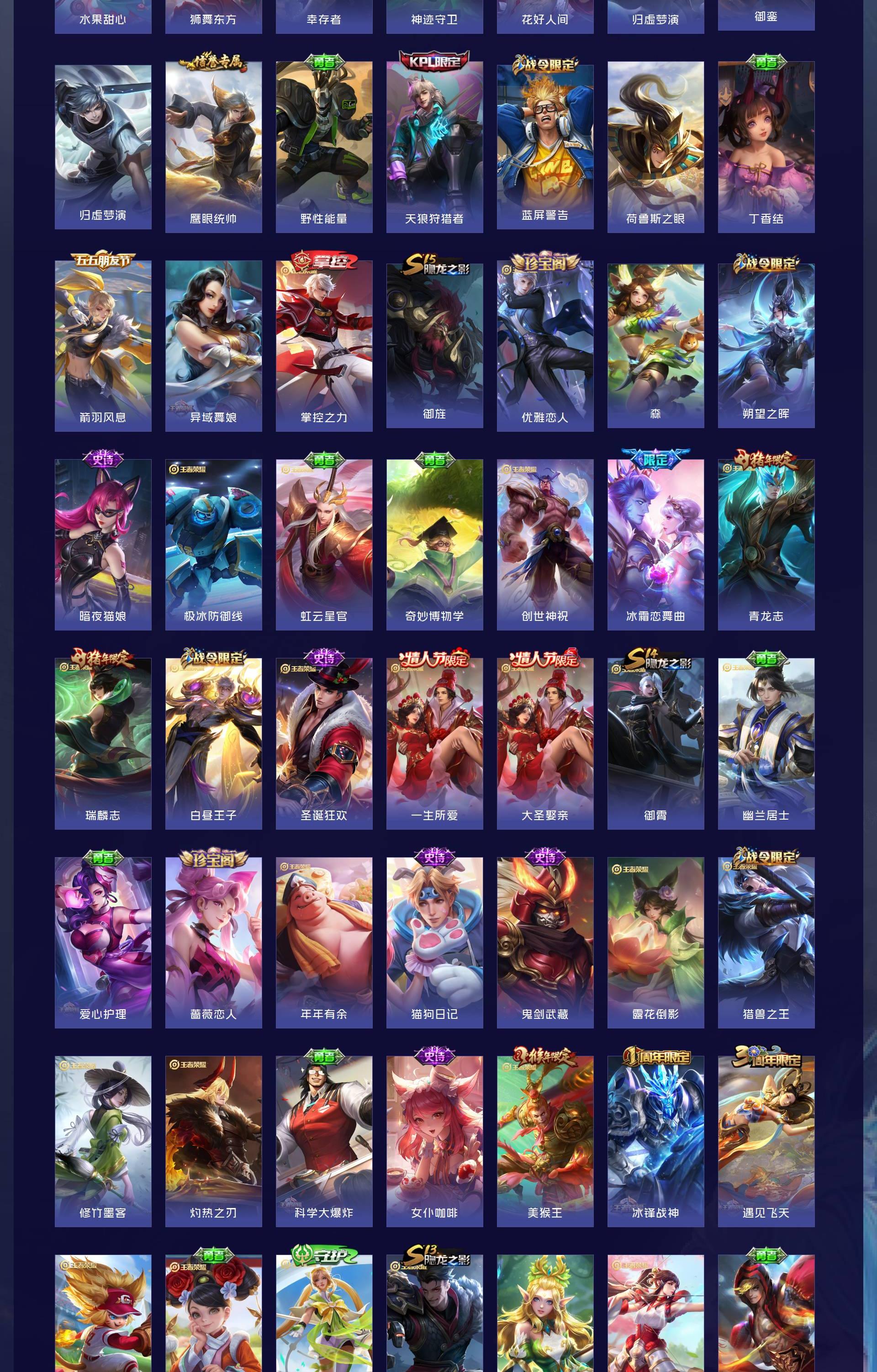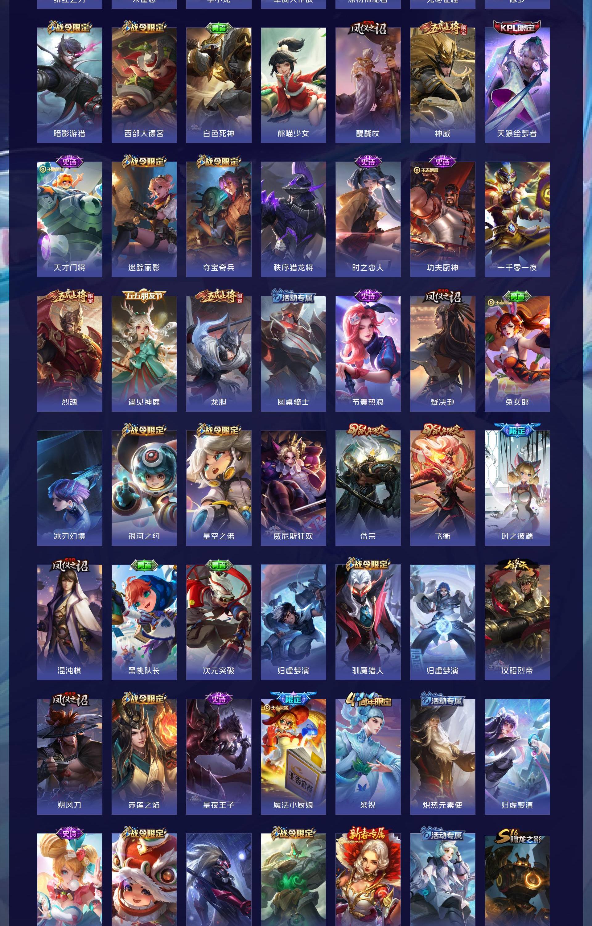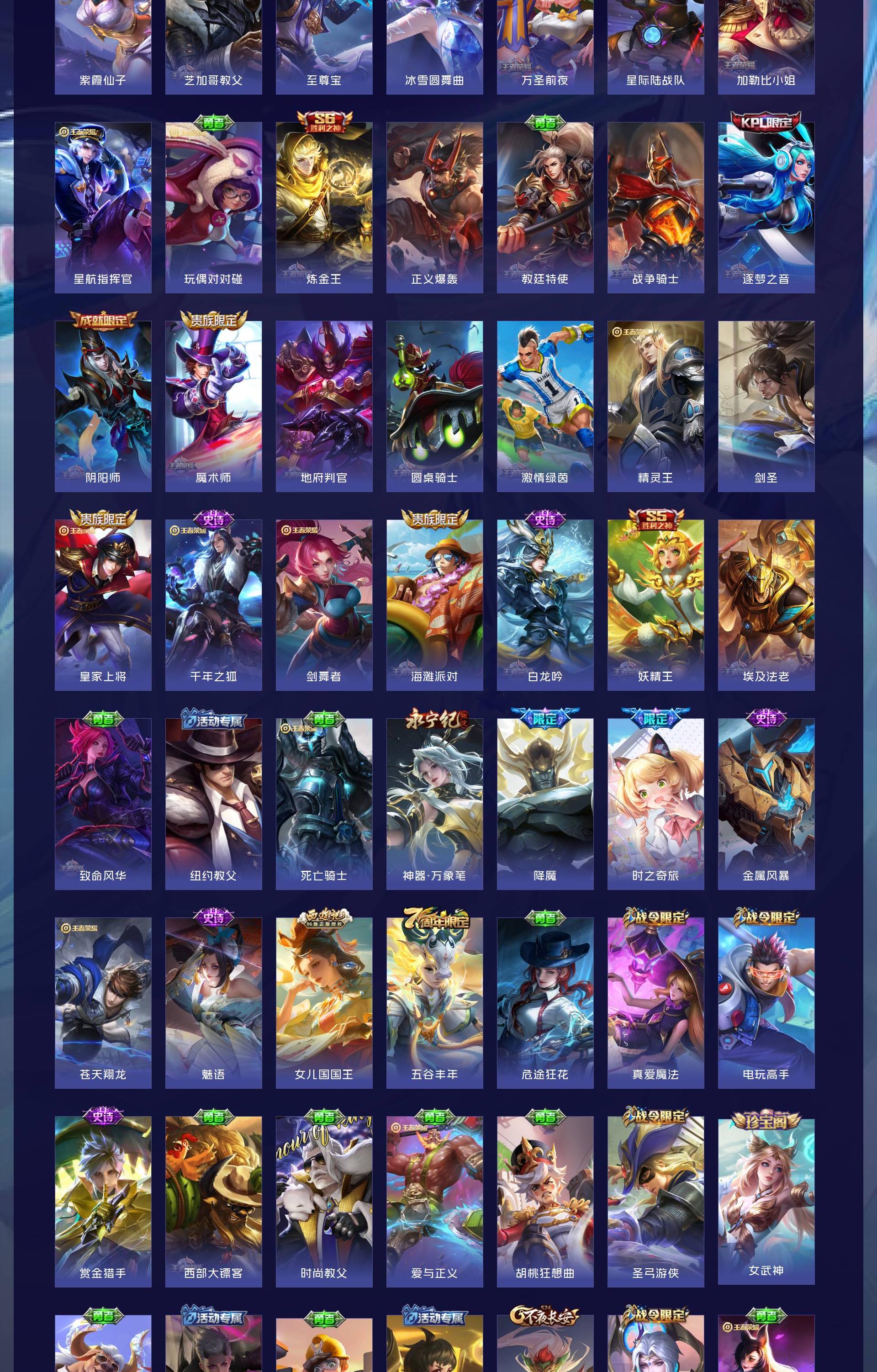 无双贵族 皮肤626 非凡王者 荣耀典藏6 无双皮肤5 珍品传说3 传说99 其他皮肤517