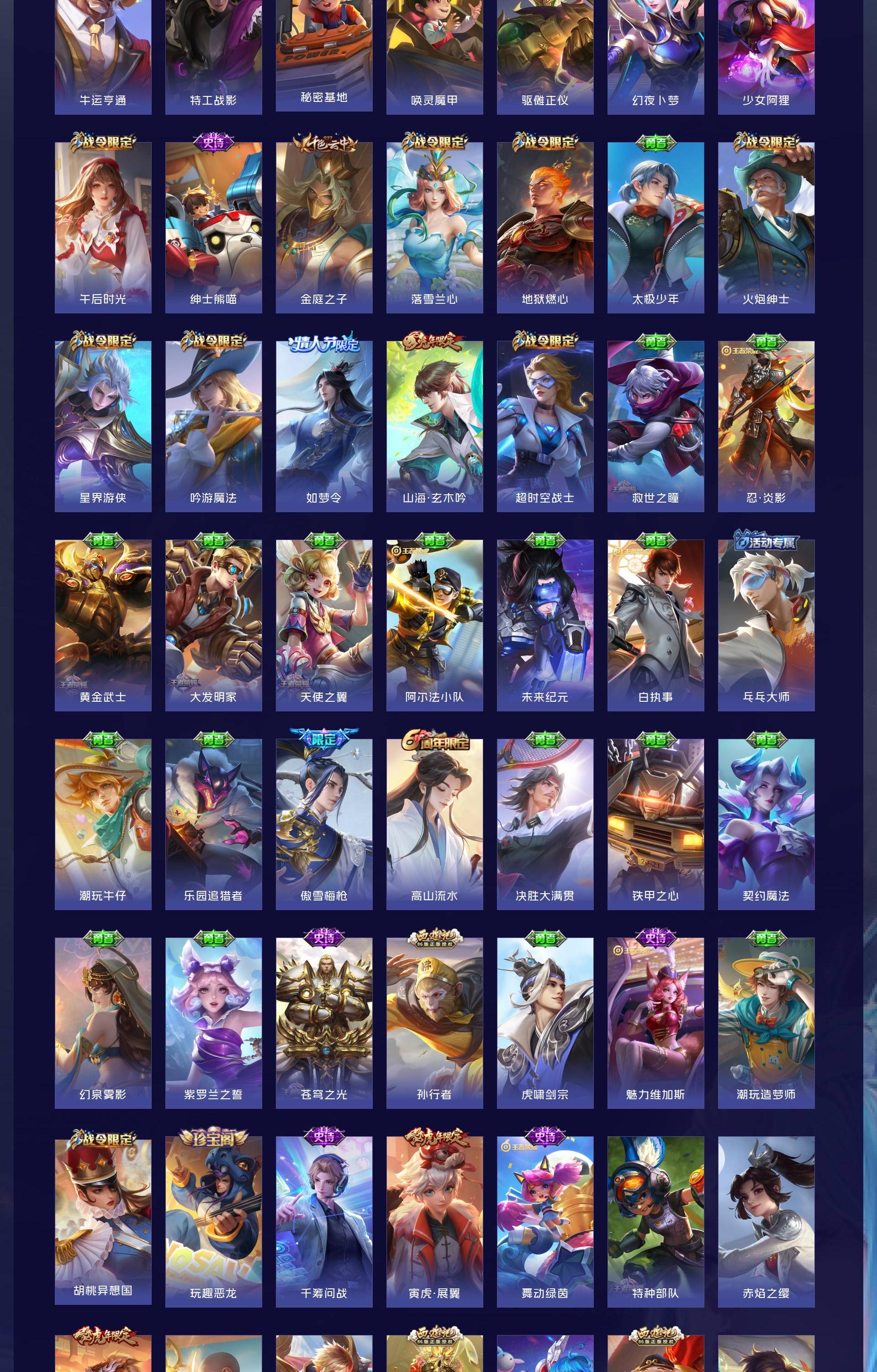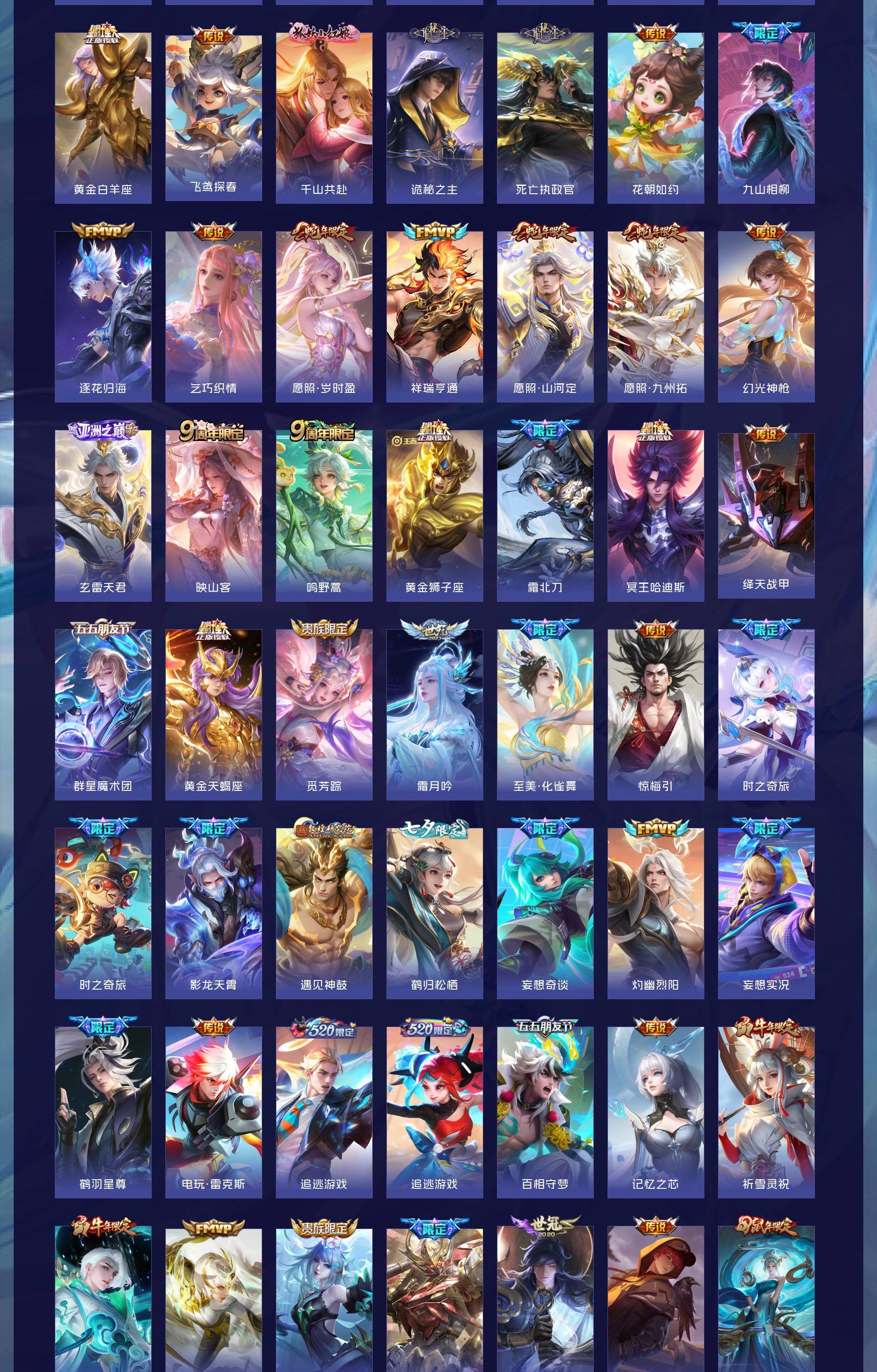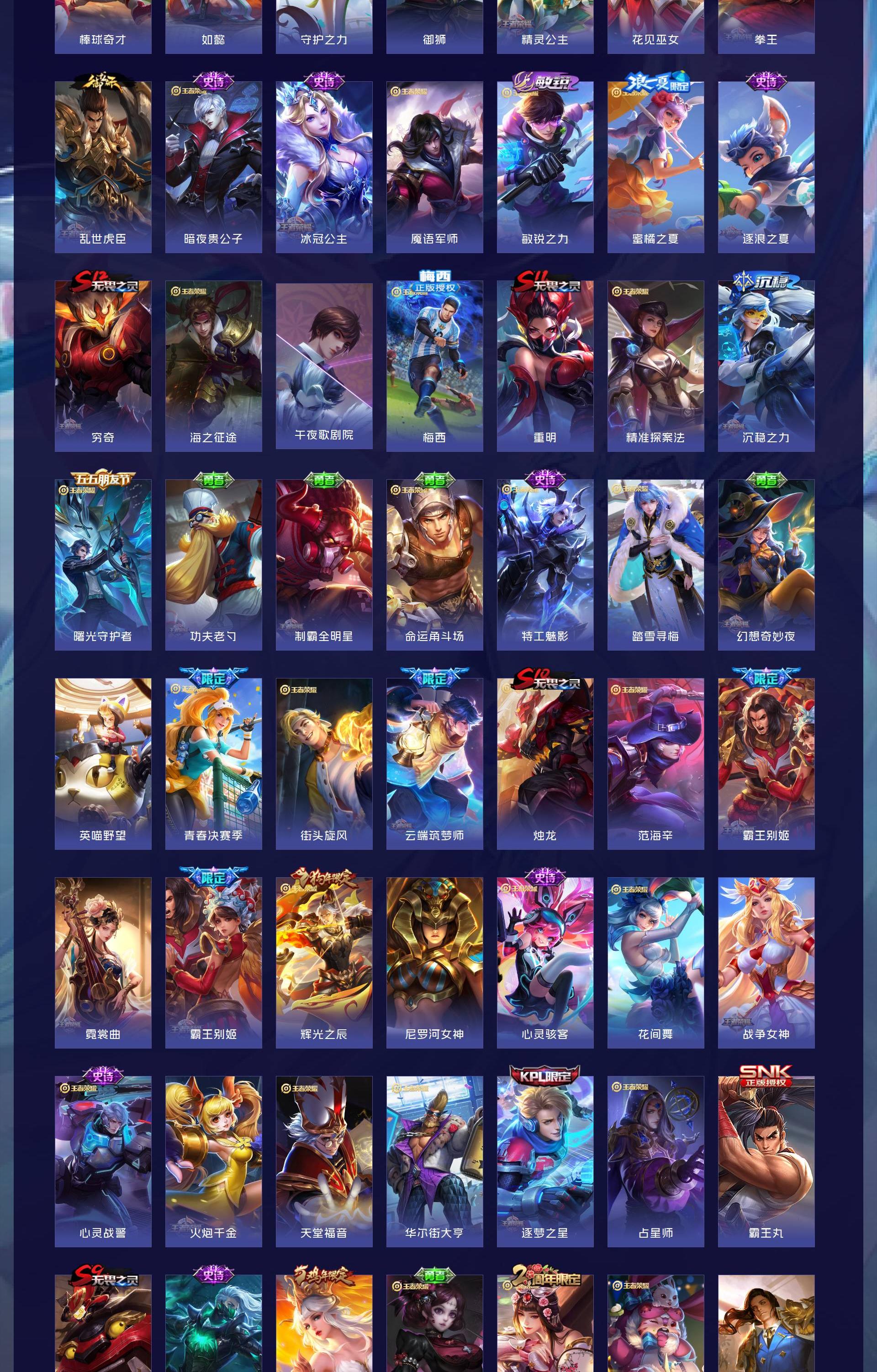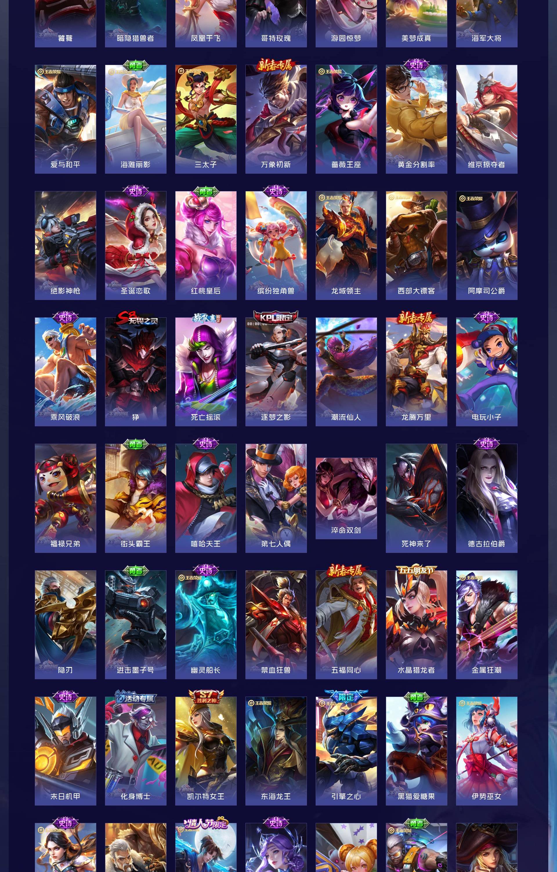 无双贵族 皮肤626 非凡王者 荣耀典藏6 无双皮肤5 珍品传说3 传说99 其他皮肤517