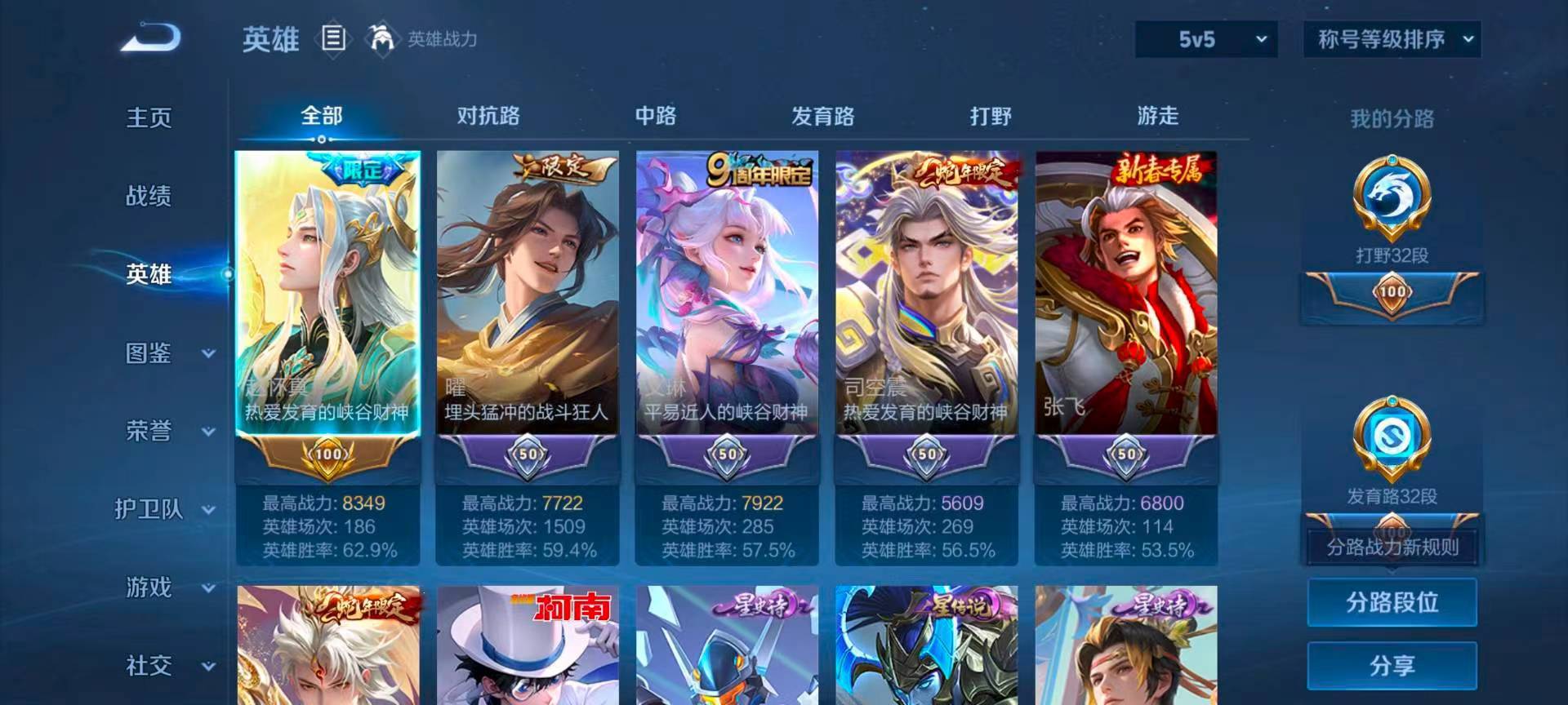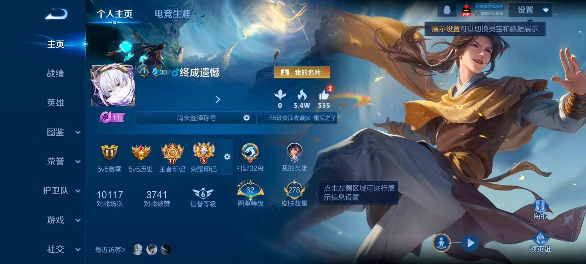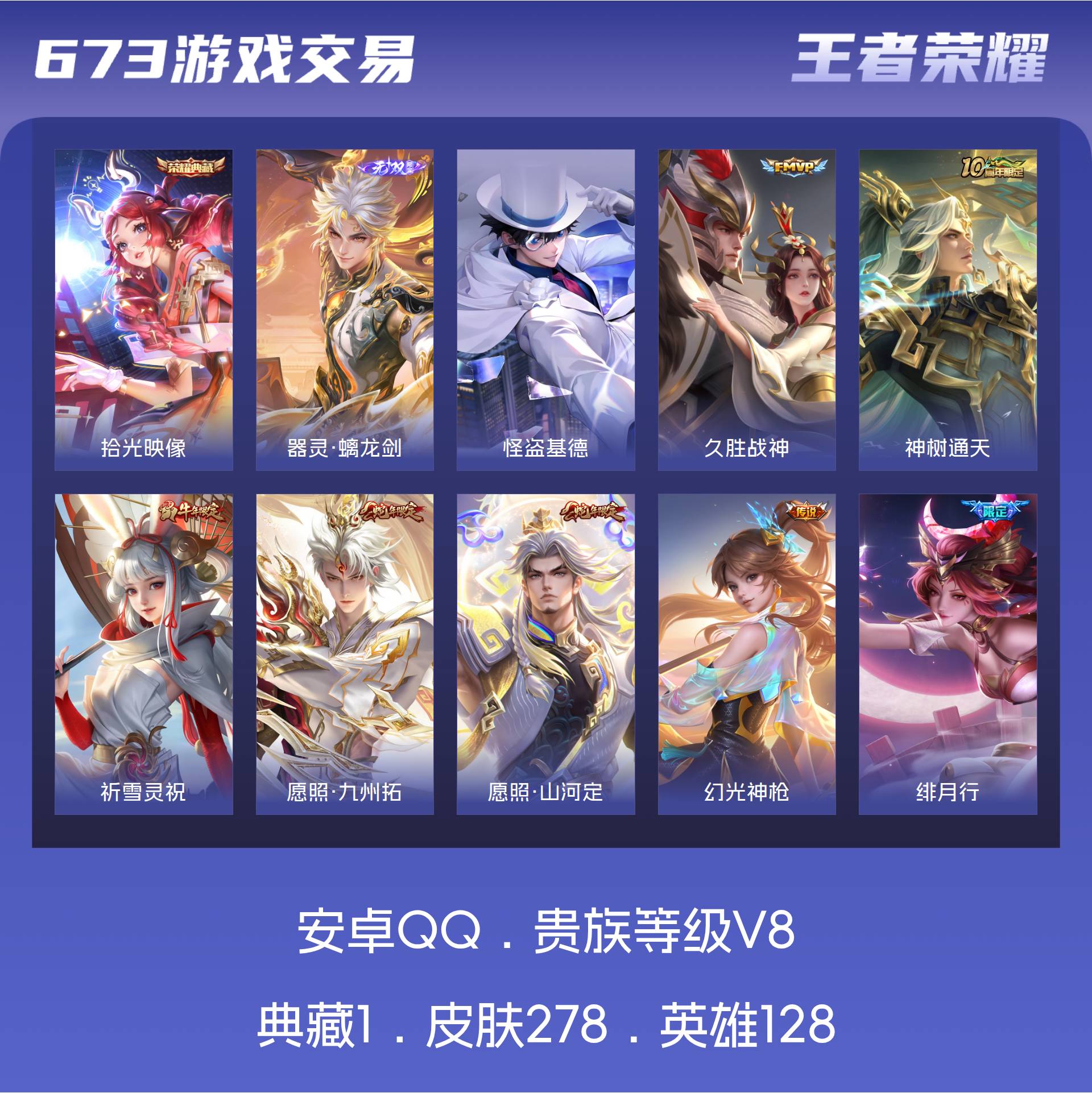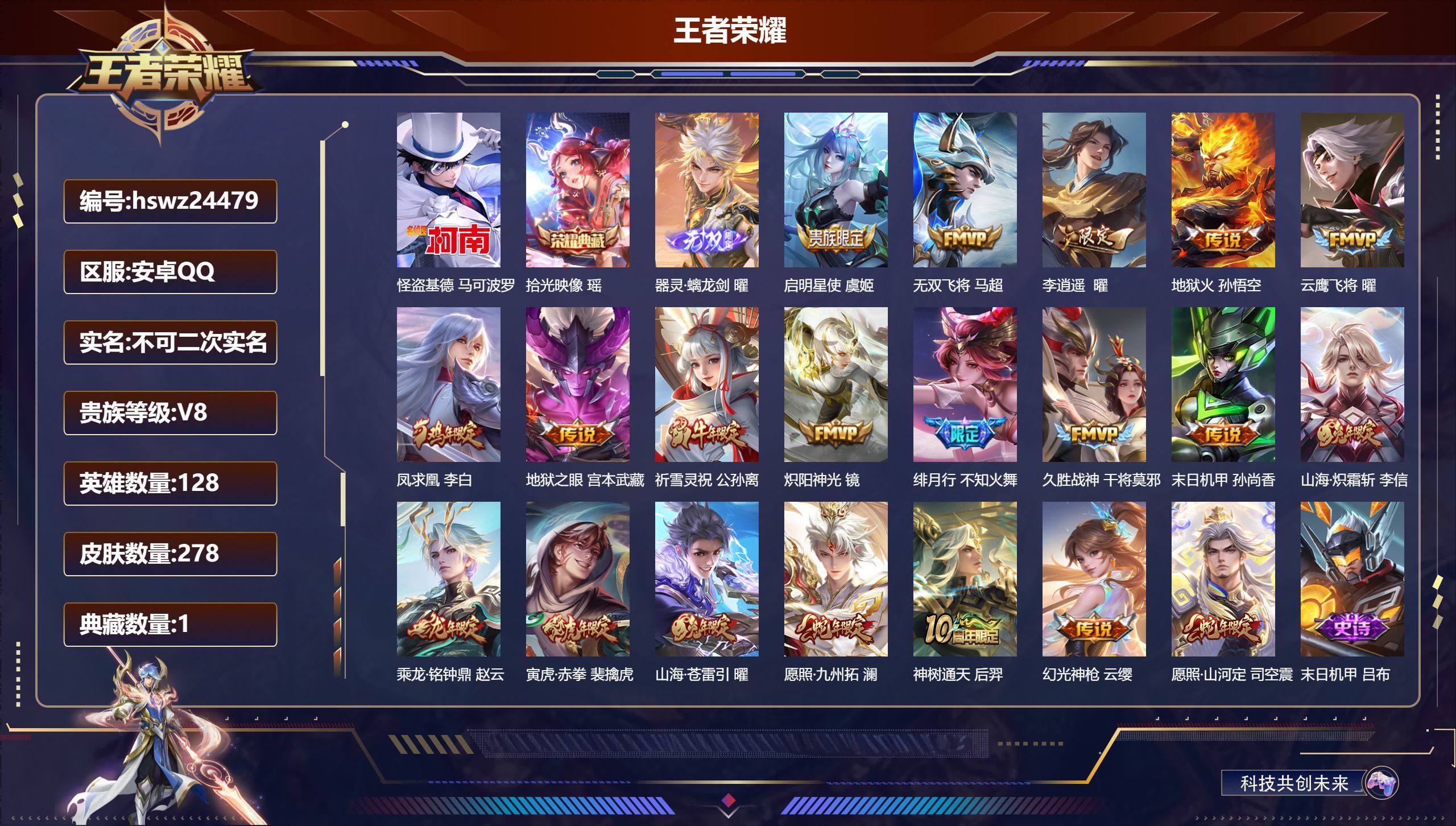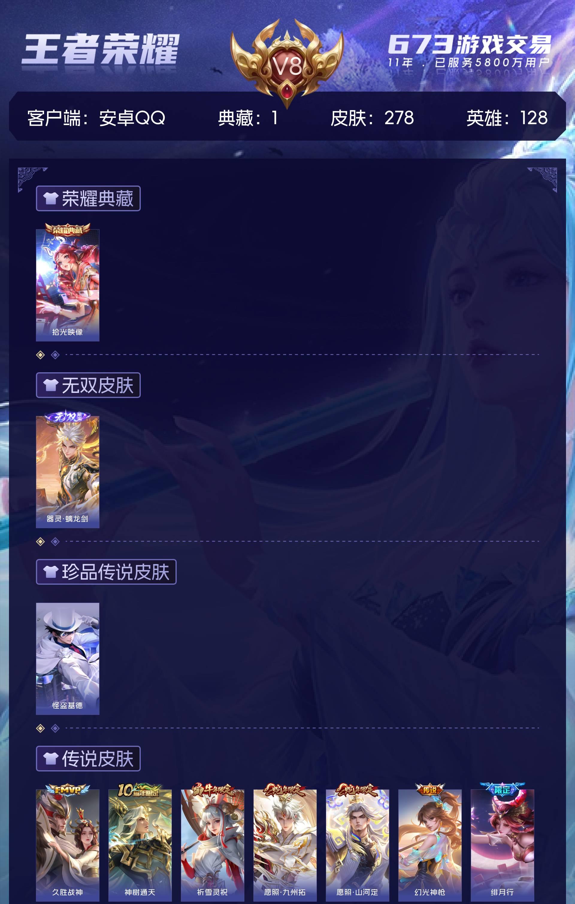 安卓QQ/至尊星耀/278皮肤/128英雄/1典藏/0珍品无双/1无双/1珍品传说/20传说/63史