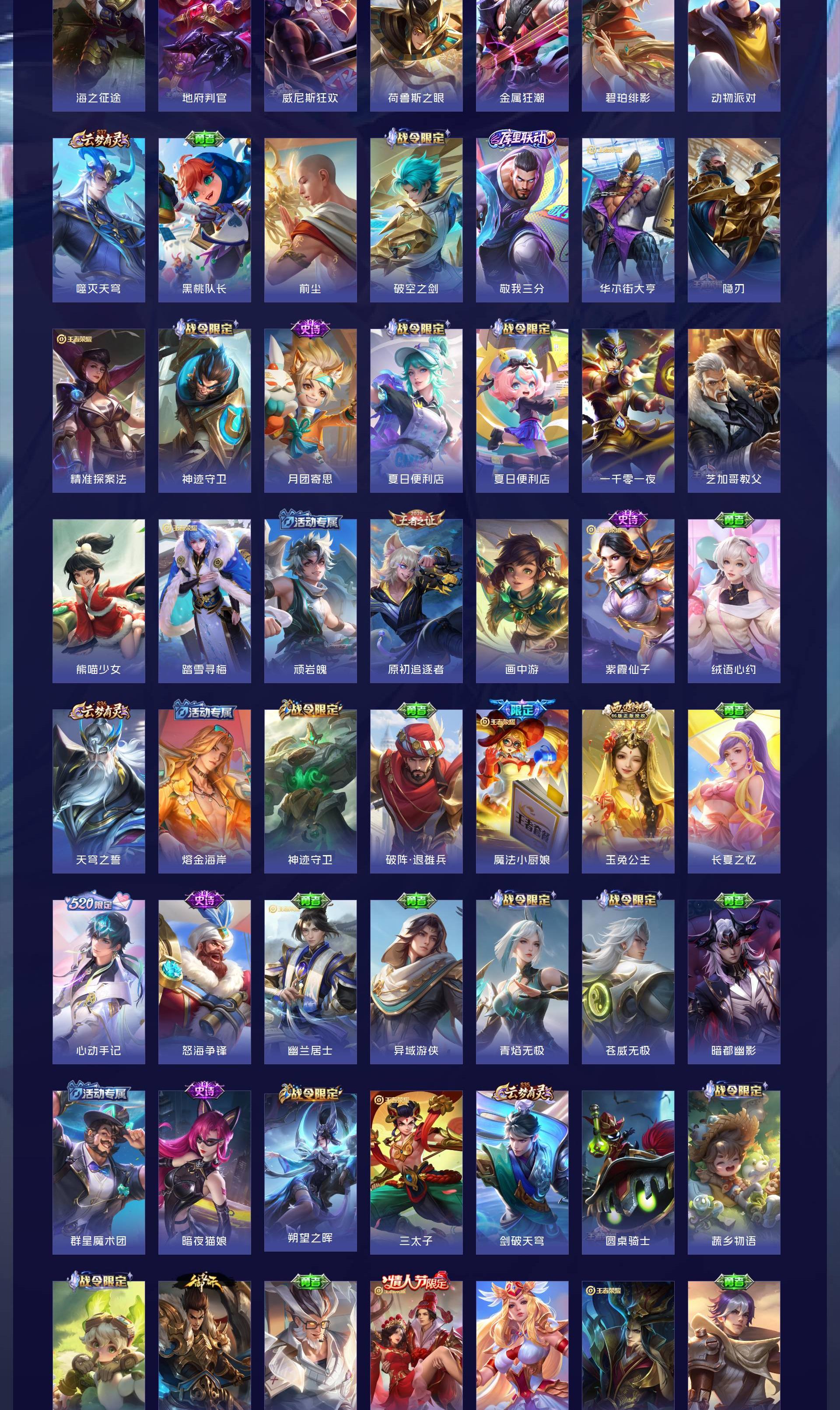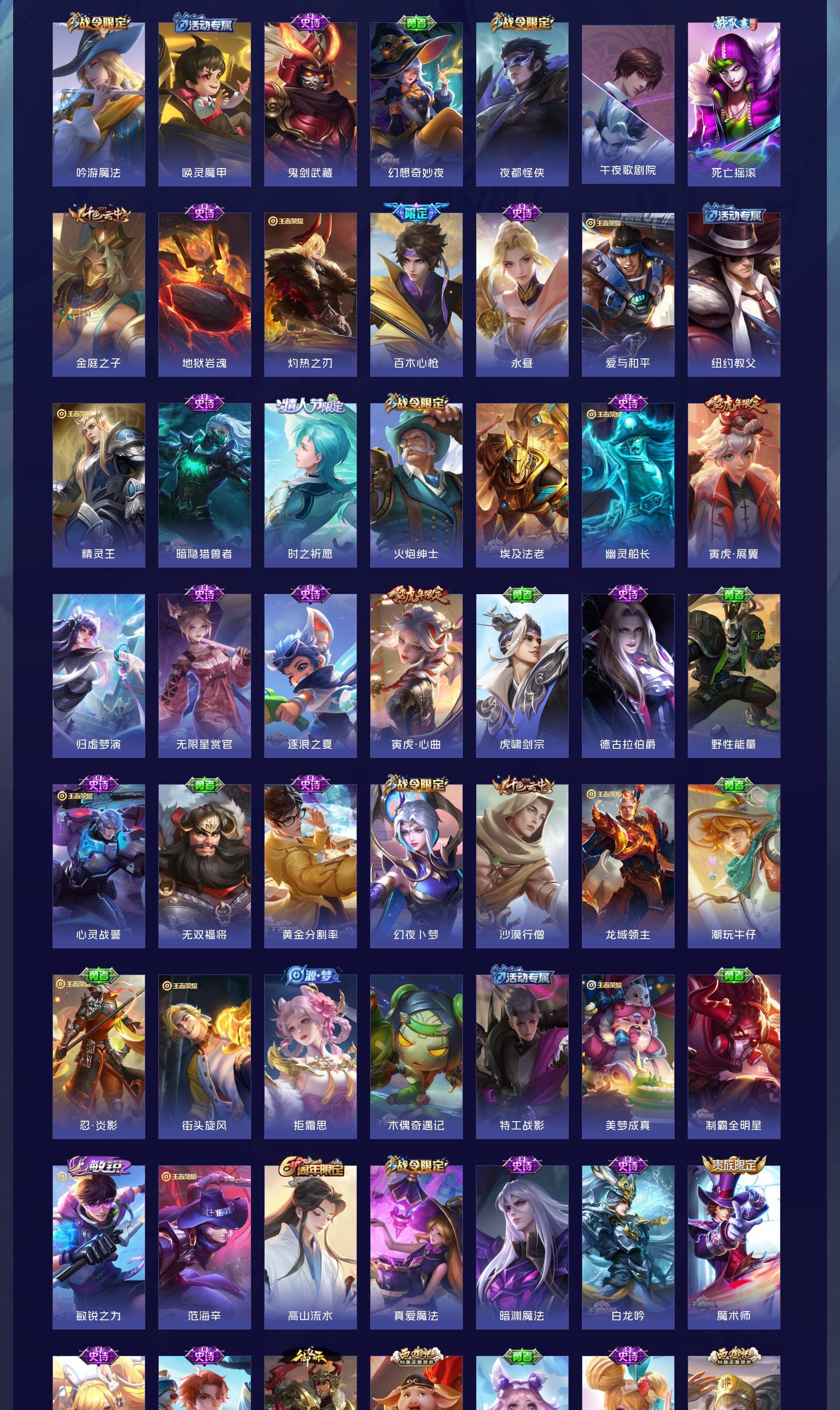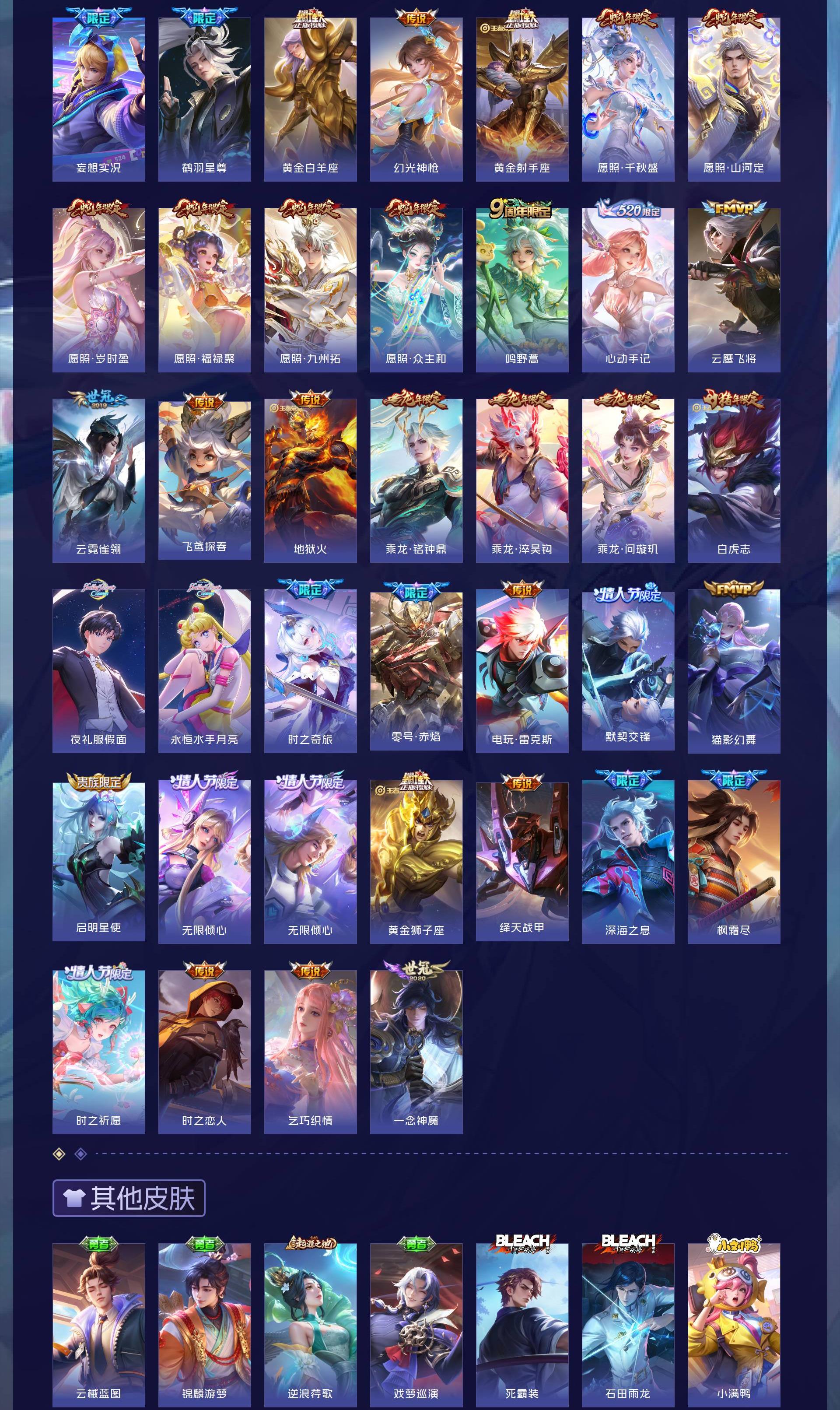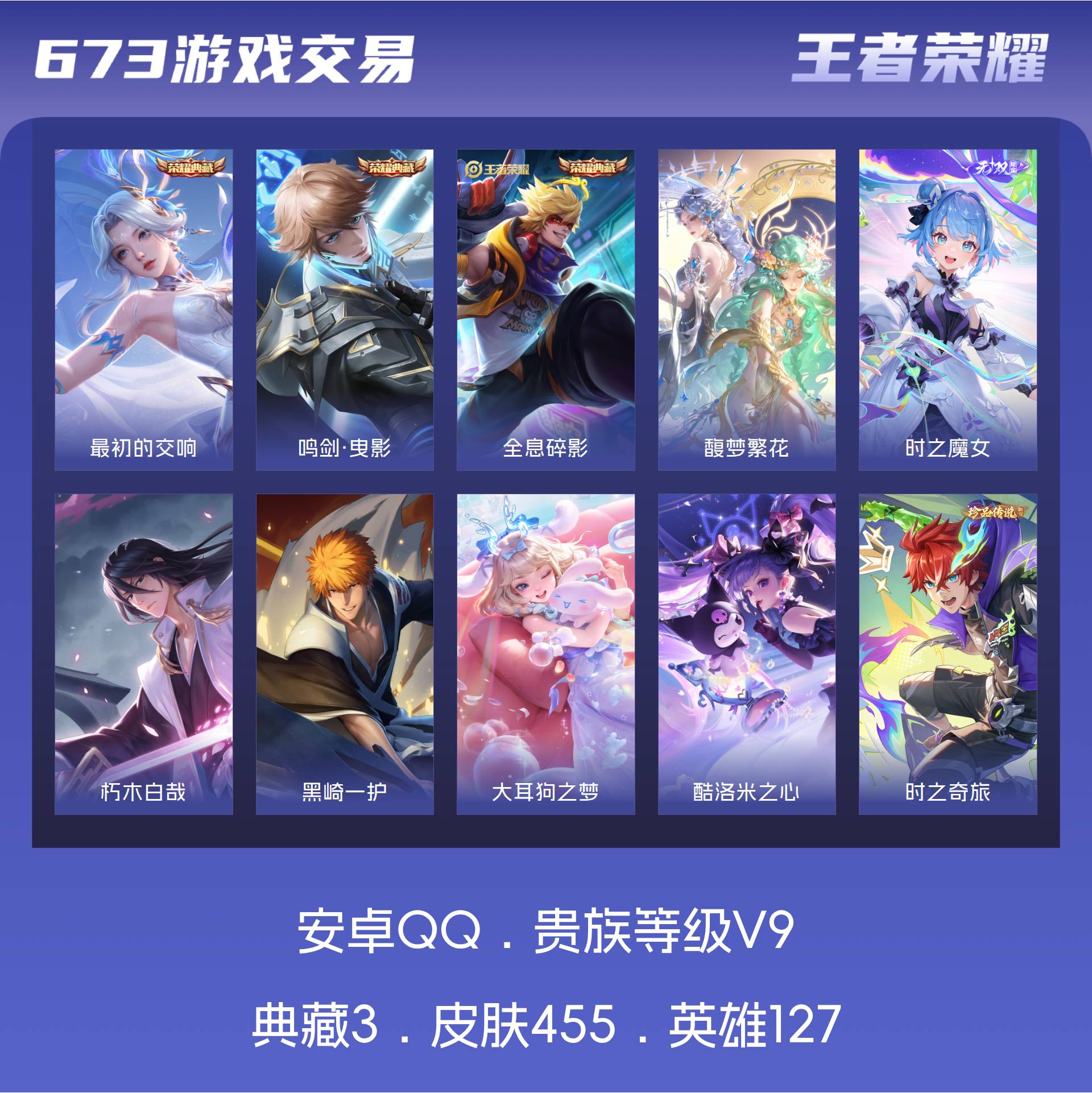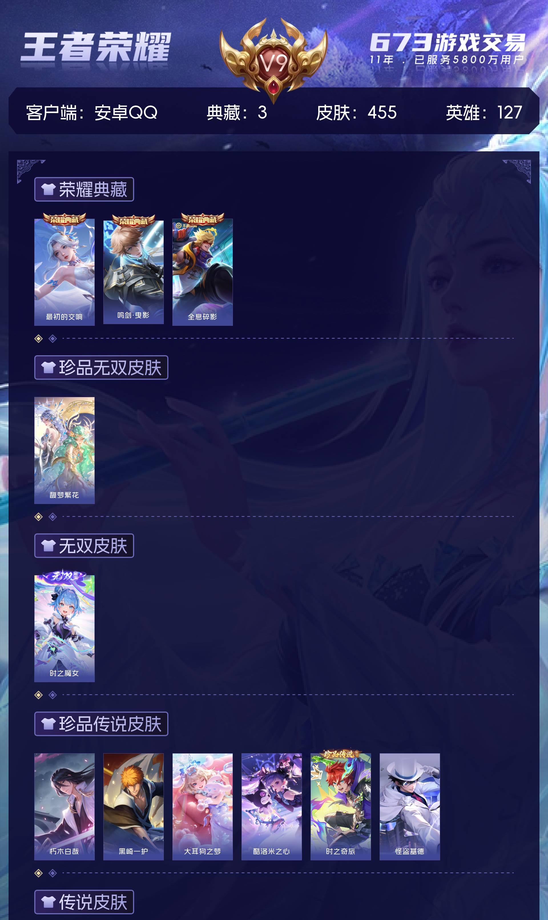 V9 皮肤455 英雄127 最强王者 荣耀典藏3 珍品无双1 无双皮肤1 珍品传说6 传说39 其他皮肤411