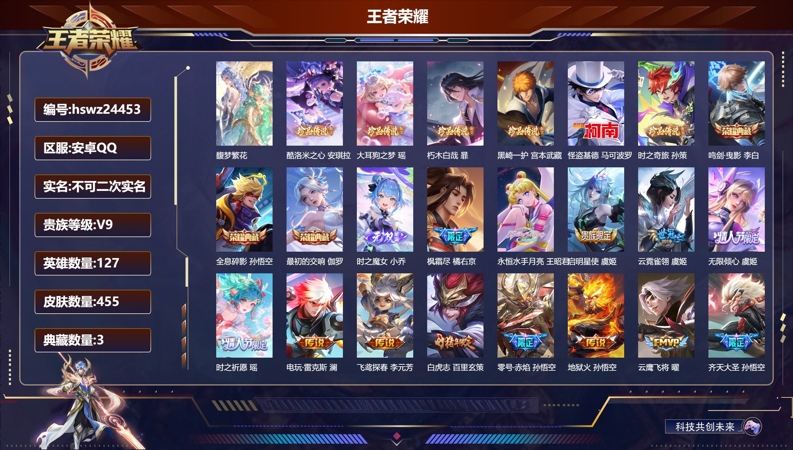 安卓QQ/最强王者/455皮肤/127英雄/3典藏/1珍品无双/1无双/6珍品传说/40传说/138