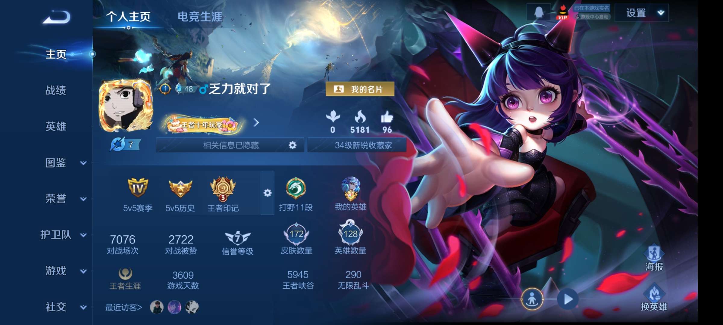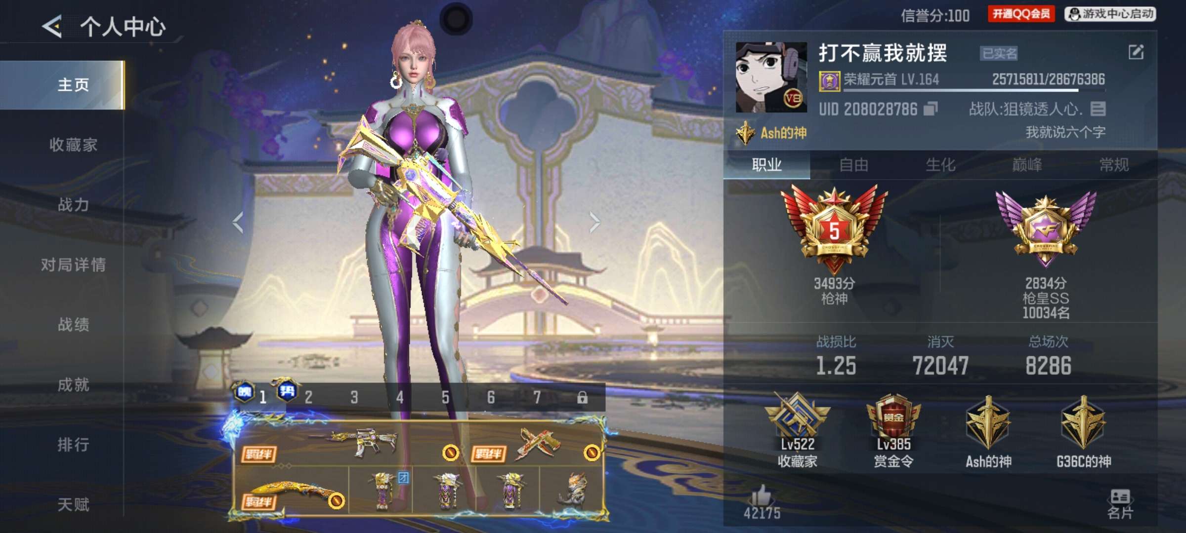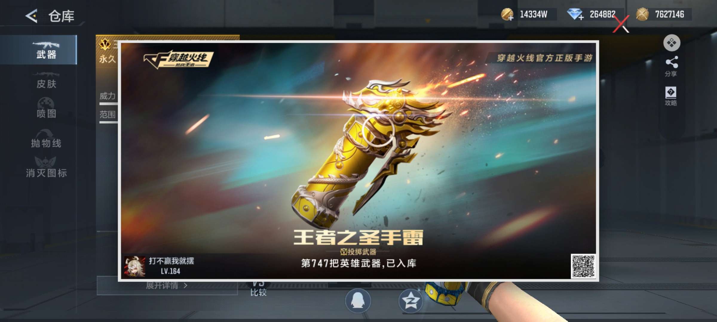 等级164, 信誉分100, 贵族等级8, 收藏点数52260, 王者武器数量49,英雄武器692