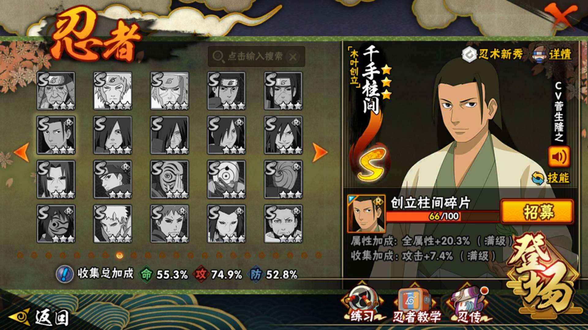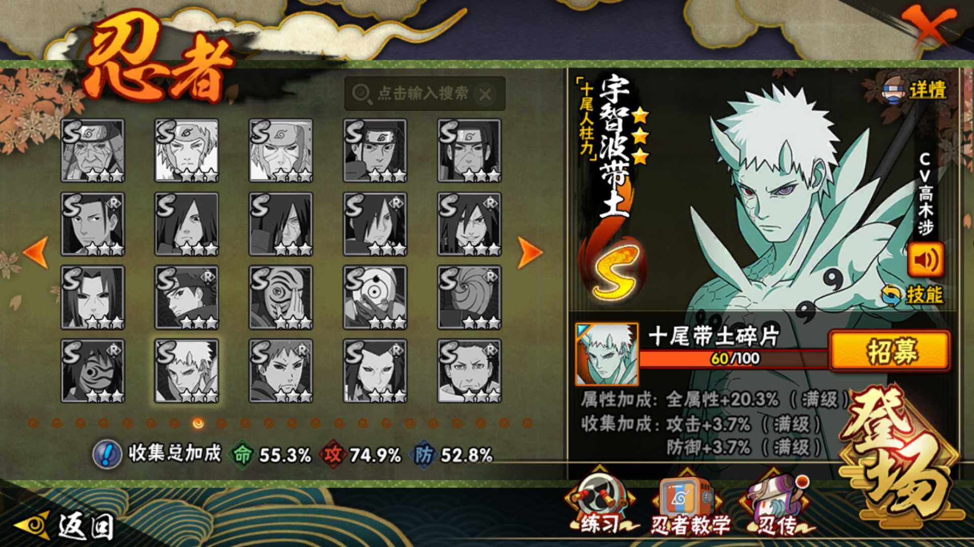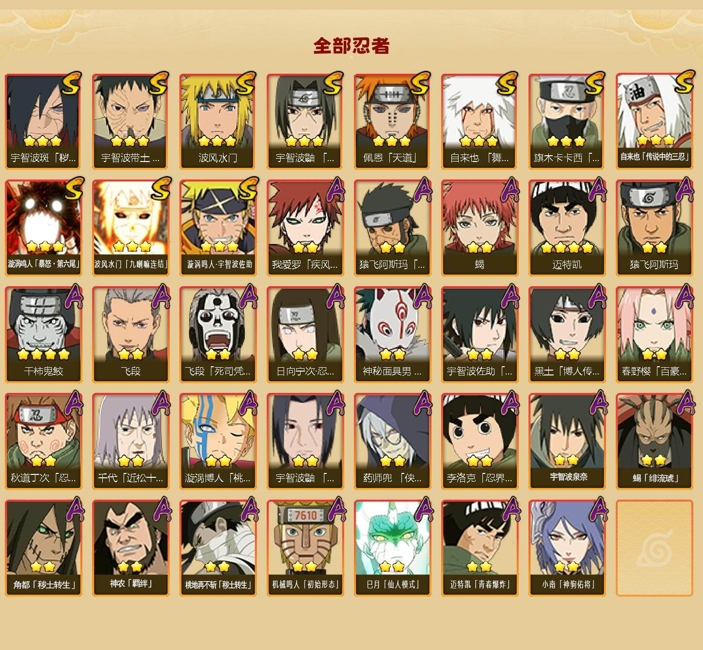 【S级忍者】:宇智波斑「秽土转生·解」(3星),宇智波带土「忍界大战」(3星),宇智波鼬「须佐能乎」(3星),旗木卡卡西「须佐能乎」(3星),自来也「舞之豪杰」(3星),自来也「传说中的三忍」(3星),波风水门(3星),佩恩「天道」(