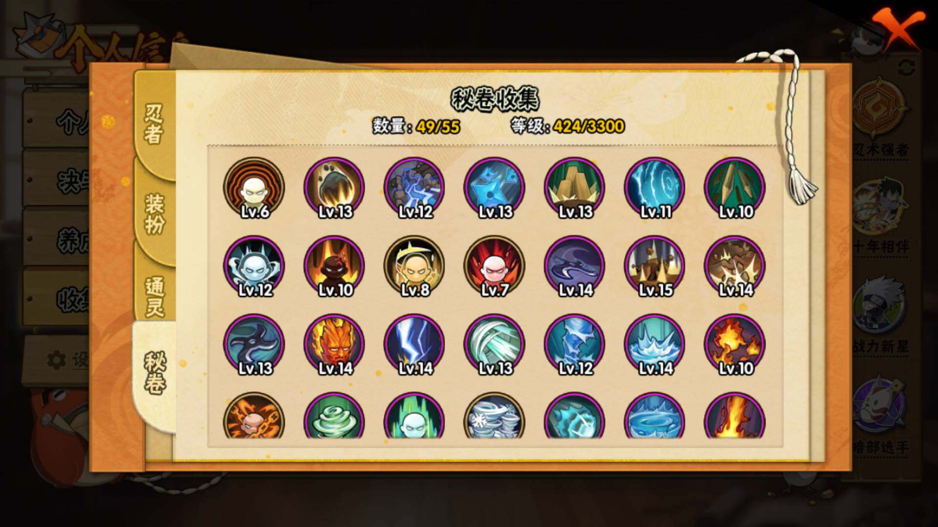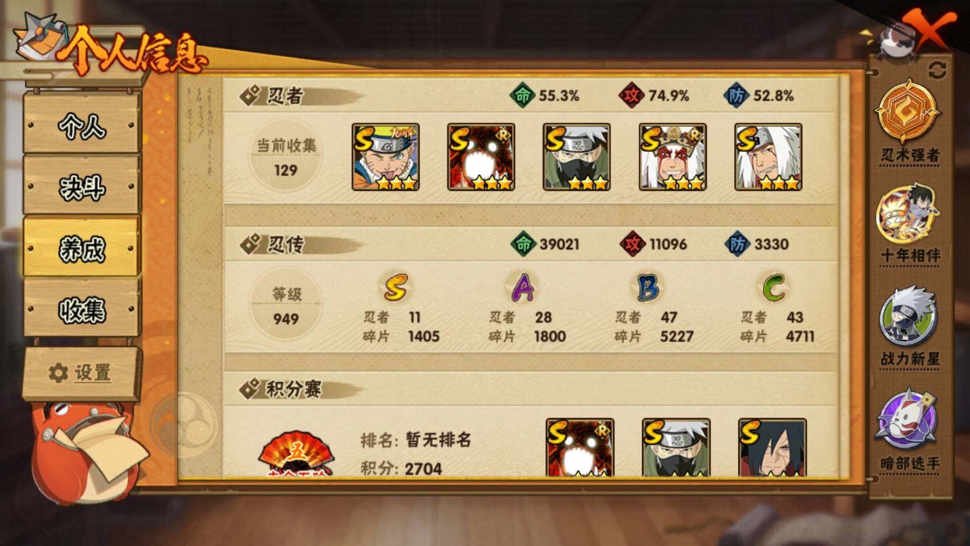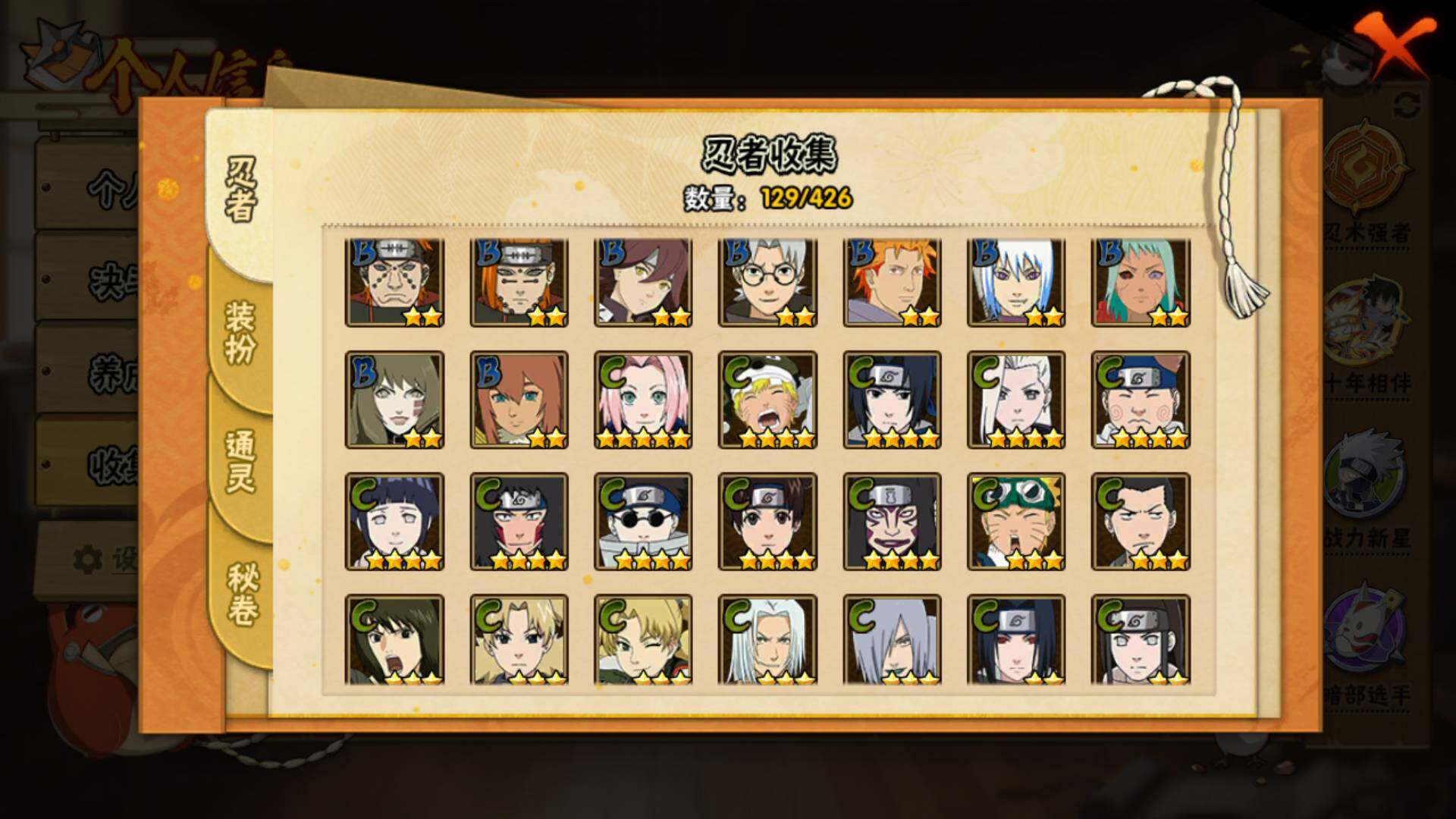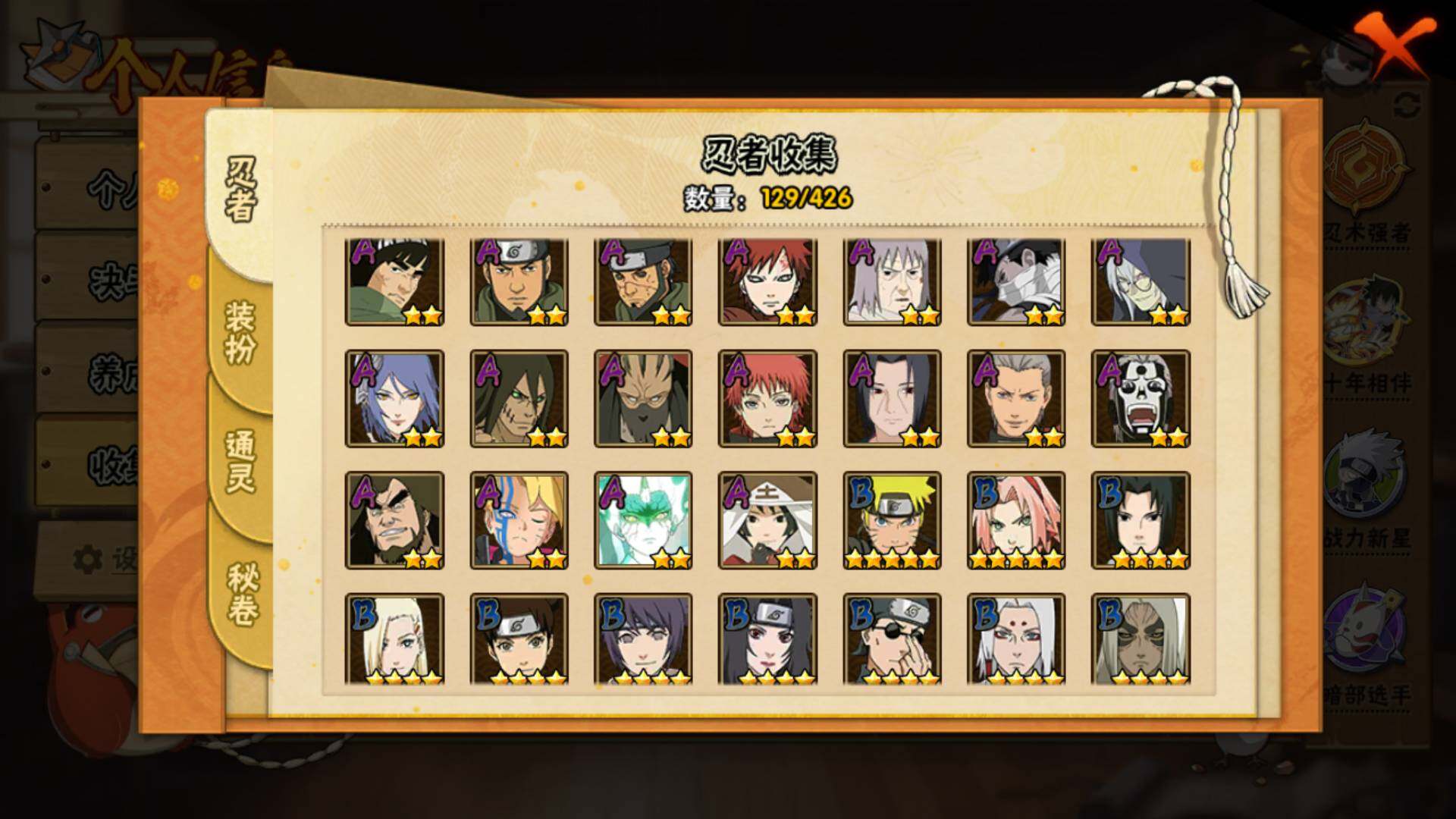 【S级忍者】:宇智波斑「秽土转生·解」(3星),宇智波带土「忍界大战」(3星),宇智波鼬「须佐能乎」(3星),旗木卡卡西「须佐能乎」(3星),自来也「舞之豪杰」(3星),自来也「传说中的三忍」(3星),波风水门(3星),佩恩「天道」(