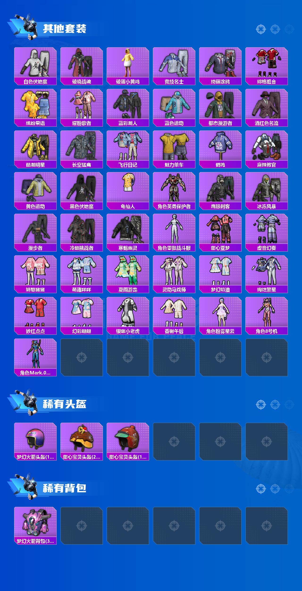 【粉色套装】:粉装-梦幻火箭,粉装-新星烈龙,粉装-蜜桃特工,粉装-蝶舞蔷薇,角色-初号机款机体服,粉装-圣光天使,角色-复仇