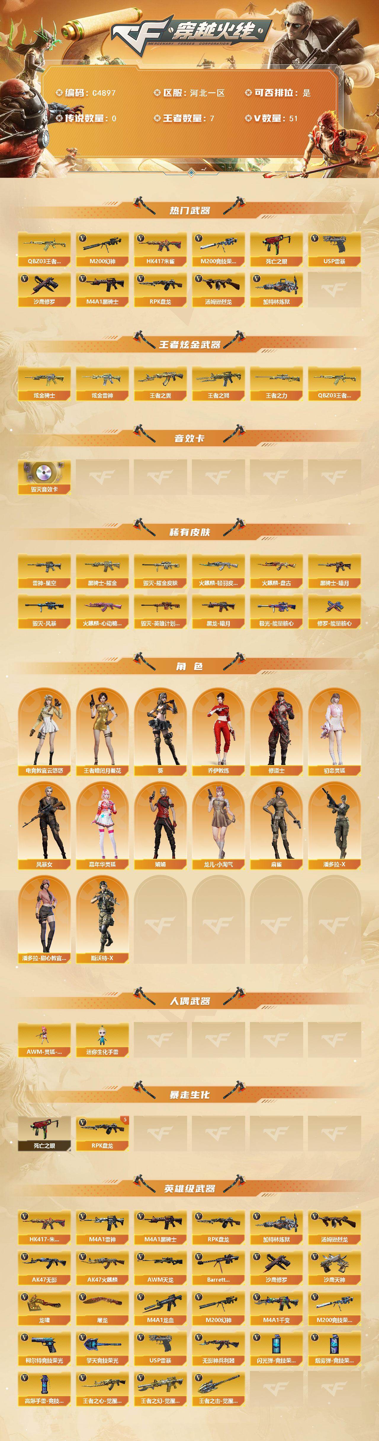 【C4897】河北一区-55V-7王者武器数-2炫金武器数【M200-幻神】【M200-竞技荣光】【QBZ-03-王者蔷薇】【HK417-朱雀】【USP-雷暴】【柯尔特-竞技荣光】【加特林-炼狱】【RPK-盘龙】【汤姆逊-烈龙】【死亡之眼】【电竞教官-云悠悠】【葵】【乔伊教练】【王者-瞳-闭月羞花】【修道士】【M4A1-雷神】【雷神-星空】【AK47-火麒麟】【火麒麟-轻羽皮肤】【火麒麟-盘古】【火麒麟-心动糖果】【M4A1-黑骑士】【黑骑士耀金皮肤】【黑骑士-暗月】【黑龙-暗月】【Barret