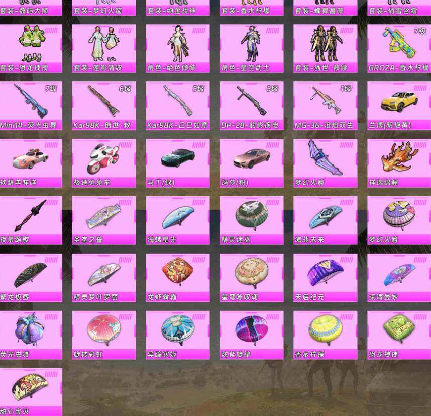 苹果 手Q-11粉装-8特效枪-5载具-3粉色飞行器-97549热力值-19王牌印记-205套装-300枪皮