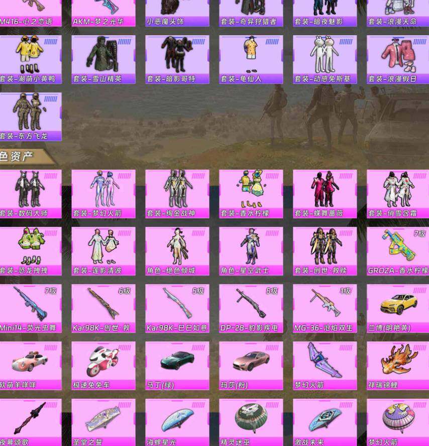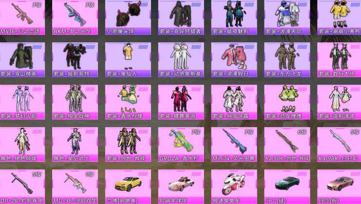 【粉色套装】:粉装-数码大师,粉装-梦幻火箭,粉装-绚金战神,粉装-香水柠檬,粉装-蝶舞蔷薇,粉装-俏雪含霜,粉装-恐龙拽拽,粉装-莲影清波,角色-绝色