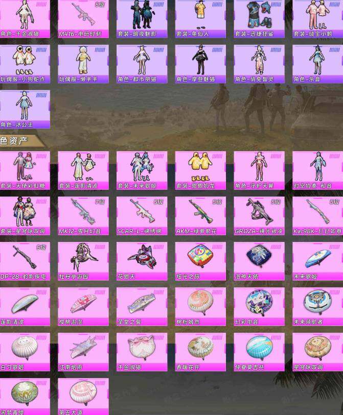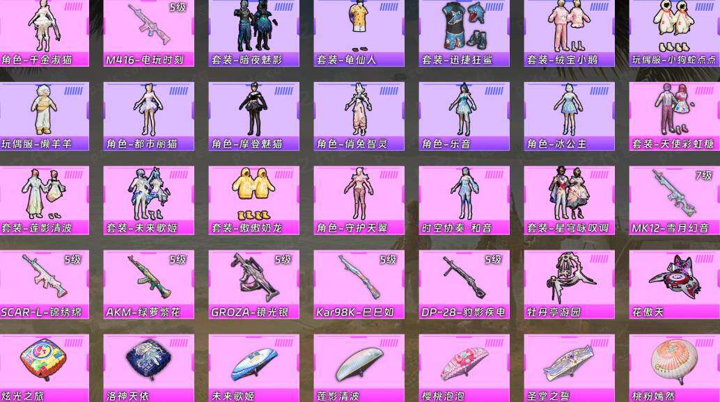 【粉色枪皮等级】:AKM-绿萝繁花(五级),SCAR-L-锦绣绵绵(五级),M416-电玩时刻(五级),GROZA-镜光银凌(五级)