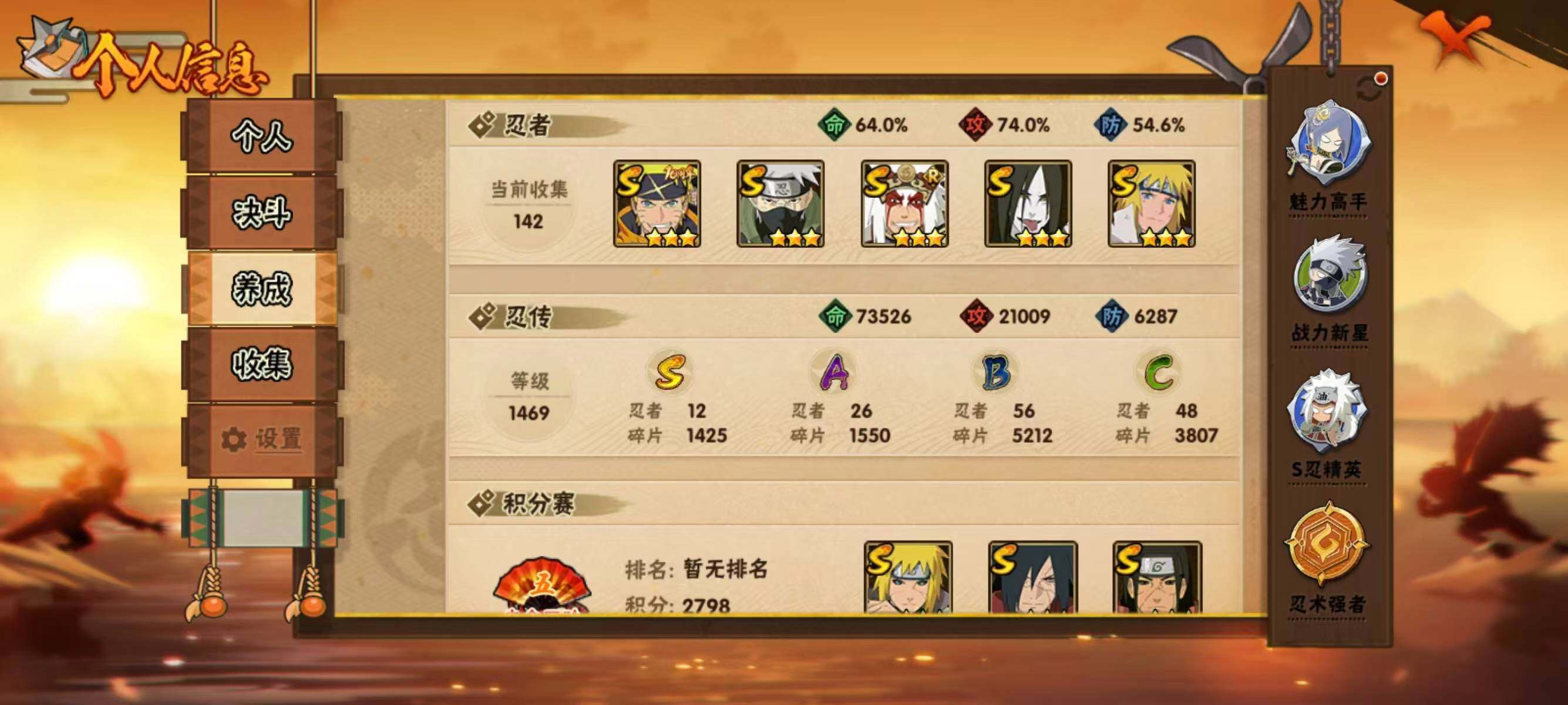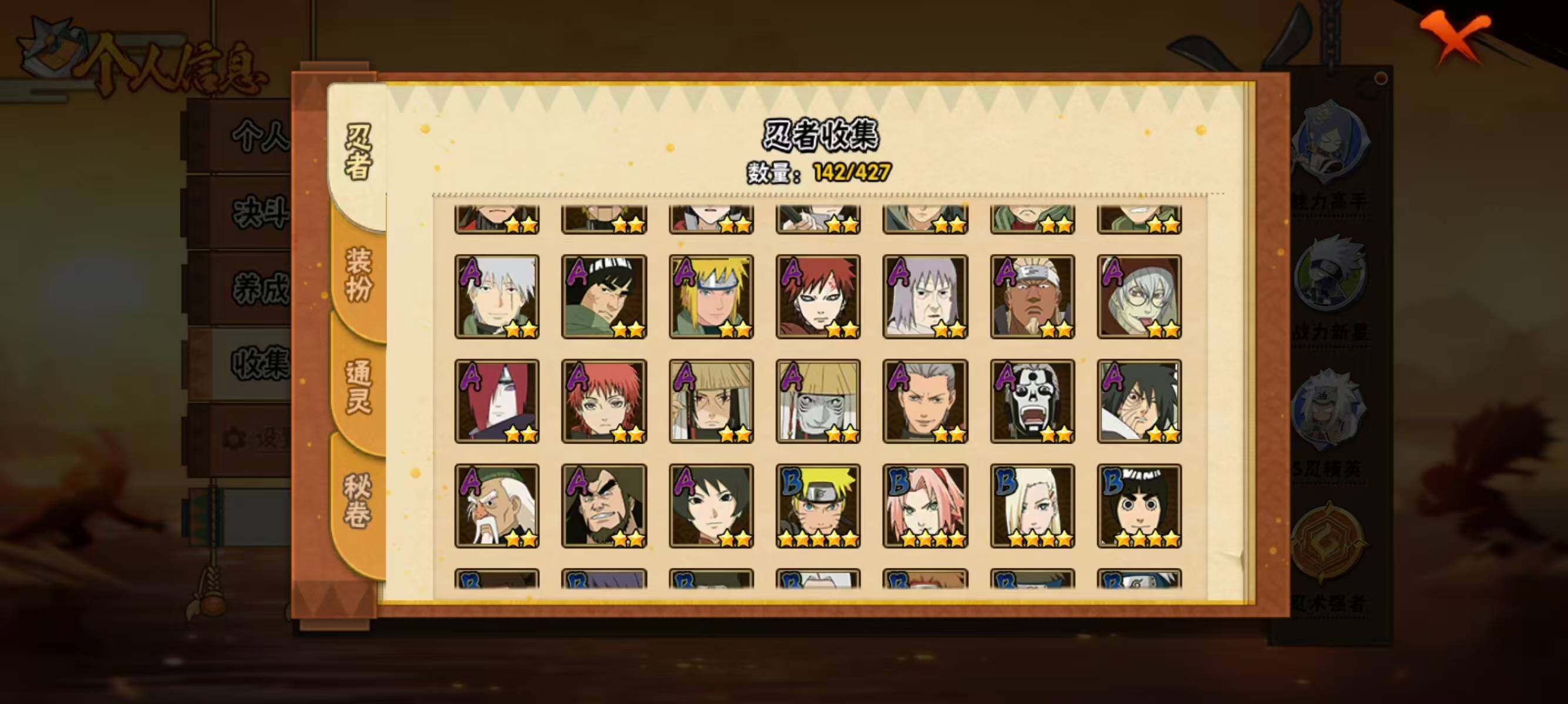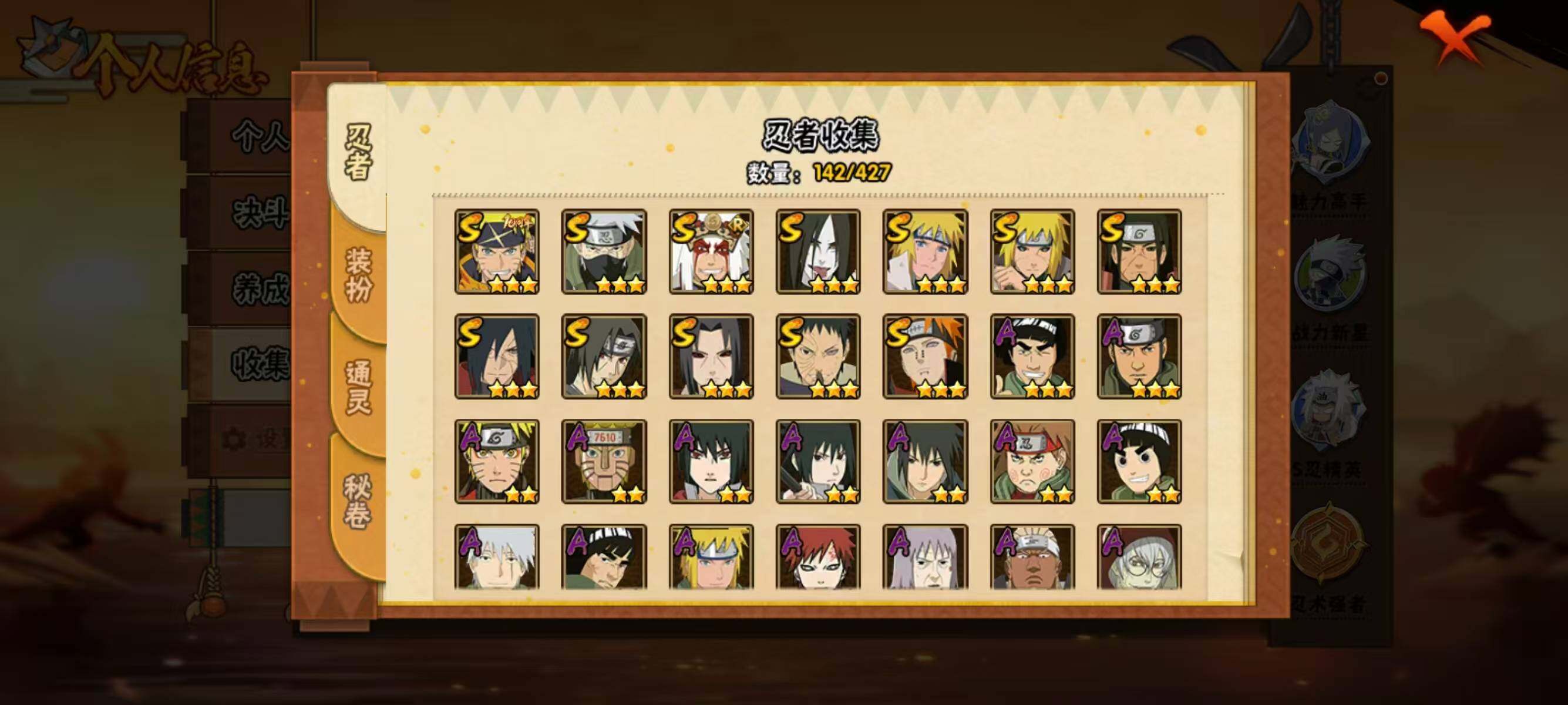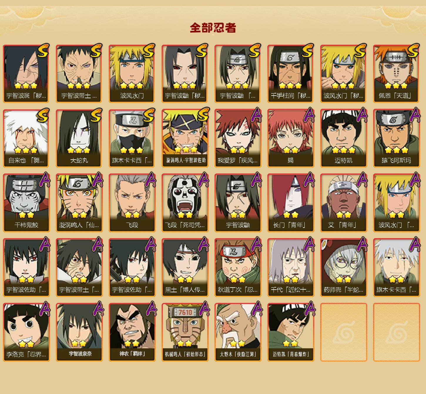 【S级忍者】:波风水门「秽土转生」(3星),千手柱间「秽土转生」(3星),宇智波鼬「秽土转生」(3星),宇智波斑「秽土转生·解」(3星),宇智波带土「忍界大战」(3星),宇智波鼬「须佐能乎」(3星),旗木卡卡西「须佐能乎」(3星),自来也「舞之豪杰」(3星),大蛇丸(3星),波风水门(3星),佩恩「天道」(3星),漩涡鸣人·宇智波佐助(3星)